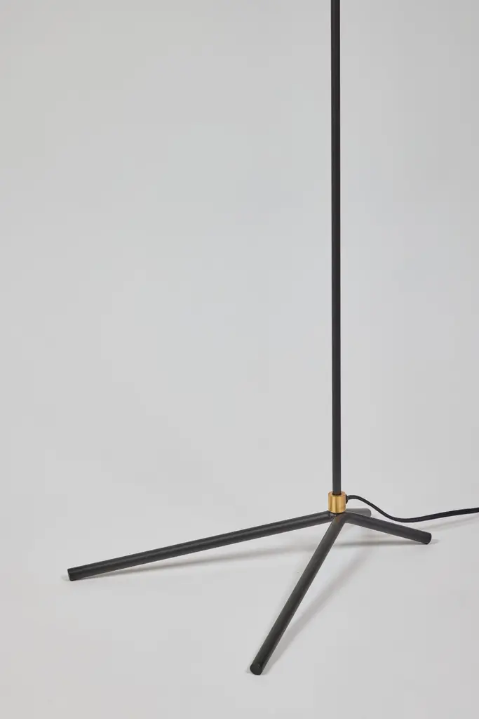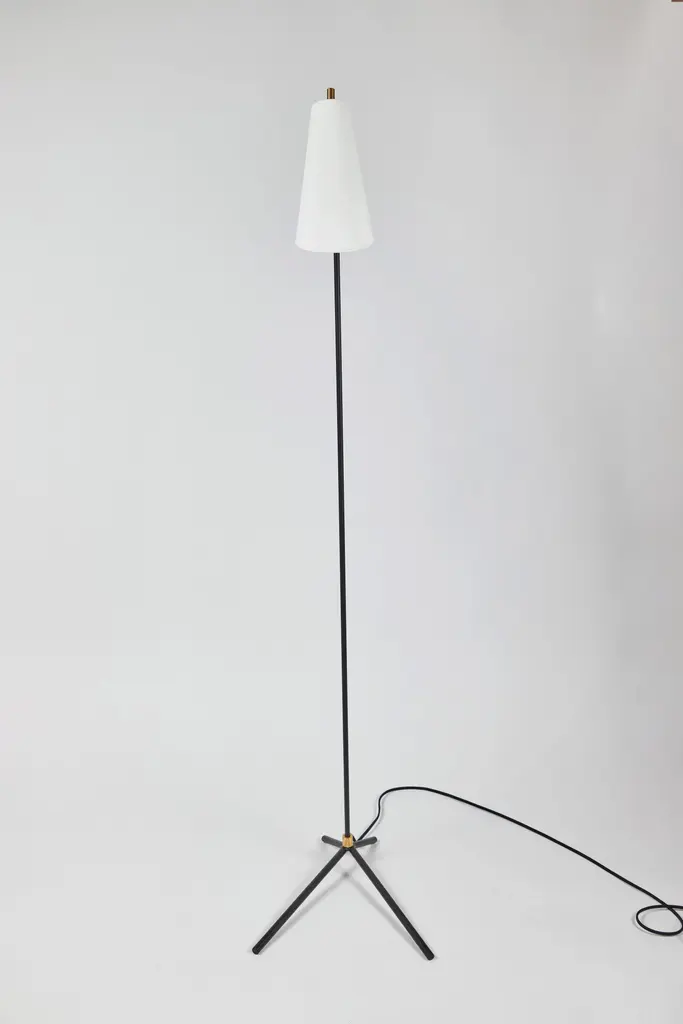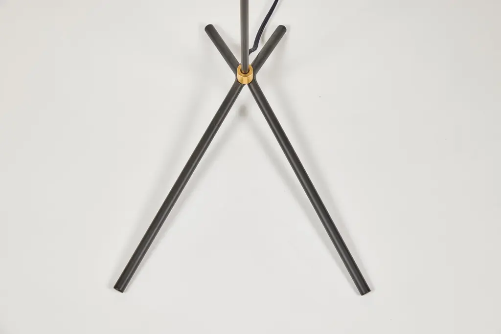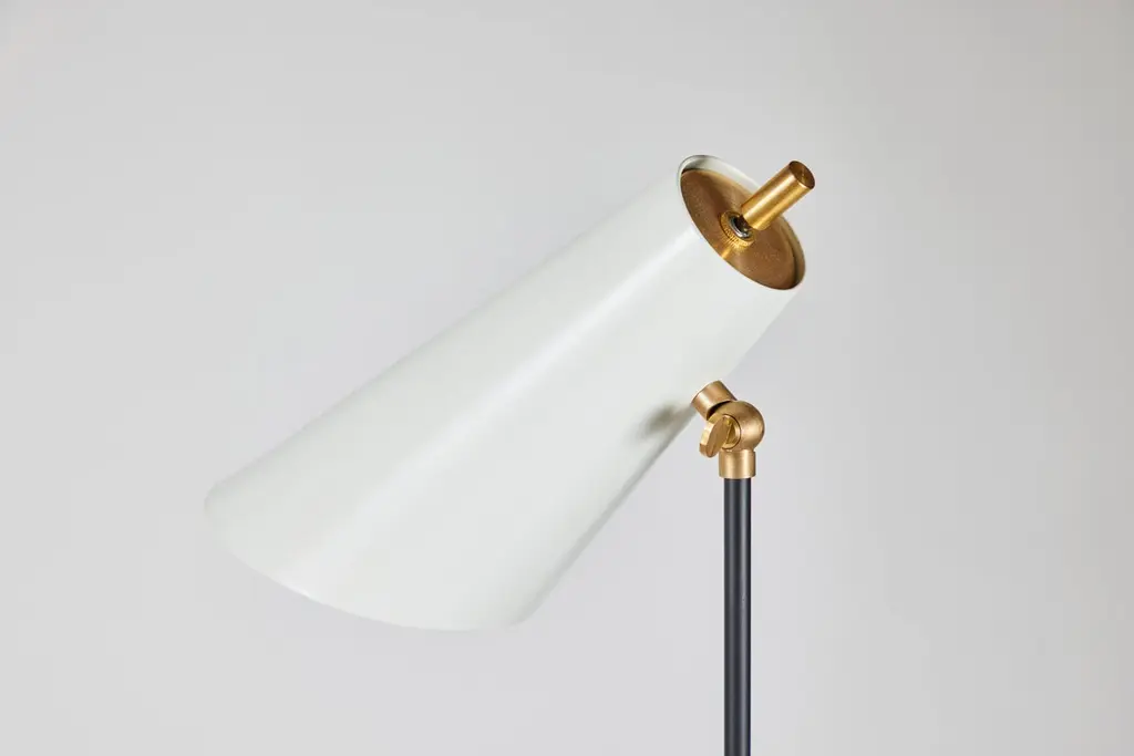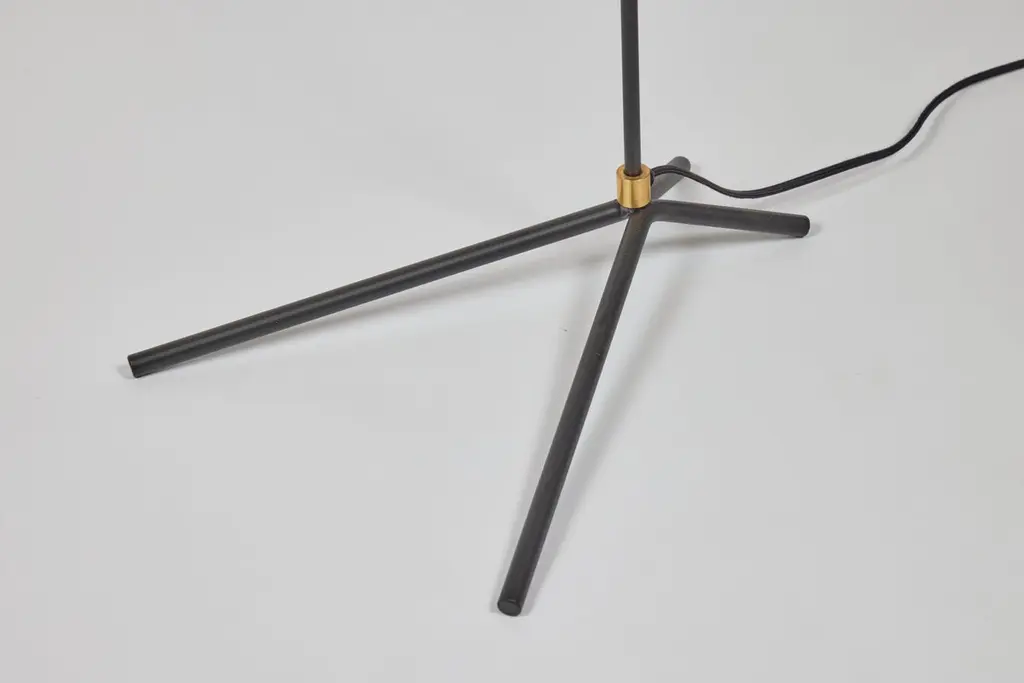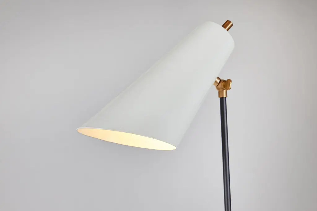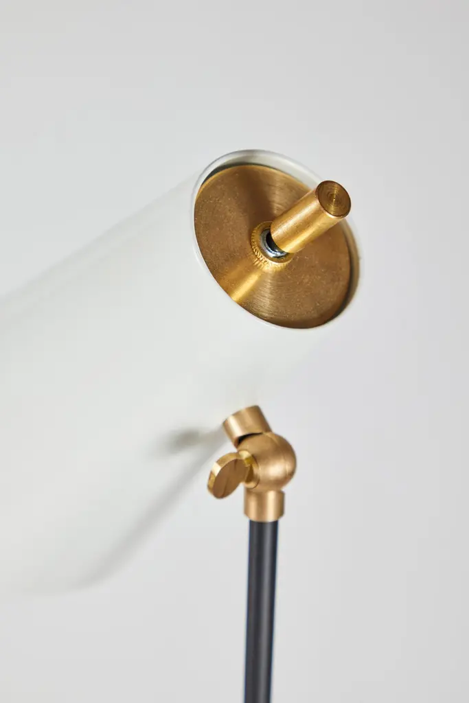 "Lucy" floor lamp in brass and metal by Alvaro Benitez. Hand-fabricated by Los Angeles based designer and lighting professional Alvaro Benitez, this UL listed and highly refined floor lamp is reminiscent of the iconic mid-century Italian designs of Arteluce and Stilnovo. Executed in black and white metal, shade can be rotated left, right, up and down for a flexible variety of lighting options.Price is per item. 1x lamp in stock and available for immediate shipment. Available to order in unlimited quantities with 2-3 week lead time. Out of stock lead time can add 6 weeks or more. Inventory and lead time is subject to change without notice. Please contact us for current lead time prior to placing time-sensitive orders. Accommodates a single medium base E26 maximum 60 watt equivalent LED bulb (bulb not included). UL listed.Please note that the brass parts of this lamp are fabricated in unlacquered brass. They will naturally patinate over time and can already show varied signs of patination through exposure to the elements, handling, etc.Made to order. All sales are final.