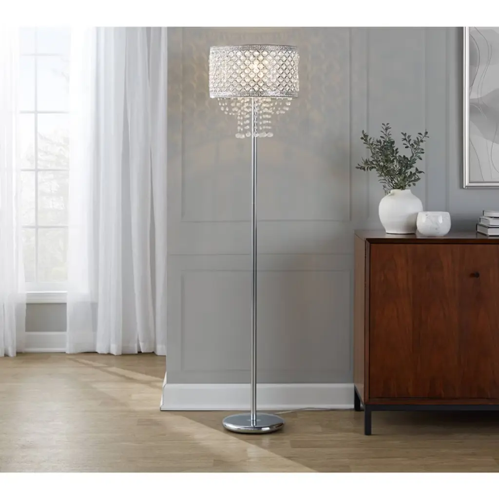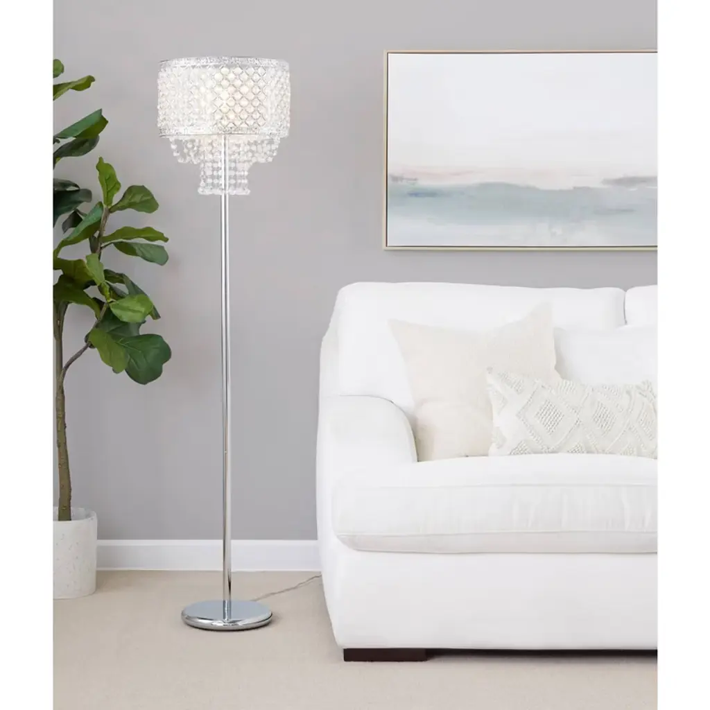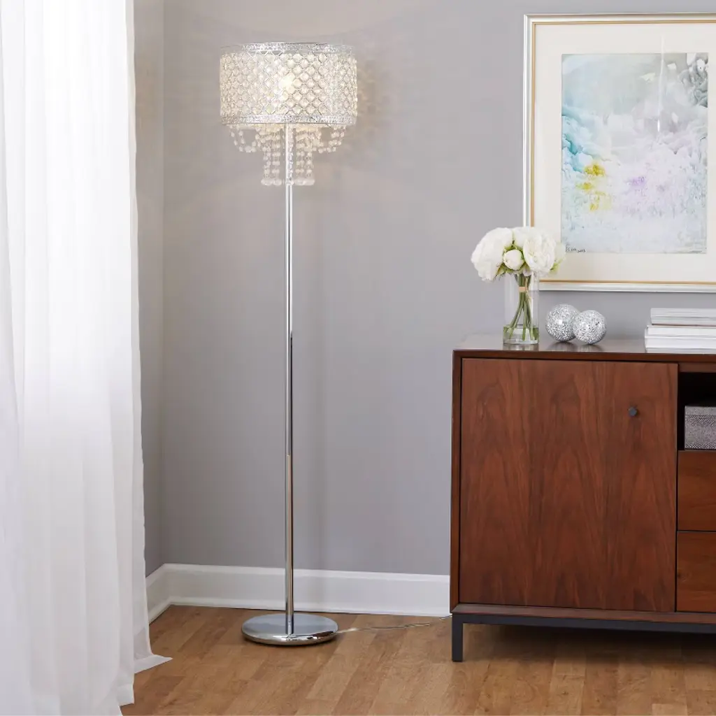 Add glamour and glitz to your life with the Droplets Floor Lamp from Grandview Gallery by LumiSource. A chic addition to modern aesthetics, it showcases a gorgeous metal shade with crystals that have been individually threaded into the shade and crystal beads that hang off the bottom. When lit, all of the genuine crystals cast a radiant display of cascading patterns onto surrounding walls.