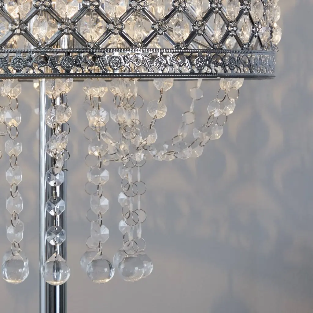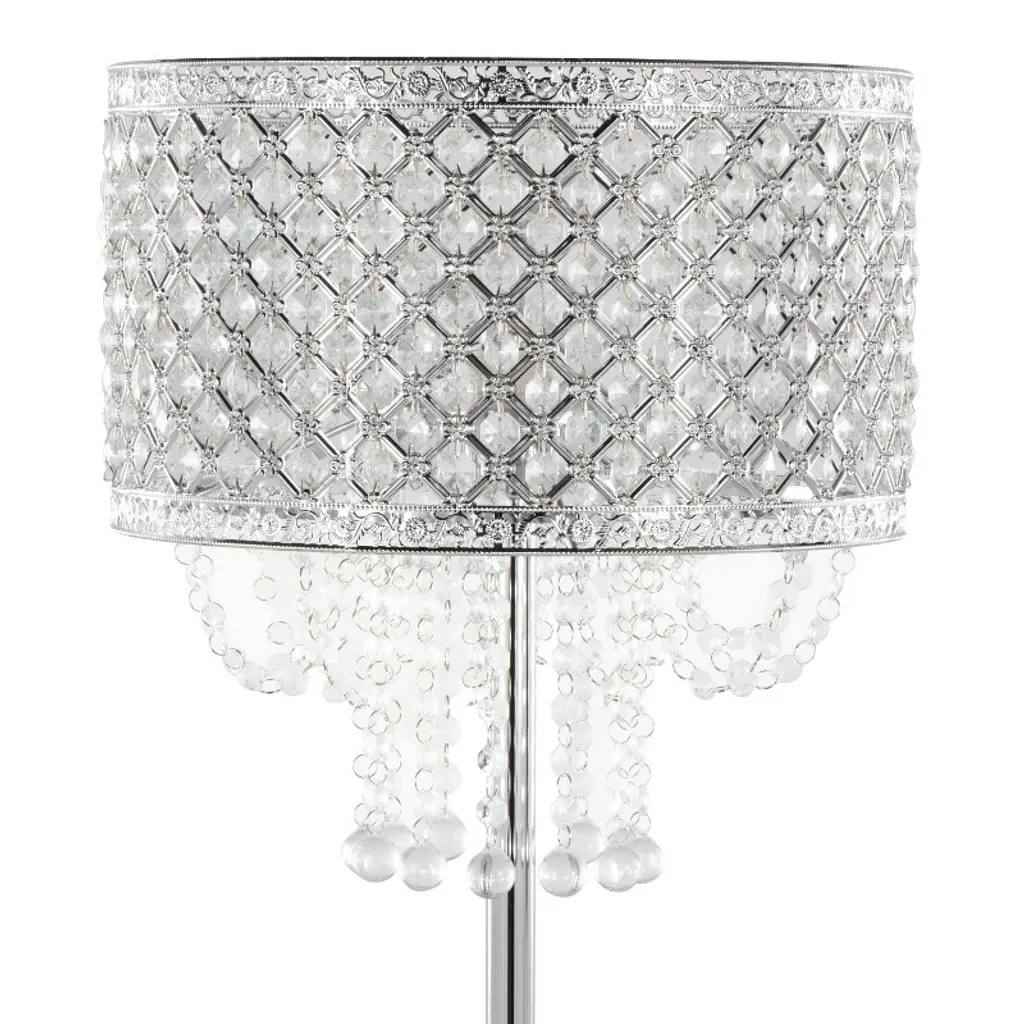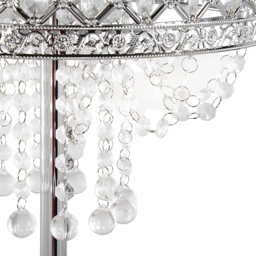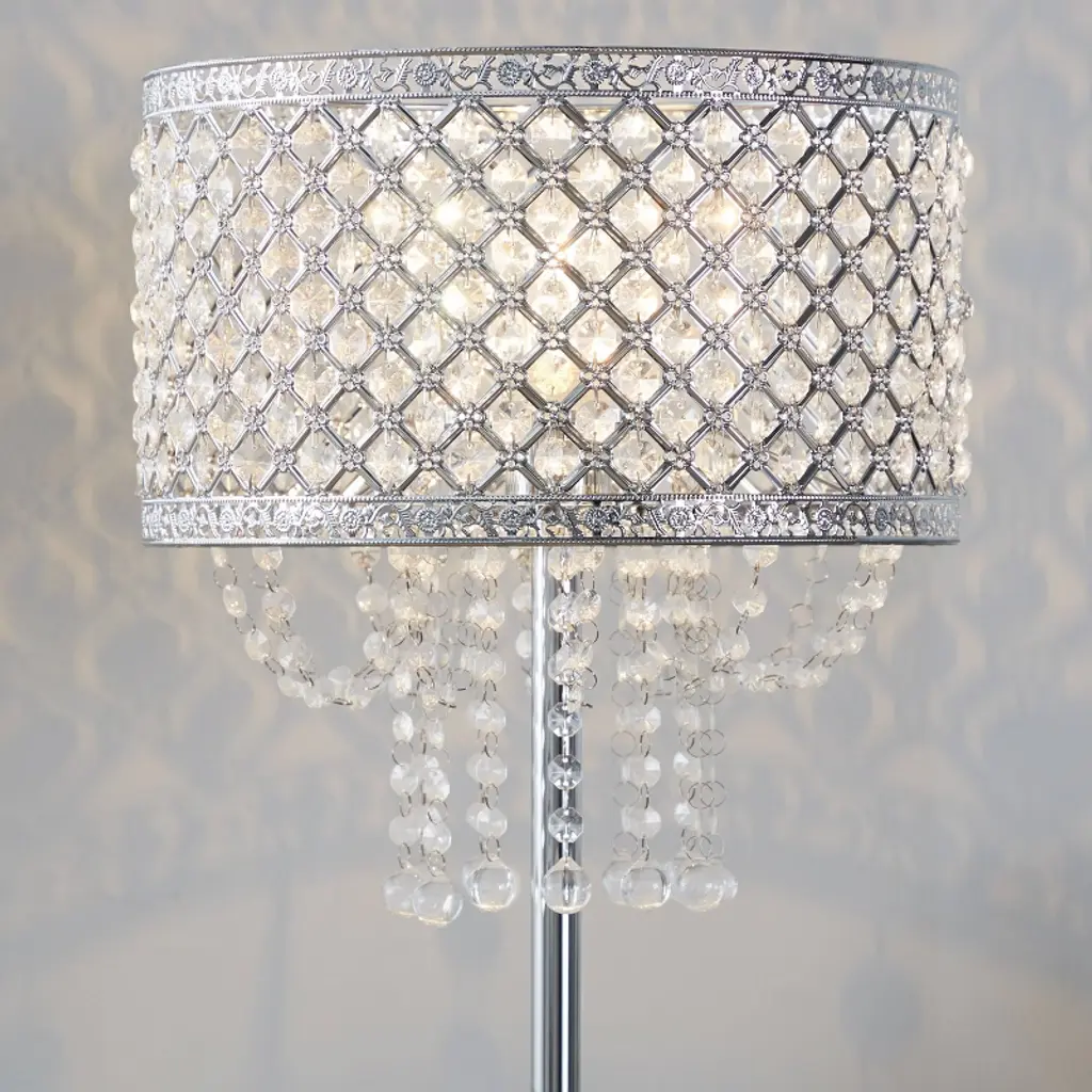 Add glamour and glitz to your life with the Droplets Floor Lamp from Grandview Gallery by LumiSource. A chic addition to modern aesthetics, it showcases a gorgeous metal shade with crystals that have been individually threaded into the shade and crystal beads that hang off the bottom. When lit, all of the genuine crystals cast a radiant display of cascading patterns onto surrounding walls.