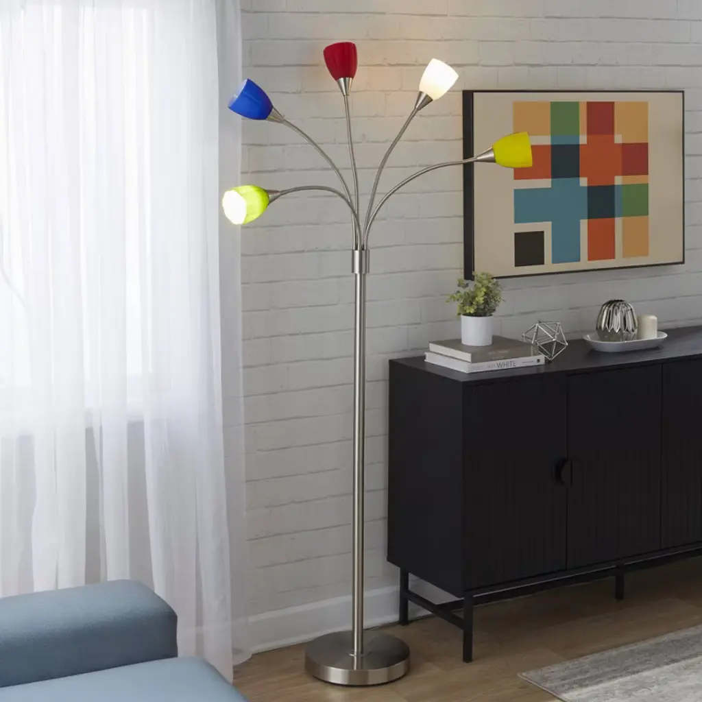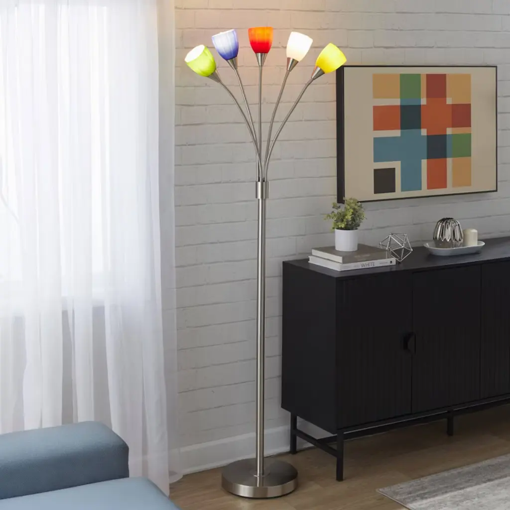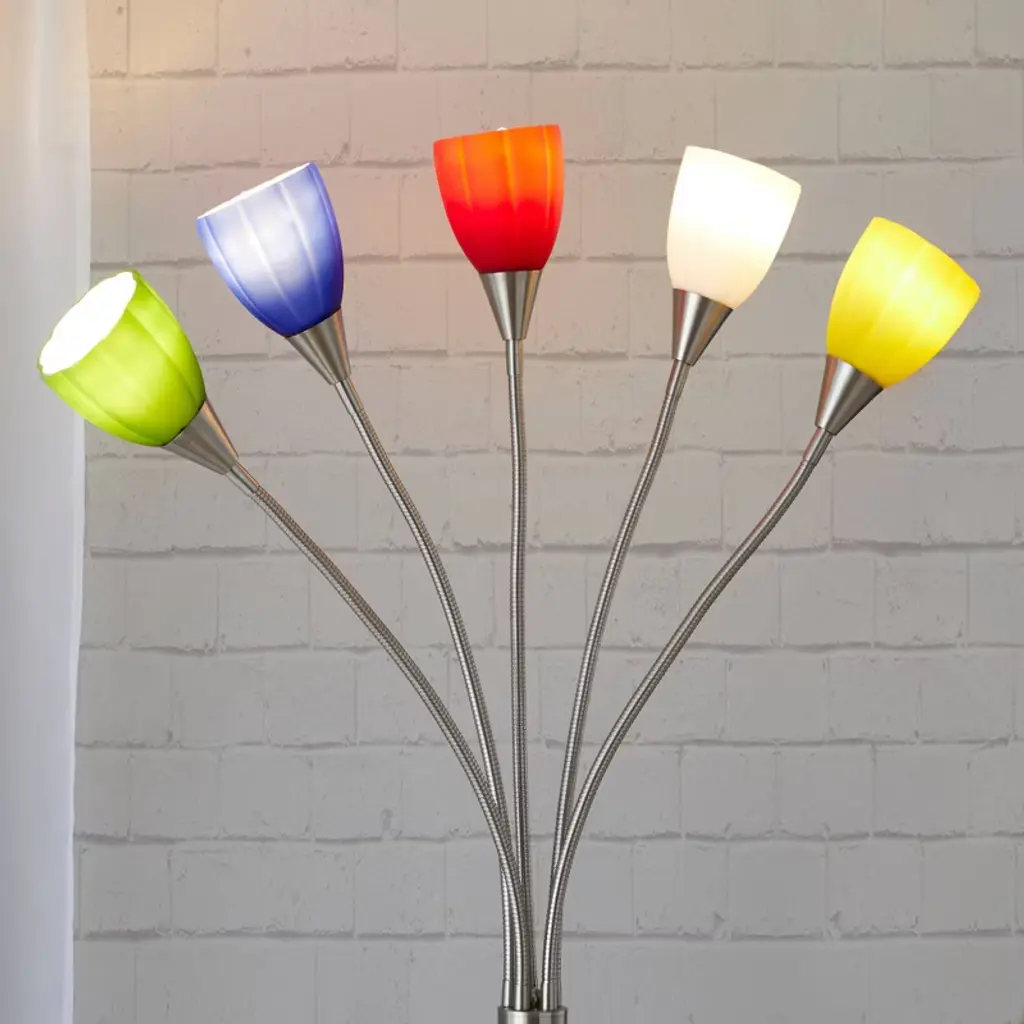 The Medusa® lamp’s popularity is unsurpassed! This versatile lamp provides a bold color statement in any room and adapts to your need for function paired with style. 24 inch goose-neck arms allow you to direct light where you need it. A brushed stainless steel finish on the base and frame catches the reflection of interchangeable colored glass sconces with interior opal flashing. Takes 25-watt candelabra bulbs.