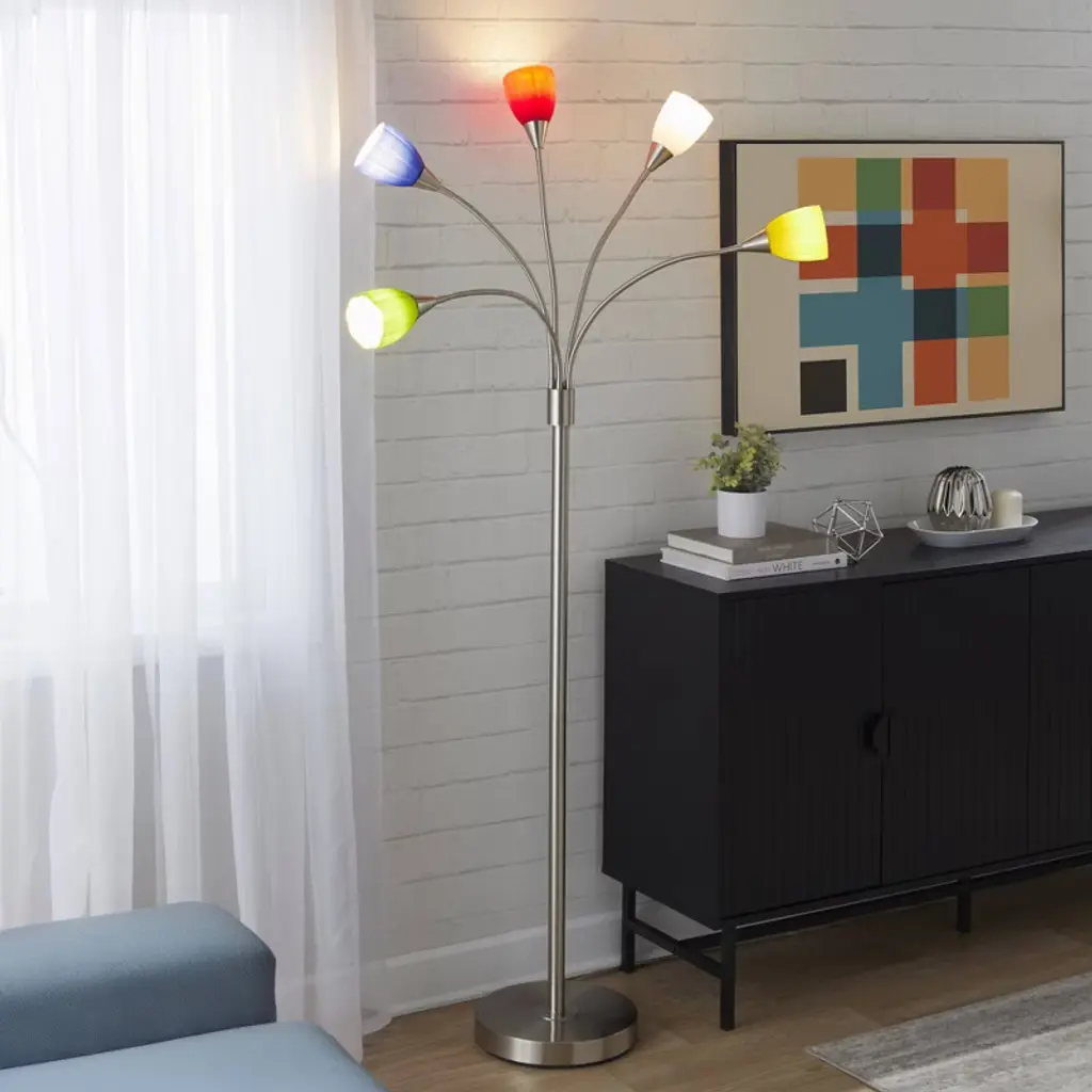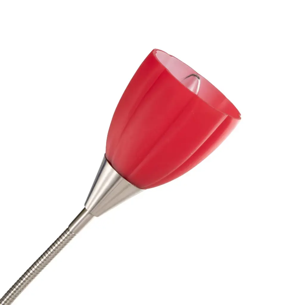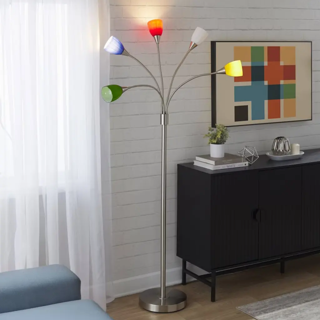 The Medusa® lamp’s popularity is unsurpassed! This versatile lamp provides a bold color statement in any room and adapts to your need for function paired with style. 24 inch goose-neck arms allow you to direct light where you need it. A brushed stainless steel finish on the base and frame catches the reflection of interchangeable colored glass sconces with interior opal flashing. Takes 25-watt candelabra bulbs.