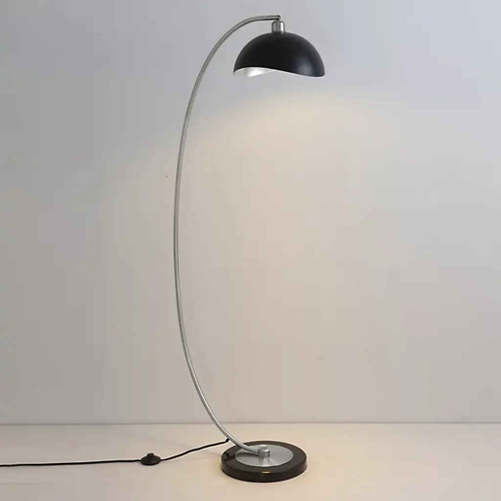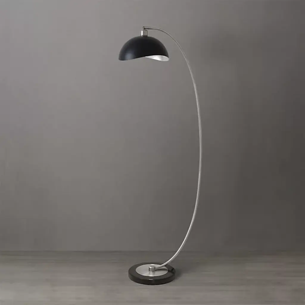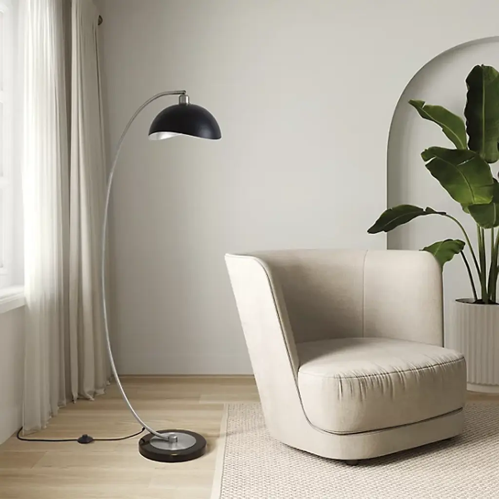 The Luna Bella Chairside Arc Floor Lamp from Nova of California draws inspiration from the moon's curve on a starlit night, creating a curving, feminine charm. The design features a gracefully arched silhouette anchored by a round black marble base, while the slender steel arc, finished in weathered brass, extends elegantly to support a curved black shade with gold-leaf lining, casting warm, inviting light over any seating area. Blending Contemporary and Mid-Century Modern styles, the versatile fixture is sure to harmonize with diverse decor, embodying exquisite craftsmanship and enduring functionality.