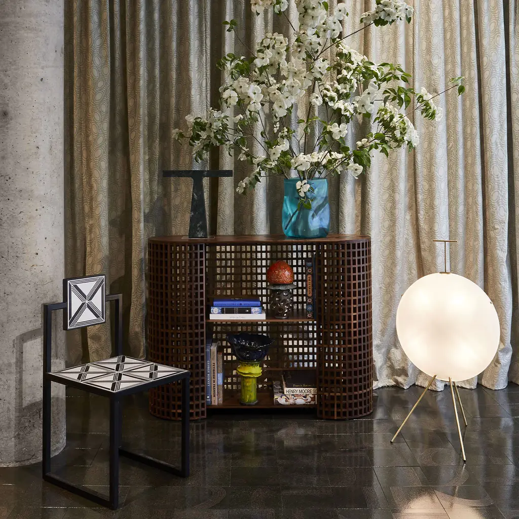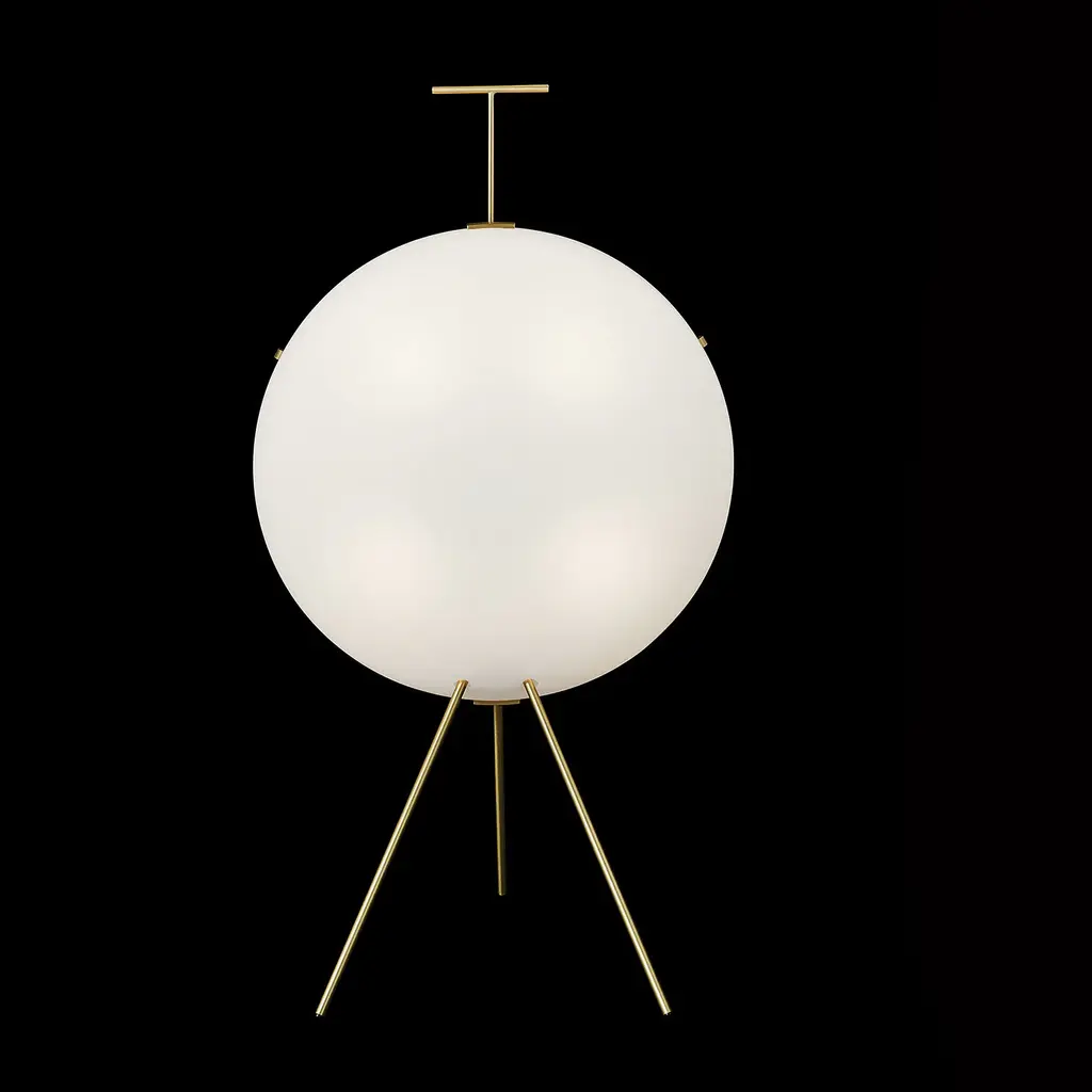 This superb floor lamp was designed by legendary Italian master Gio Ponti and was first introduced at the 1957 Triennale in Milan. Its elegant shape is reminiscent of the moon landing, with its brass structure of satin-finished brass that comprises a three-legged base and a single vertical top that seems to be piercing the spherical shade in white plastic. The name of the collection, moon in Italian, is a homage to the evocative qualities and ethereal allure of our beloved satellite.