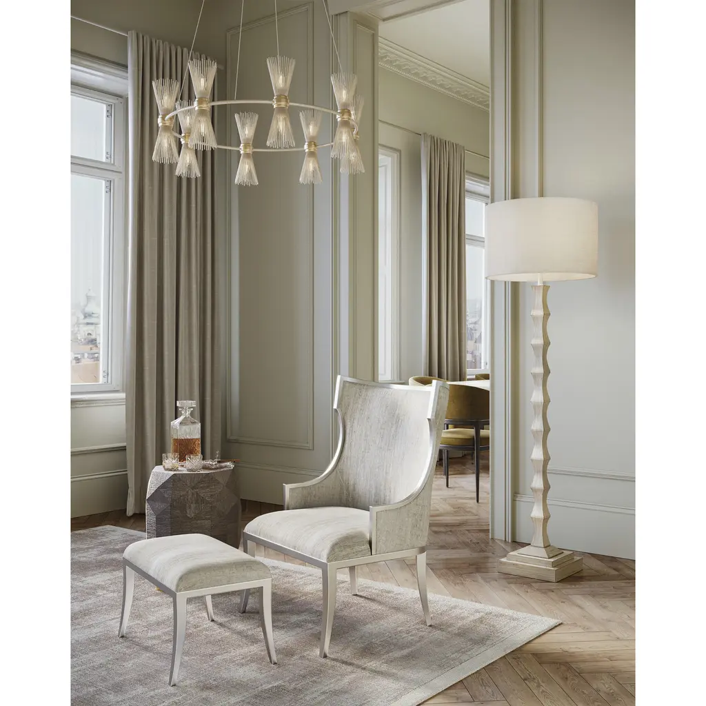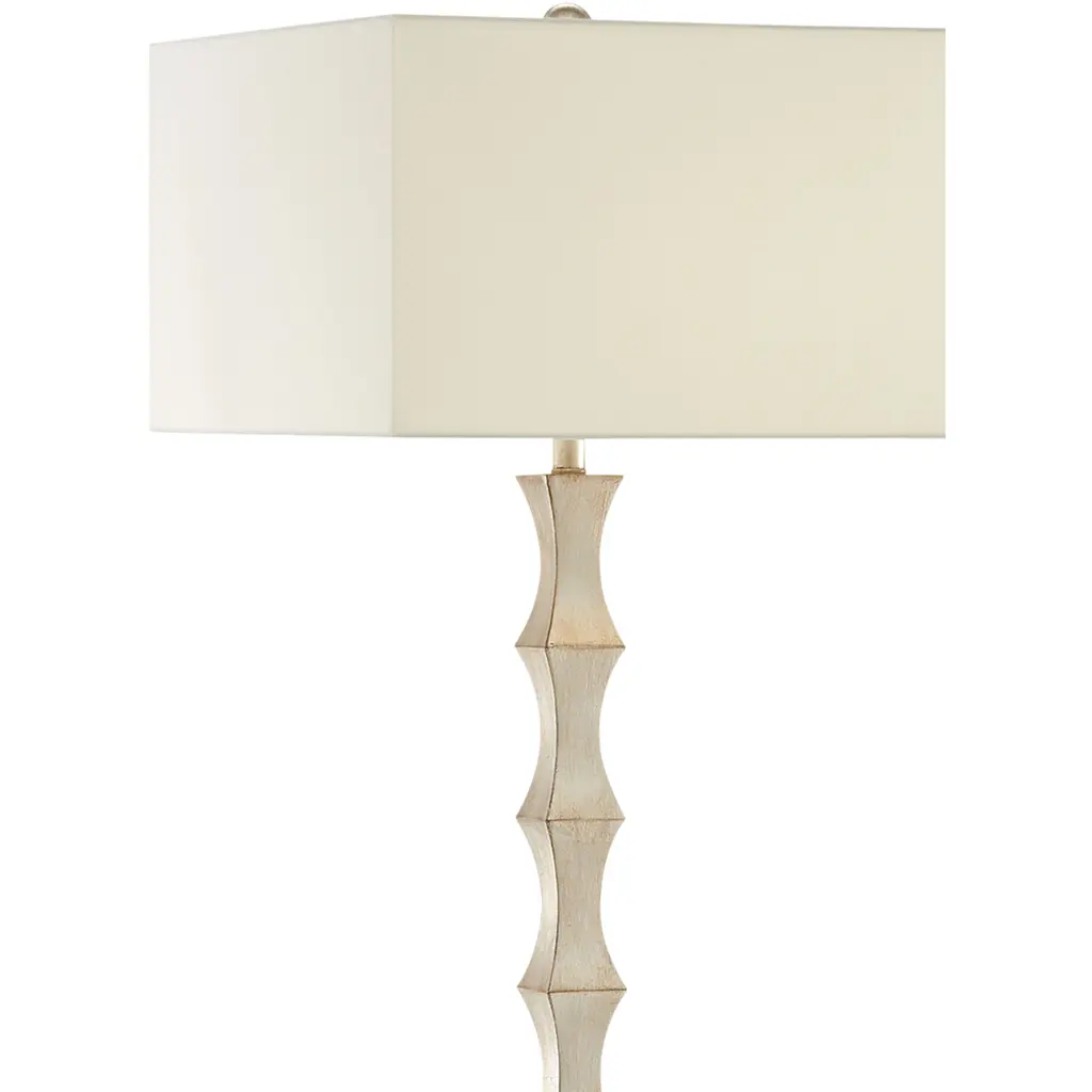 The Lyndhurst Floor Lamp has a simple bone-like spine that is beautifully finished in silver leaf to bring the knobby column a lustrous glow. Held into place with a matching finial, the rectangular off-white shantung shade is wide enough to cast its illumination onto the entire frame for a stunning effect. The lamp will bring warmth into any interior space, from traditional and transitional to contemporary and Boho chic.