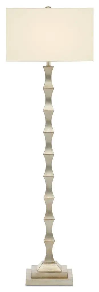 The Lyndhurst floor lamp has a simple bone-like spine that is beautifully finished in silver leaf to bring the knobby column a lustrous glow. Held into place with a matching finial, the rectangular off-white shantung shade is wide enough to cast its illumination onto the entire frame for a stunning effect. The lamp, which stands 63" tall, will bring warmth into any interior space, from traditional and transitional to contemporary and Boho chic.Fixture Type: PortableNumber of Lights: 1 LightBulb Type: A Standard BulbMaximum Watts per Item: 150Maximum Watts per Socket: 150Socket Type: Standard Base E26Voltage: 120vSwitch Type: Turn KnobWire Color: SilverCord Length: 15''Harp Finish: NickelHarp Size: 10Shade Detail: Off White ShantungShade Height: 11.5"HShade Top Diameter: 19/19Shade Bottom Diameter: 19/19"Neck Height: 2"Base Height: 4.25"Base Diameter: 10.75Body Diameter: 2.75Body Height: 45.5"Bulbs Included: No