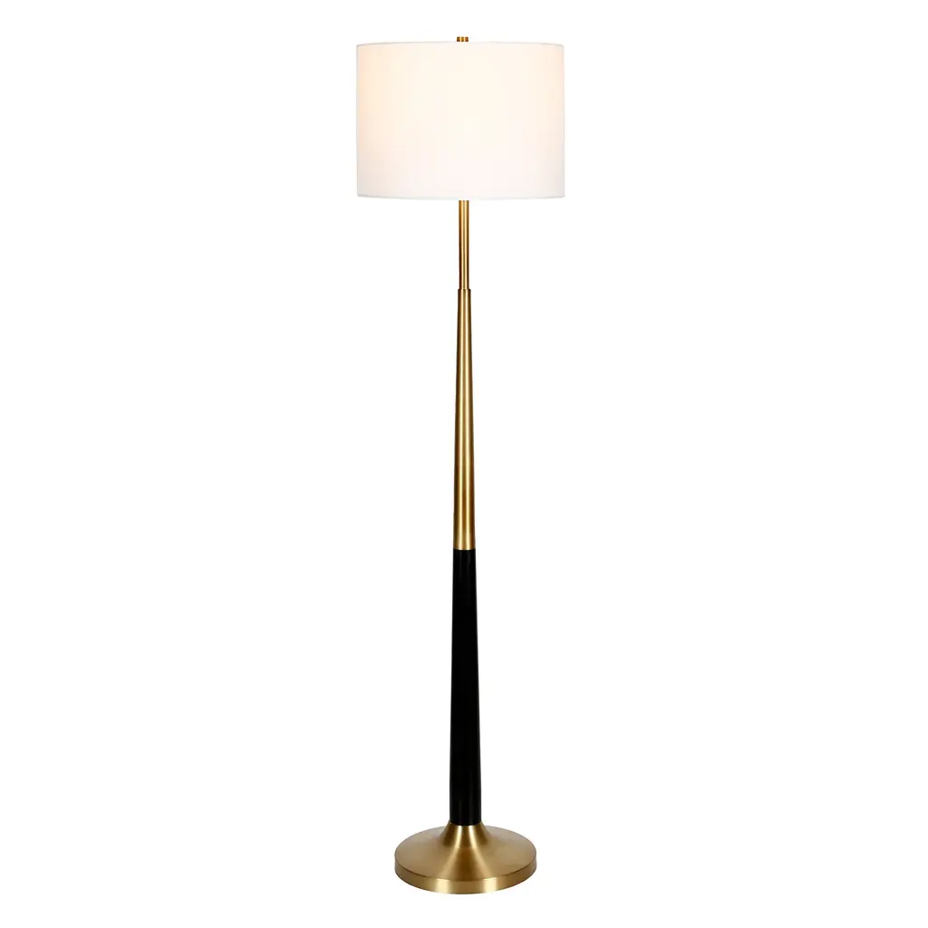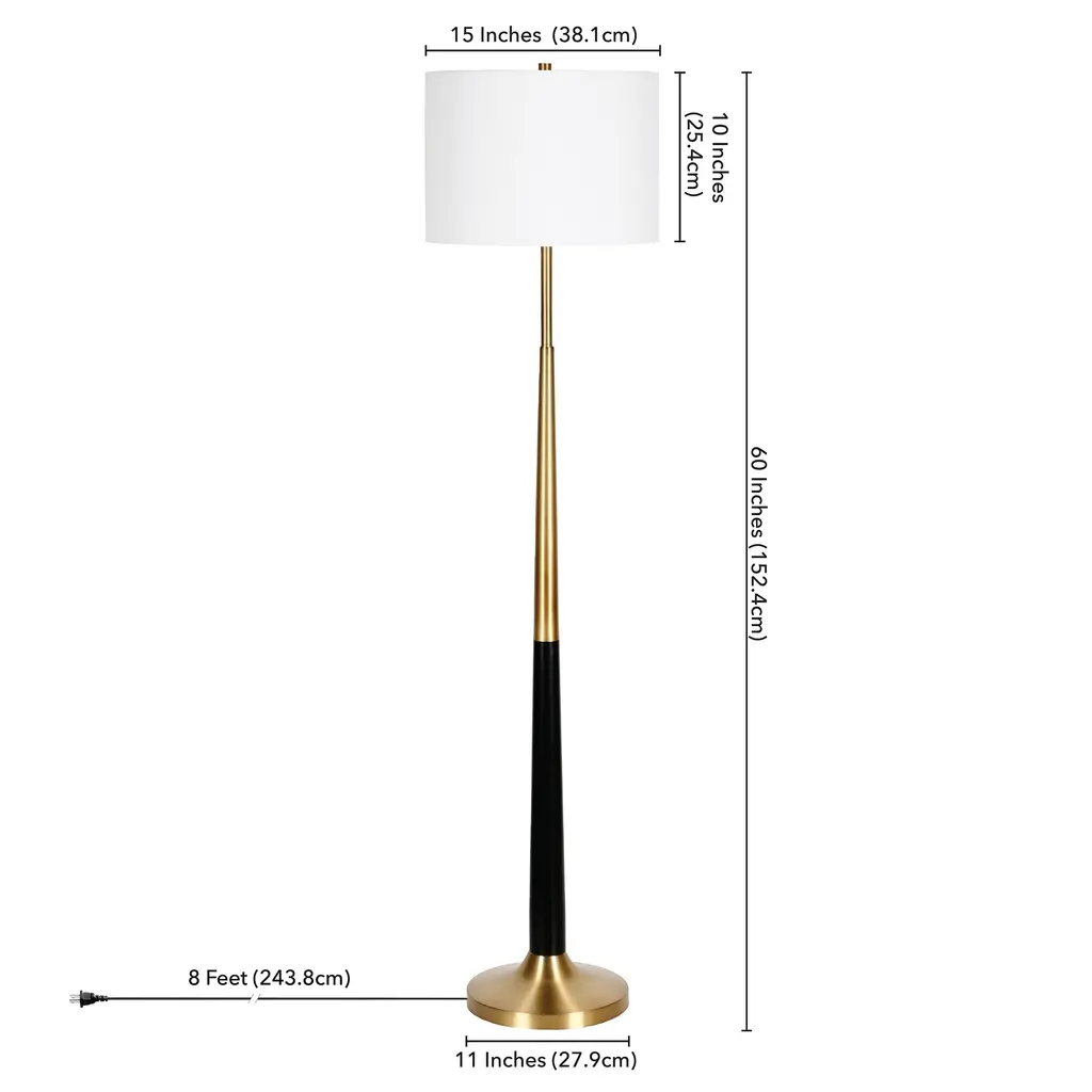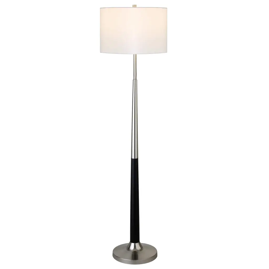 Bring a touch of mid-century modern style to any room with this two-toned floor lamp. On-trend neutral colors are perfectly paired with lustrous metallic accents to elevate your design scheme. A crisp white drum shade tops the gently tapered base, illuminating your space with a polished contemporary look. Handcrafted finish is applied to the steel base. Paired with a drum shade. The shade is in a crisp chiffon white color and is made of 100% linen with polystyrene lining for durability. Rated for one 100W incandescent bulb; 9W LED bulb, 23W fluorescent (CFL) bulb, or 9W self-ballasted LED bulb. E26-base bulb. Includes an 8 ft. cord. Clean with a soft, dry cloth; no harsh chemicals or abrasive cleaning materials.