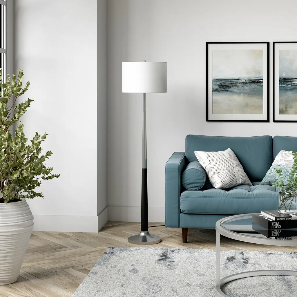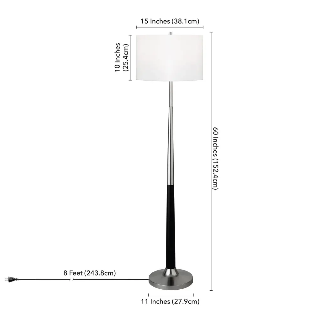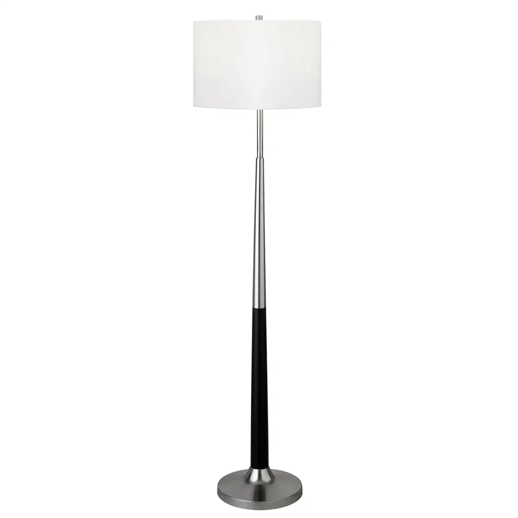 Bring a touch of mid-century modern style to any room with this two-toned floor lamp. On-trend neutral colors are perfectly paired with lustrous metallic accents to elevate your design scheme. A crisp white drum shade tops the gently tapered base, illuminating your space with a polished contemporary look. Handcrafted finish is applied to the steel base. Paired with a drum shade. The shade is in a crisp chiffon white color and is made of 100% linen with polystyrene lining for durability. Rated for one 100W incandescent bulb; 9W LED bulb, 23W fluorescent (CFL) bulb, or 9W self-ballasted LED bulb. E26-base bulb. Includes an 8 ft. cord. Clean with a soft, dry cloth; no harsh chemicals or abrasive cleaning materials.