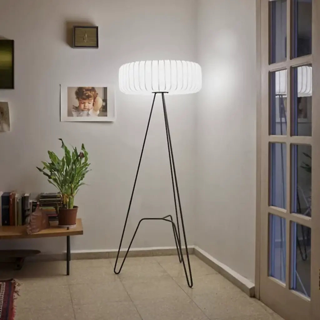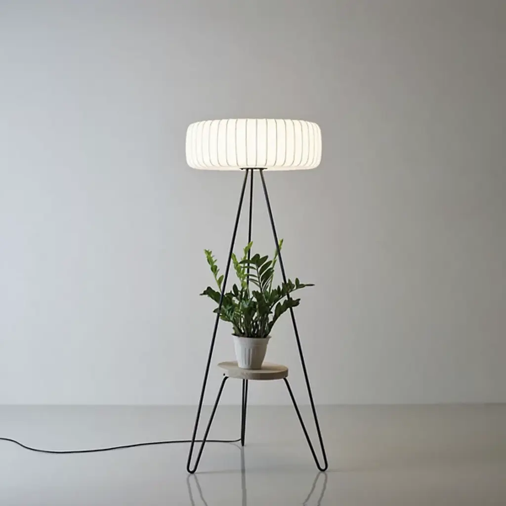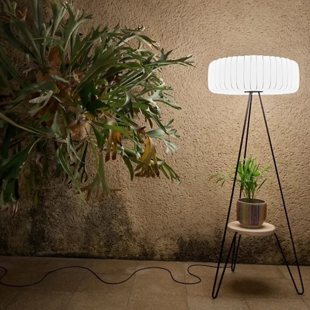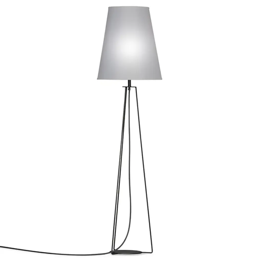 A gorgeous balancing act of shapes designed by Albi Serfaty and Aqua Creations with playfulness in mind. Like a composition of gravity-defying rocks, the nature-inspired M LED Floor Lamp stands tall with eye-catching shape. A wide drum shade sits perfectly over a pinpoint base; it's crafted with a stringy polymer and left to cure, giving it an opaque and textured surface. A tall pointed base lifts from the floor with a sculptural flare; a raised surface at the center acts as a refined pedestal for an array of items. LED light fills the soft shade with sheer vibrancy, filtering out cleanly as a radiant glow.