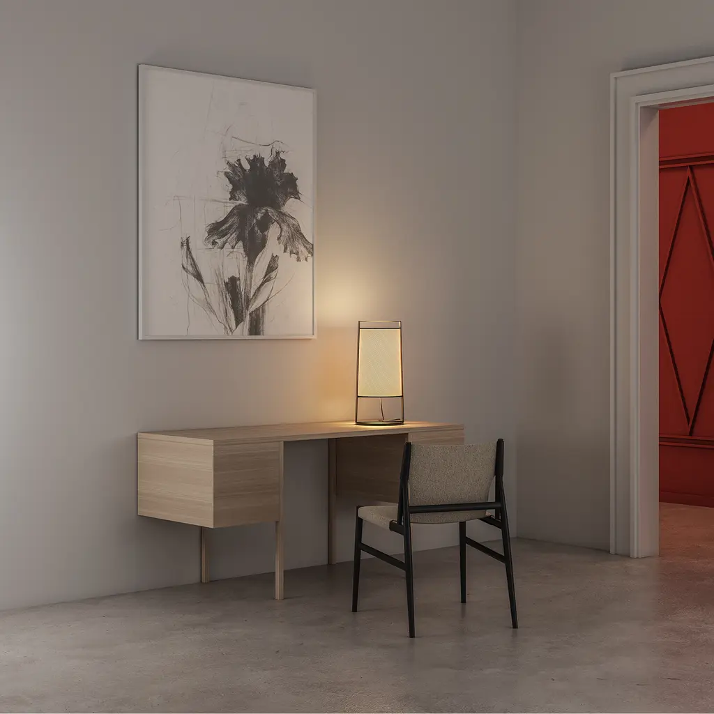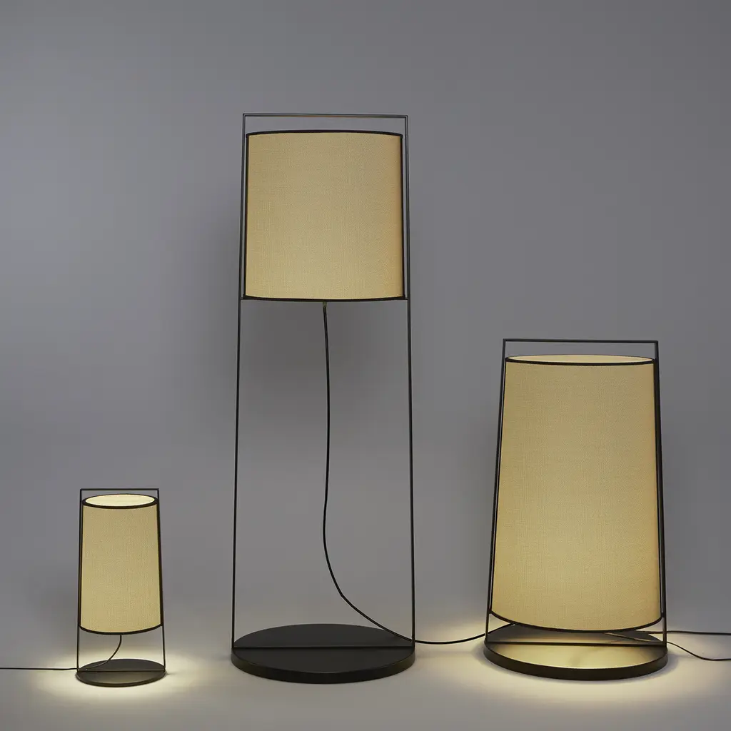 Collection of lamps revisiting traditional Japanese lanterns, characterized by a minimal and elegant style and available in four versions for any environment, floor (in two varieties) or wall and table. The structure is made by metal painted with epoxy powders, with white or black mesh lampshades. Lightness, minimalism and essentiality are the main traits of this collection.