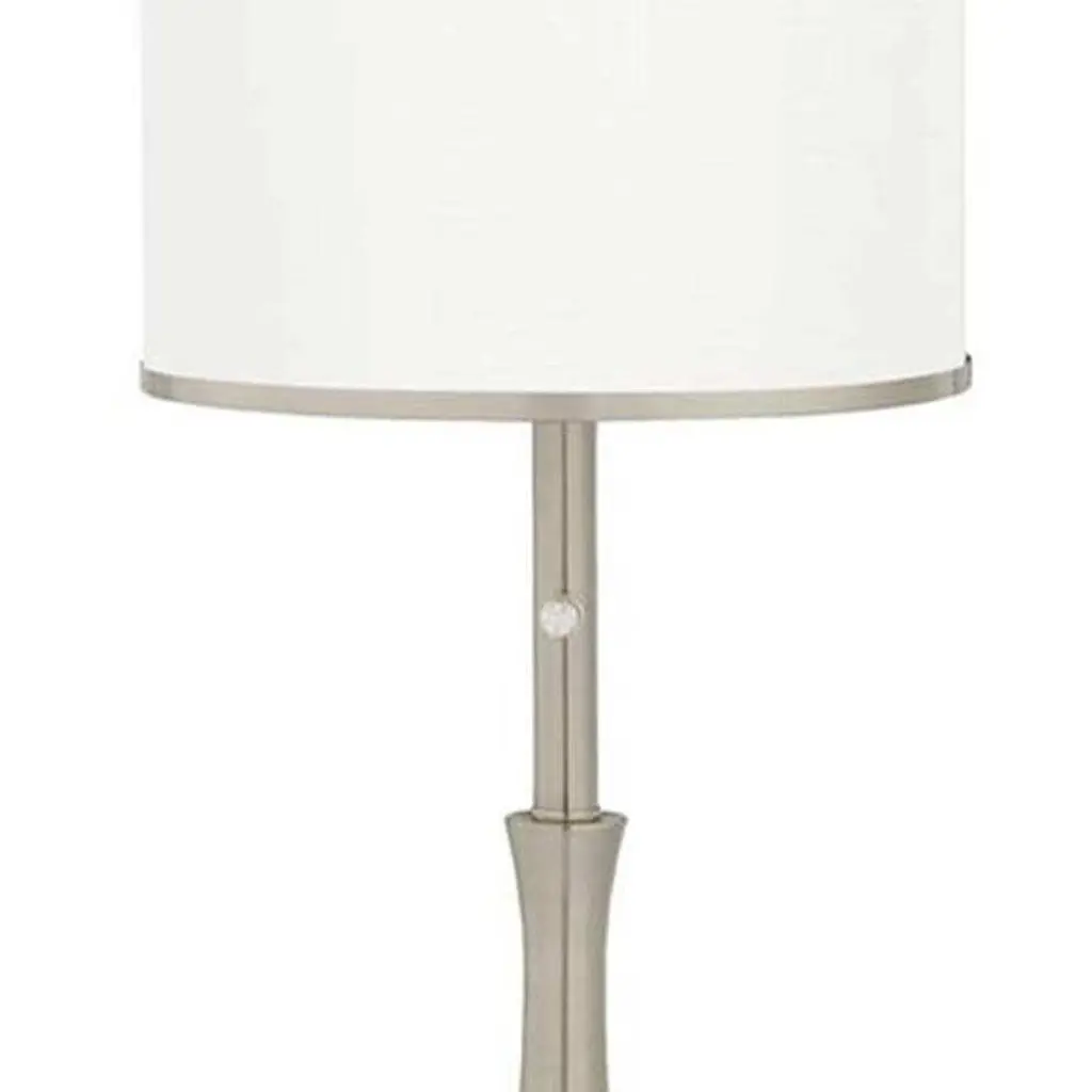 PRODUCT DETAILS: 62" high overall. Bottom base is 11" wide. Shade is 36" high x 12" wide. Weighs 15 lbs. Uses one maximum 150 watt standard-medium base bulb (not included). On-off rotary switch. Contemporary modern glass floor lamp from the Color + Plus lighting collection. Madeira designer finish. Round glass body. Brushed nickel finish accents. Metal construction. White linen cylinder shade with top and bottom metal trim. 8-foot long silver cord and plug. DESCRIPTION: Liven up your living space with this contemporary modern floor lamp from the Color + Plus™ collection. It comes in a brushed nickel finish metal frame, which supports a round glass body in a designer Madeira finish. A long white cylinder shade covers over half the design. The result is an eye-catching modern glass floor lamp with brilliant coloring.