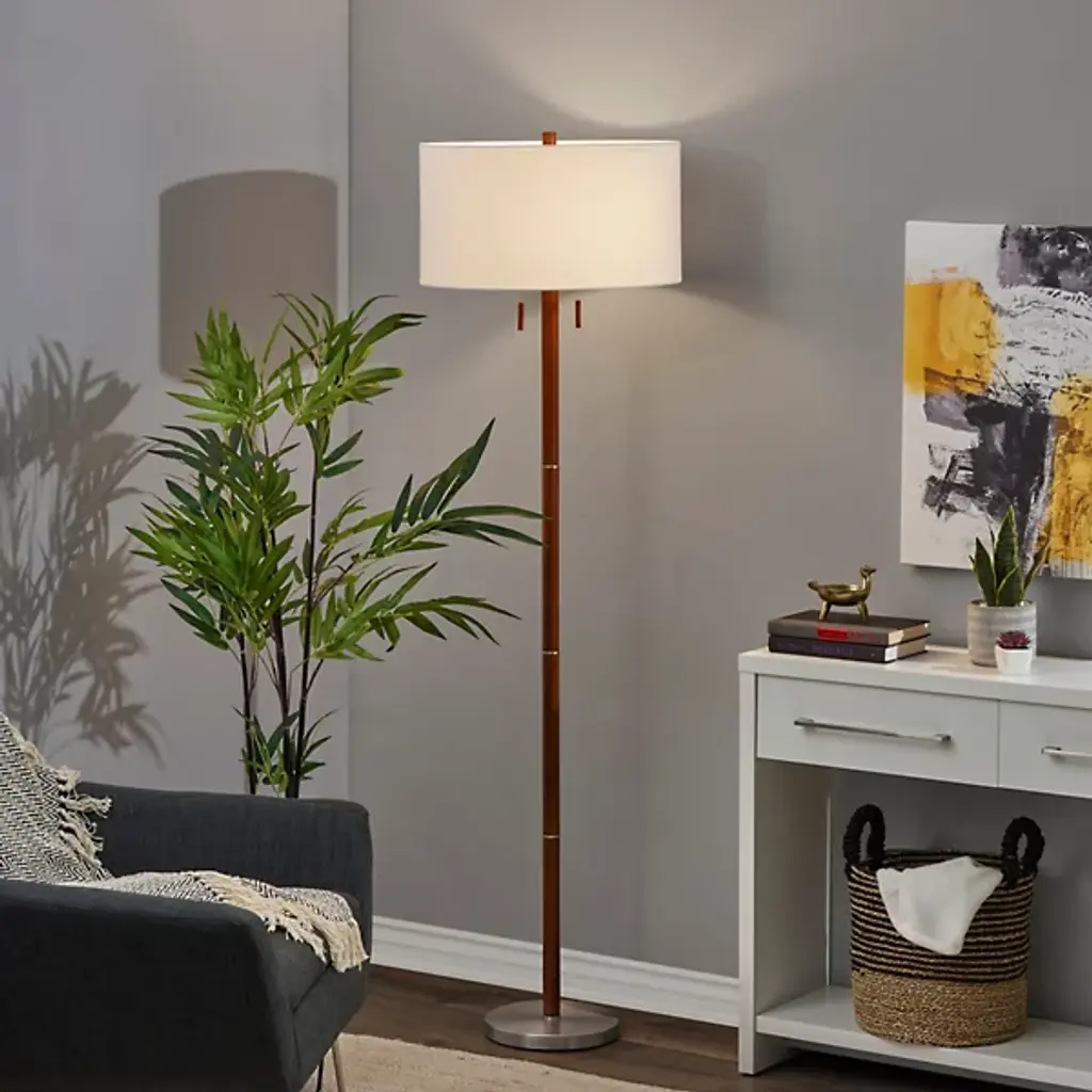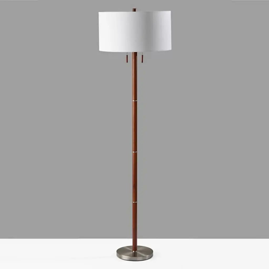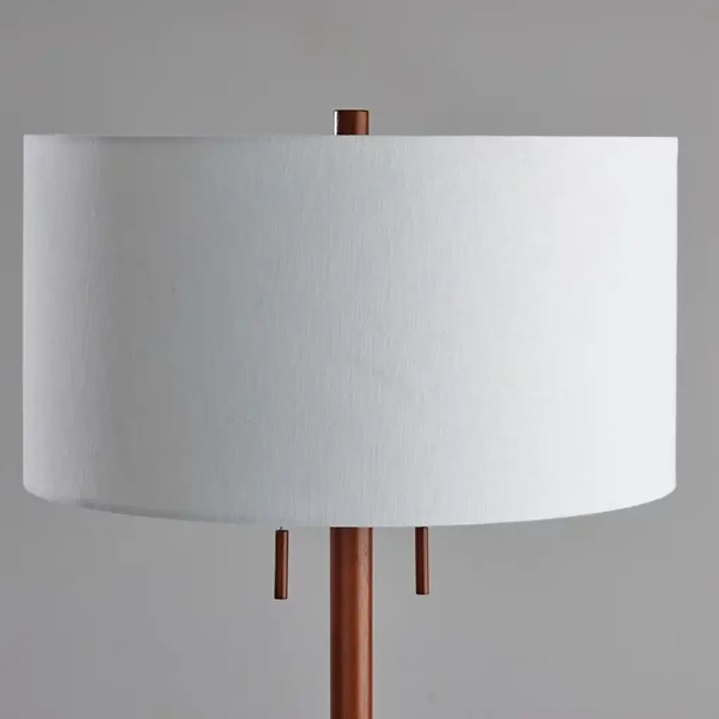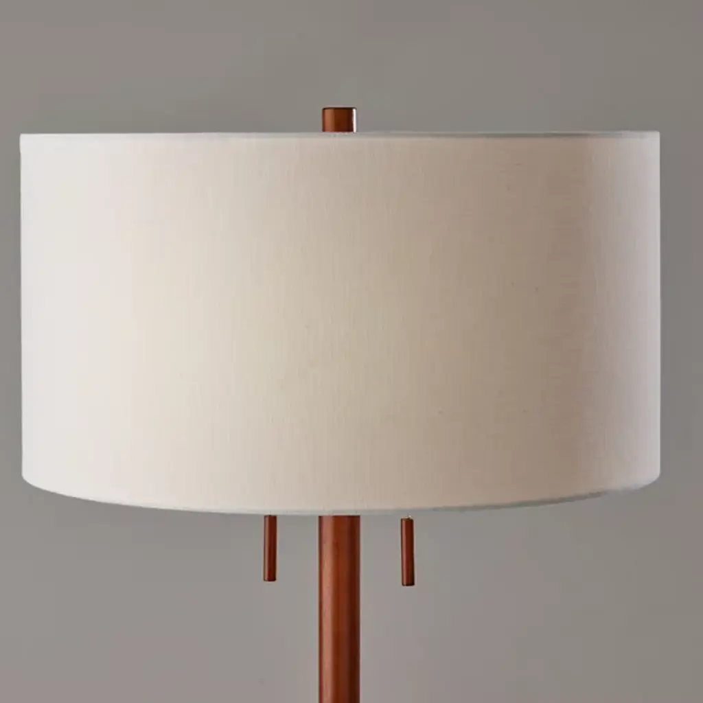 A warm, nurturing presence. Create an aura of comfort around your rooms with the Madeline Floor Lamp from Adesso. The floor lamp's streamlined silhouette makes it a versatile addition to the modern home. Golden, textured rubberwood complements the natural touches of your rooms. The streaking lines of the wood grain along with crisp metal ring accents tilt the head up towards the shade. Accented with elegant rubberwood pull chains, the textured fabric drum conceals a pair of warm, bright bulbs. Toggle each one for soft and intimate light.