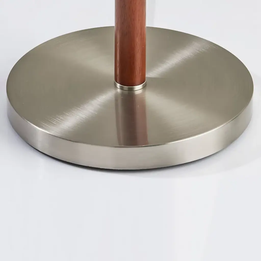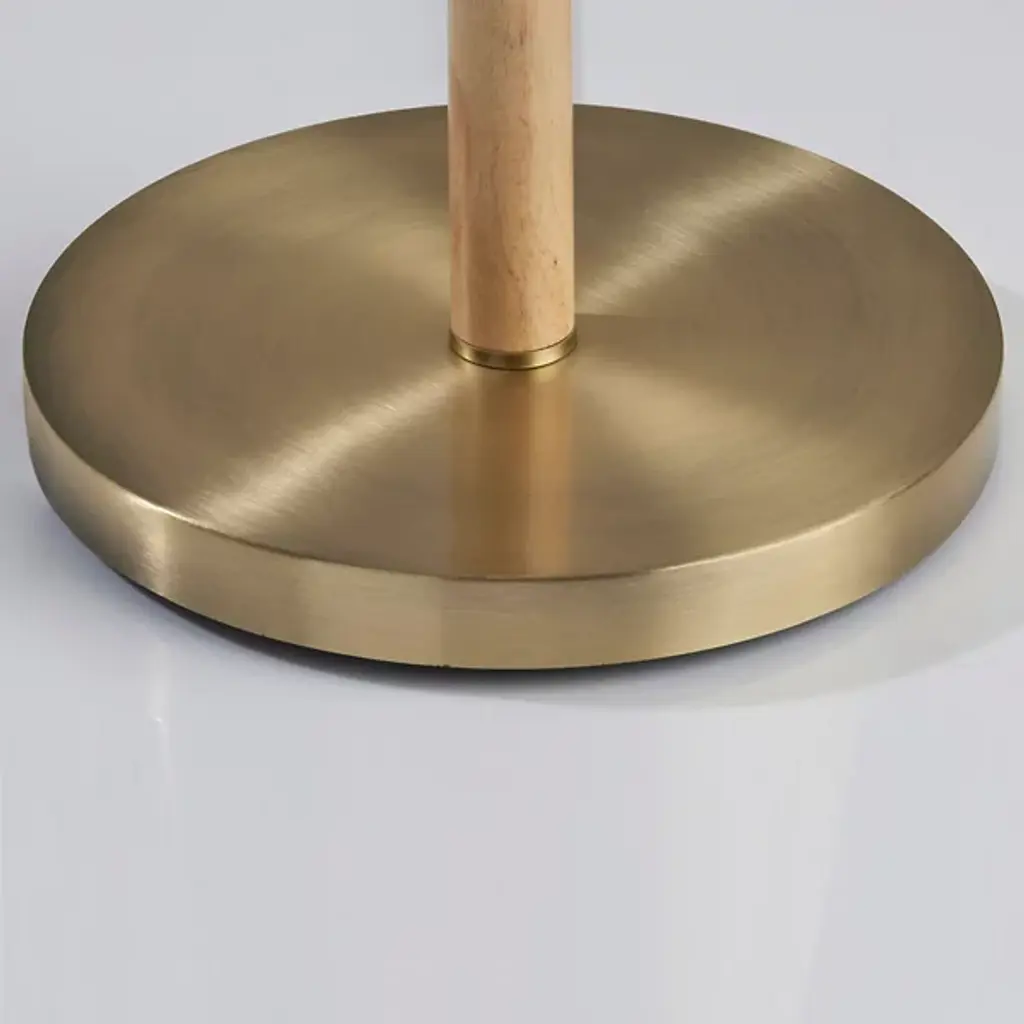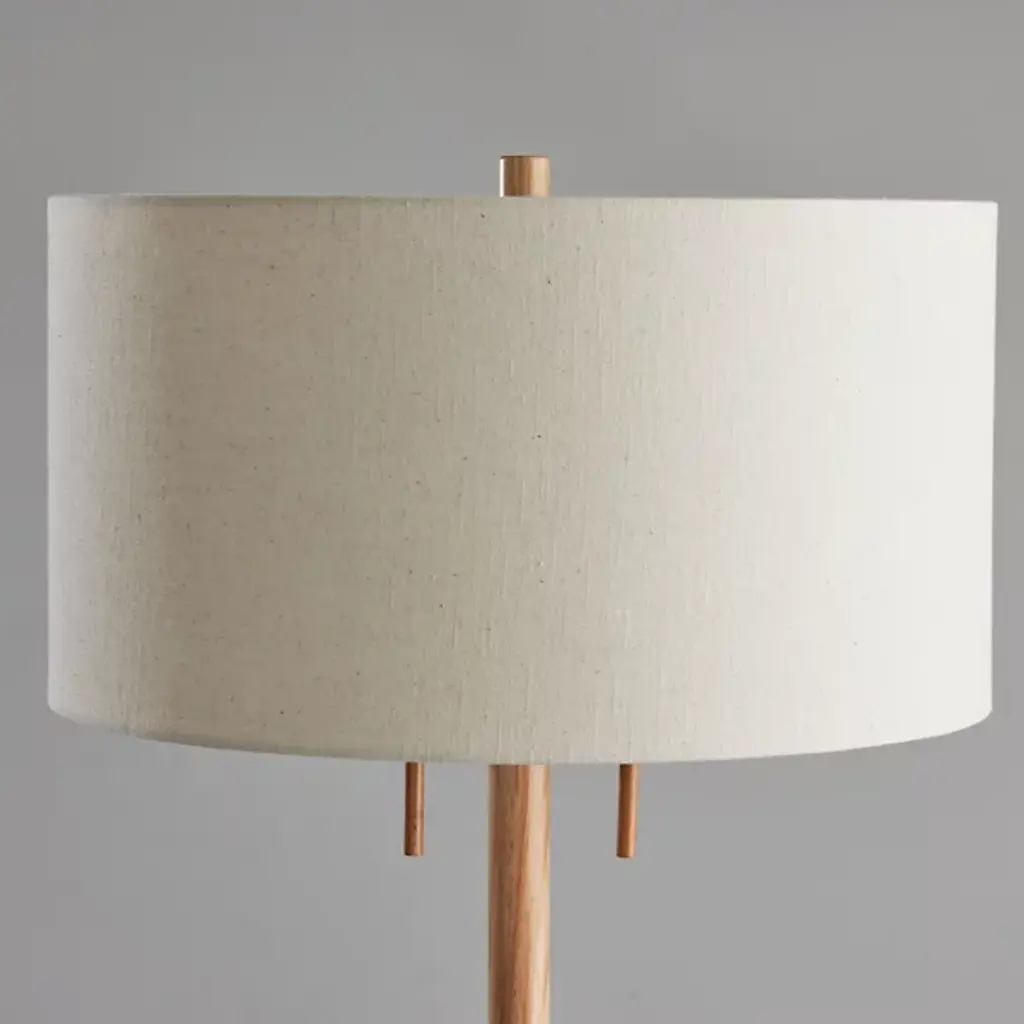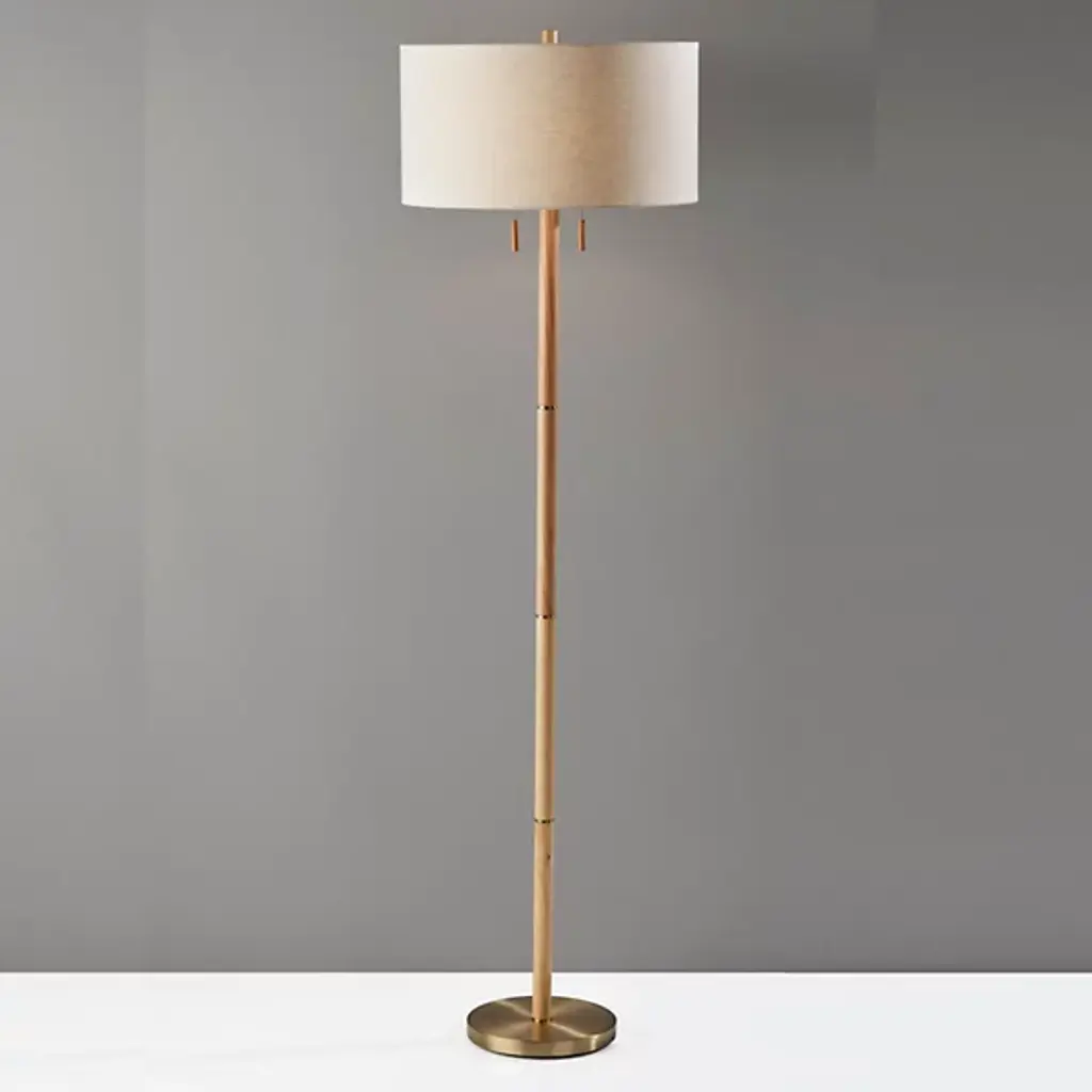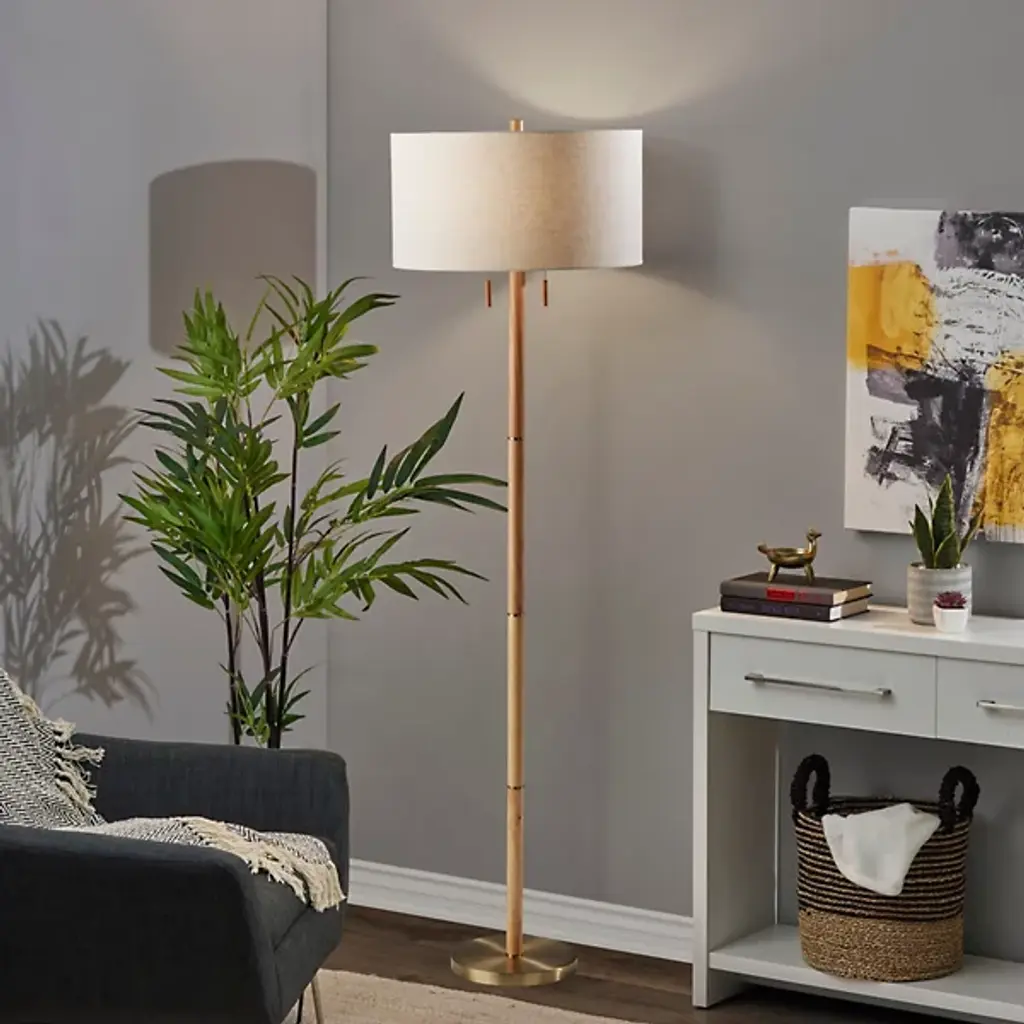 A warm, nurturing presence. Create an aura of comfort around your rooms with the Madeline Floor Lamp from Adesso. The floor lamp's streamlined silhouette makes it a versatile addition to the modern home. Golden, textured rubberwood complements the natural touches of your rooms. The streaking lines of the wood grain along with crisp metal ring accents tilt the head up towards the shade. Accented with elegant rubberwood pull chains, the textured fabric drum conceals a pair of warm, bright bulbs. Toggle each one for soft and intimate light.