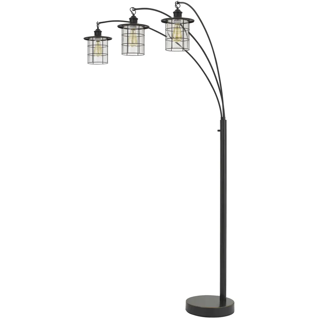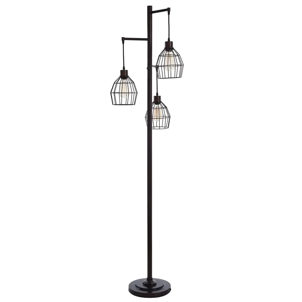 Elevate your living space with the Madison Bronze floor lamp by StyleCraft. Its vintage-inspired yet modern design, featuring a sleek single-bar frame and three caged shades, creates a striking focal point while providing warm, ambient light. Perfect for living rooms, offices, or cozy sitting areas, this lamp balances function and style, adding a touch of industrial sophistication and contemporary charm to any décor.