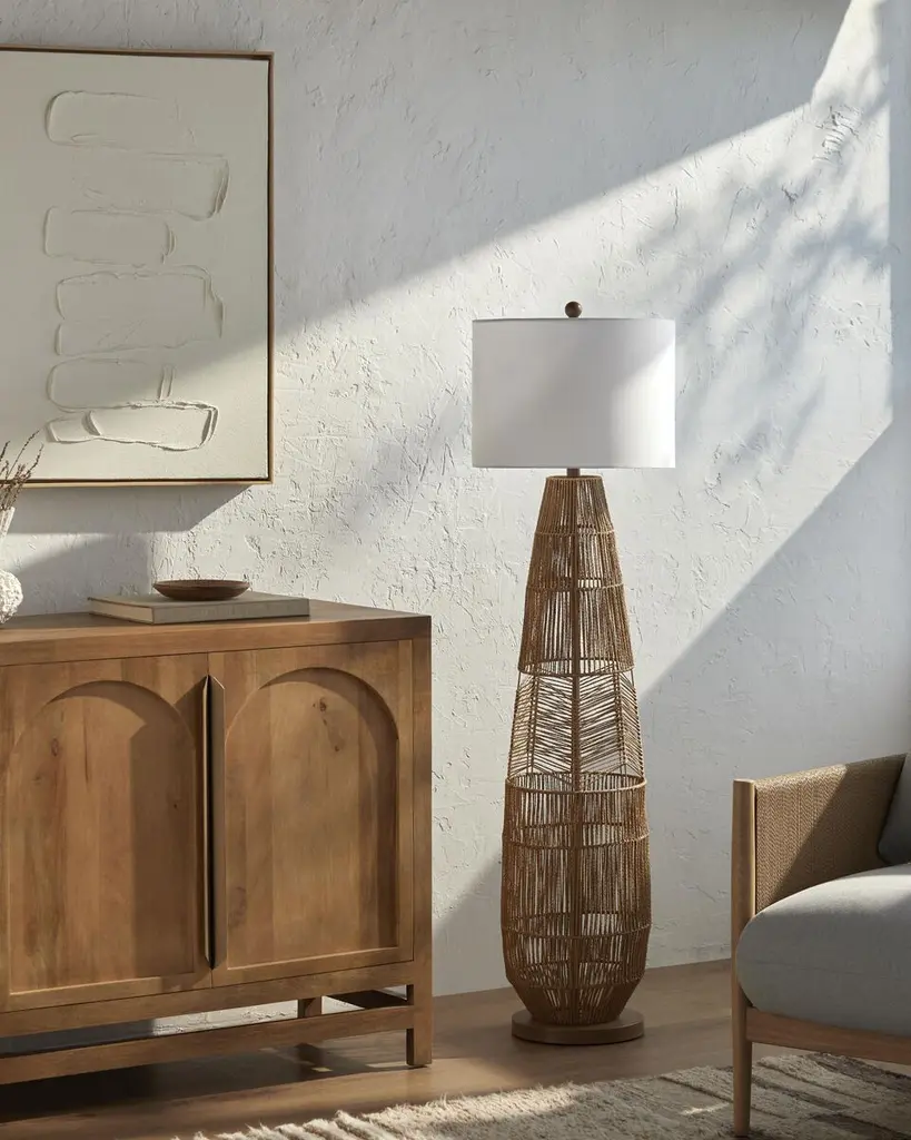 Transform your living space with the Mael accent floor lamp, where traditional elegance meets modern functionality. Standing gracefully at 55 inches, this lamp showcases a charming rattan body that brings natural warmth and texture to any room. Its dual-layered linen shade, complete with an inner plastic lining, beautifully diffuses light to create a cozy ambiance. Finished with a stylish resin finial, this floor lamp is both sturdy and stunning. Keep it looking pristine with a simple wipe from a dry cloth, avoiding harsh cleaners. Illuminate your home with timeless sophistication and choose the Mael accent floor lamp for an instant style upgrade.