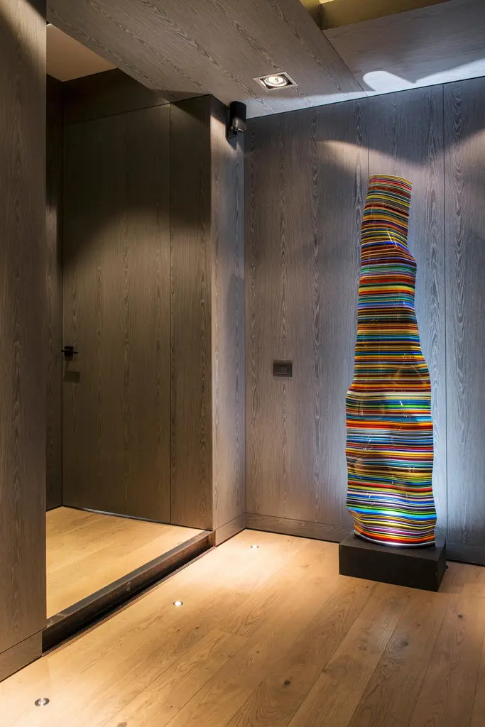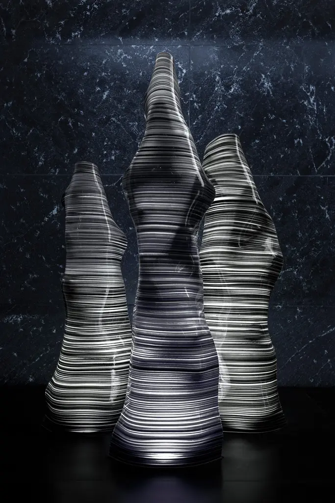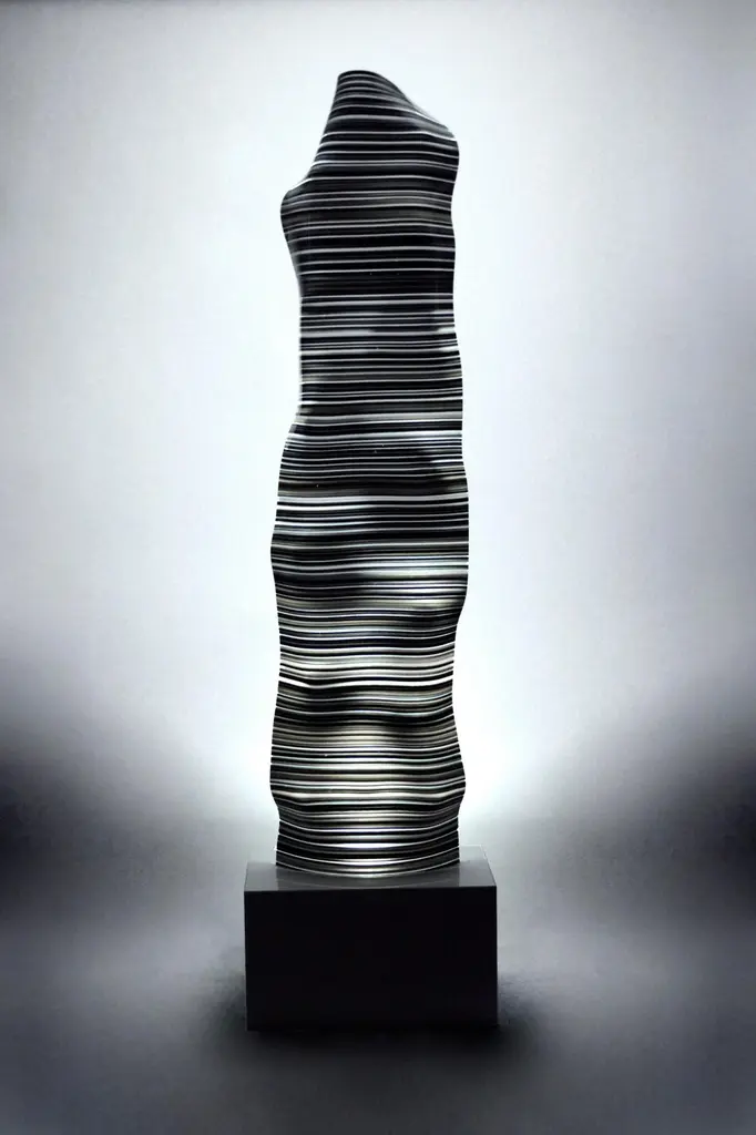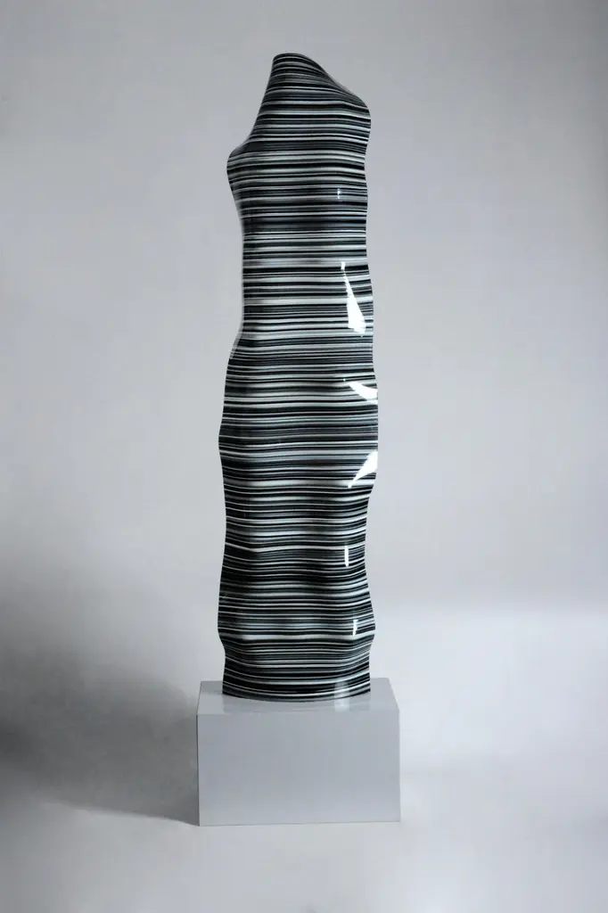 This fused glass lighting piece belongs to the barcode Magikarpet collection designed by Orfeo Quagliata.A black and white barcode scheme over a marble base merge into a contemporary uncompromised design.This sensuous piece that flows against the trend fits perfectly in any interior to create a contrasting and enveloping atmosphere.When turned on the projections create a unique sensation.Exclusive techniques from the artist. 100% handmade with highest quality materials.