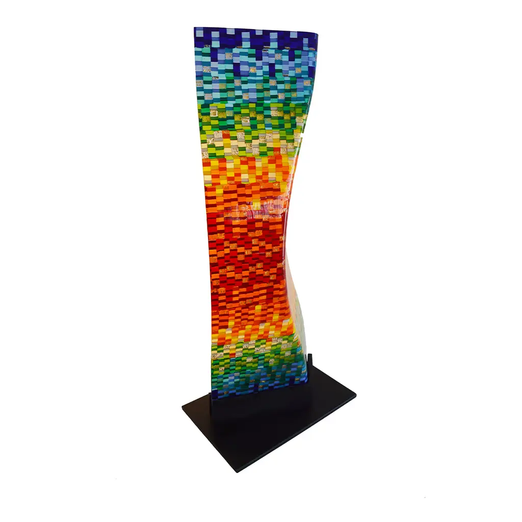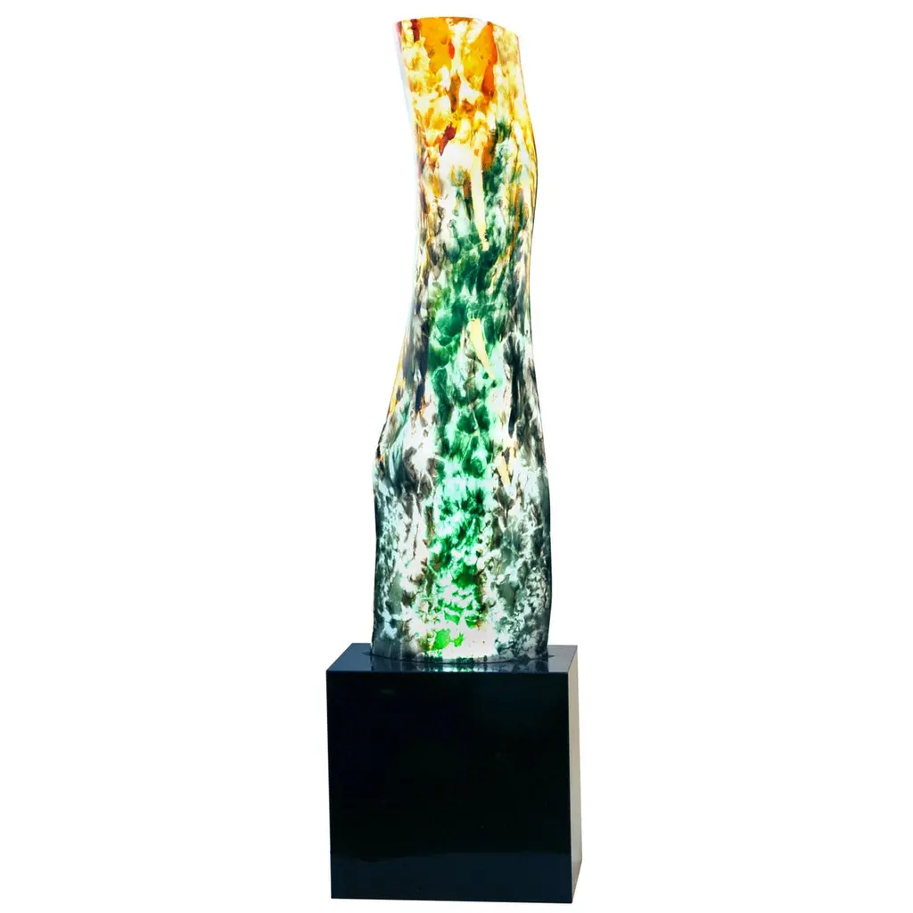 Barcode lamp with granite base.This fused glass piece belongs to the Barcode Magikarpet collection designed by Orfeo Quagliata. Exclusive techniques from the artist. 100% handmade with most high quality material.This elegant piece changes the mood when turned on, the colors and projections create a unique sensation.This piece that flows against the trend goes perfectly in interiors of sober materials to create a colorful, contrasting and enveloping atmosphere.
