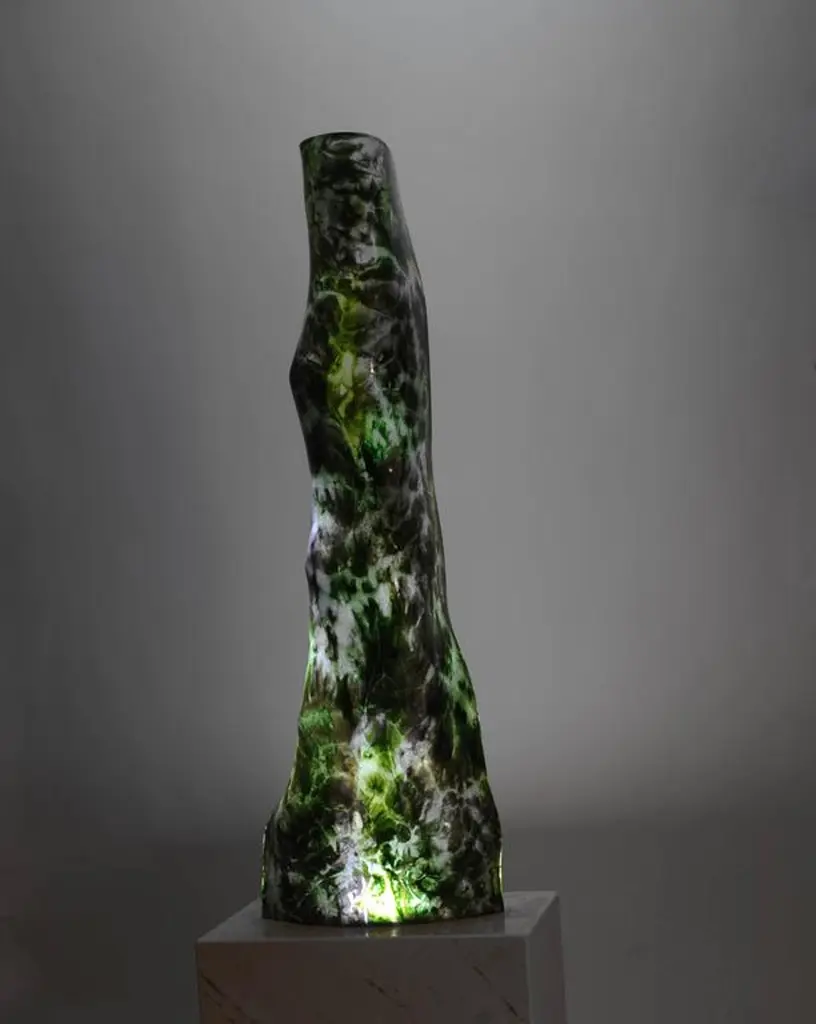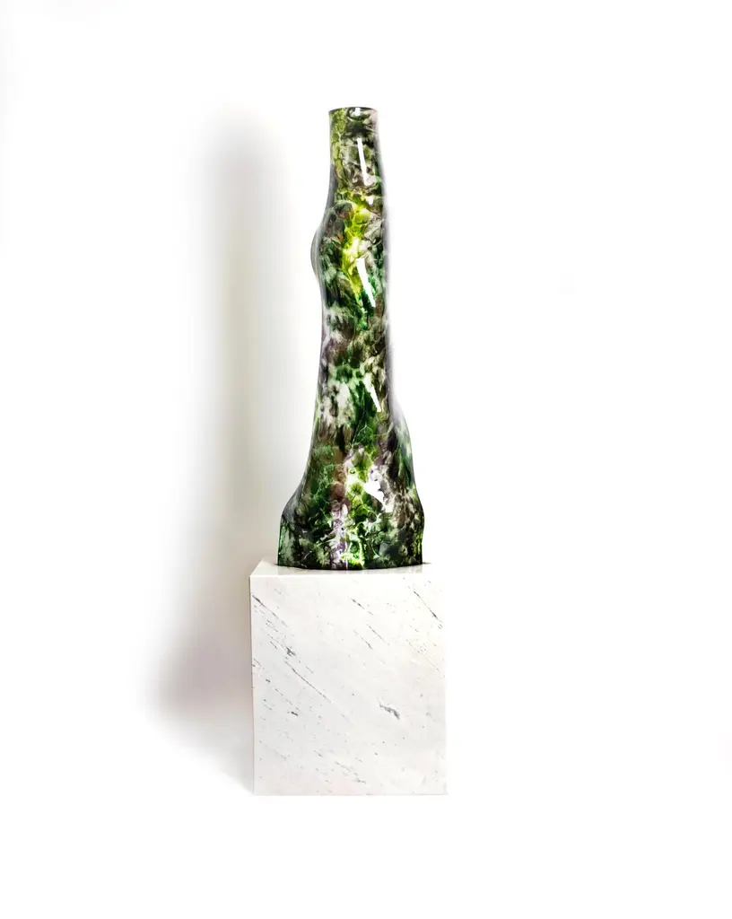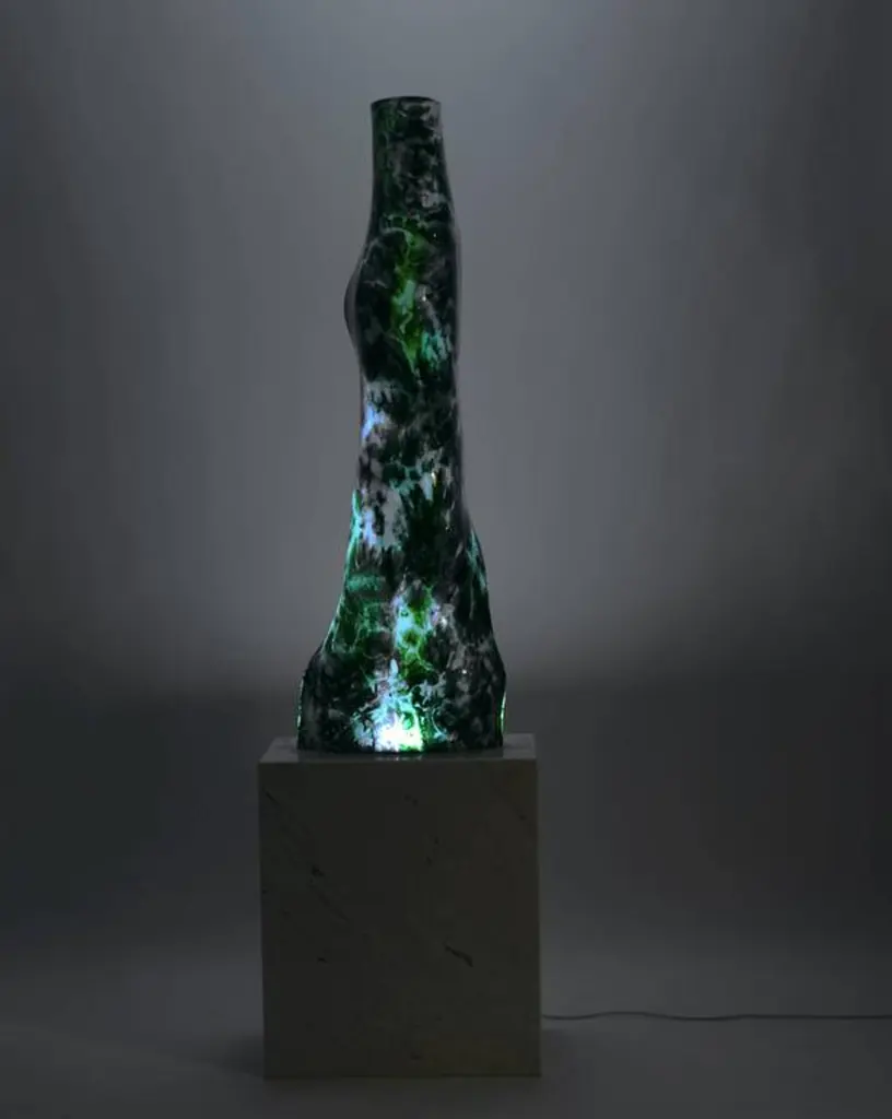 This boiled glass piece belongs to the Jimmiz Brains collection designed by Orfeo Quagliata exclusive techniques from the artist. 100% handmade with most high quality material. Organic lamp with marble base.This elegant piece changes the mood when turned on, the colors and projections create a calm atmosphere. This moss looking piece goes perfect with wooden floors.Dimensions and shape may vary.The color combination is customizable. Please contact us in order to know available colors, delivery time and shipping cost.Please ask for stock or new custom projects.