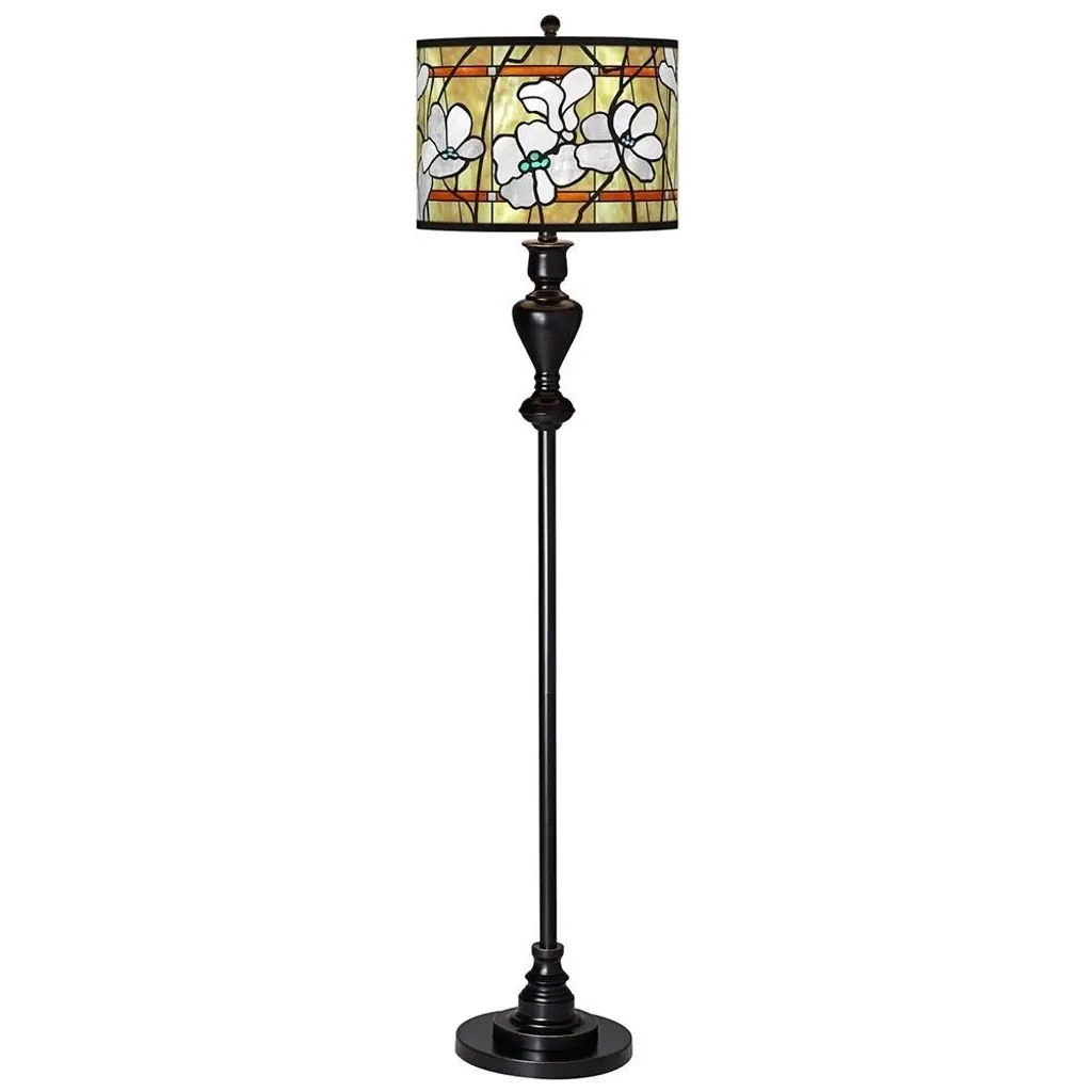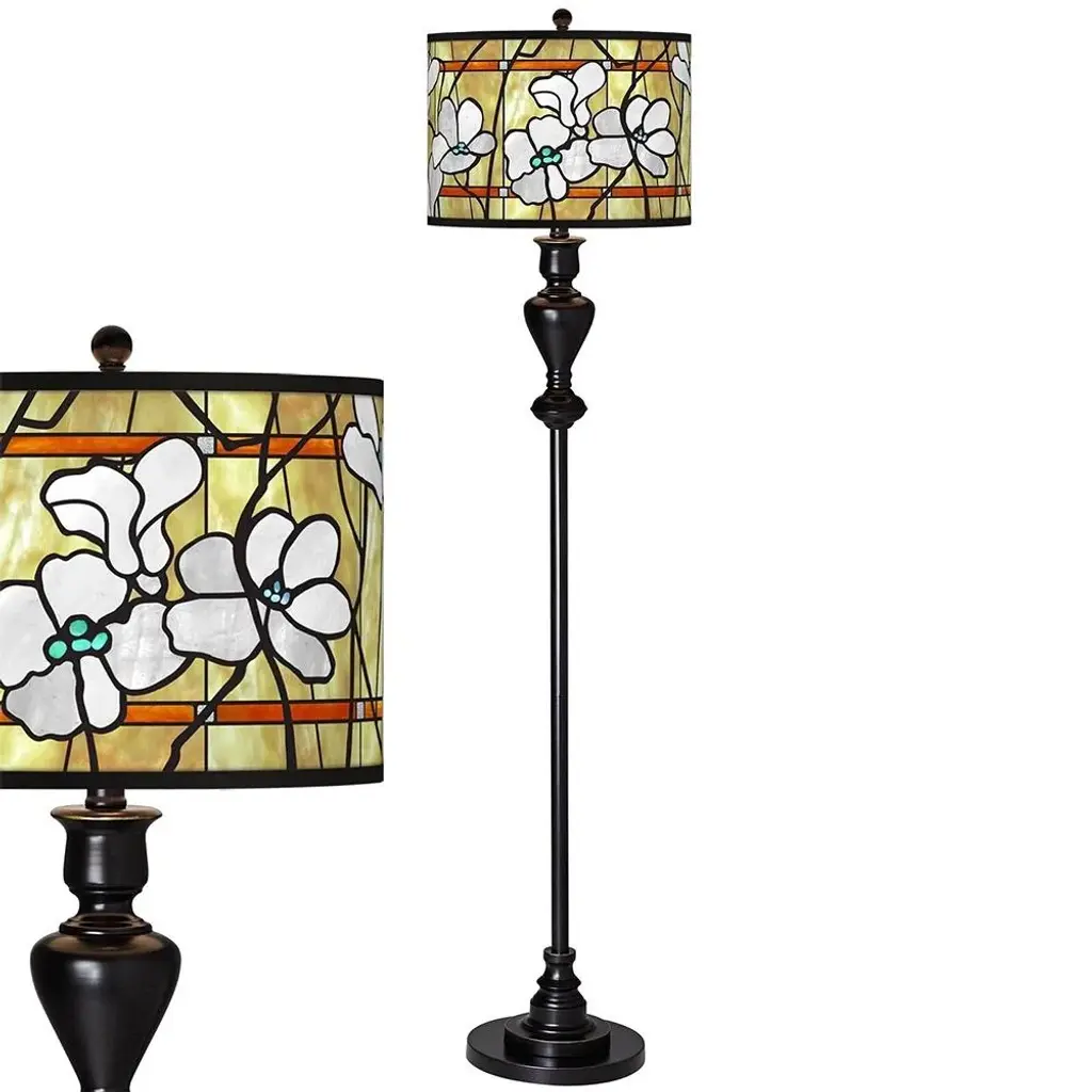 PRODUCT DETAILS: Overall: 58" high. Shade is 13" wide x 10" high. Base is 10" wide. Takes one maximum 150 watt bulb (not included). Stylish floor perfect for living rooms, family rooms, and more. Black bronze finish with soft gold edging. Metal construction. Custom-printed giclee lamp shade with Magnolia Mosaic pattern. Please note, the shade uses a printed pattern and not actual glass. DESCRIPTION: Add a stylish and unique accent to your living space with this shapely floor lamp which is topped off with our patented Magnolia Mosaic pattern giclee shade. Warm light shines through illuminating the pattern and creating a truly distinctive look.