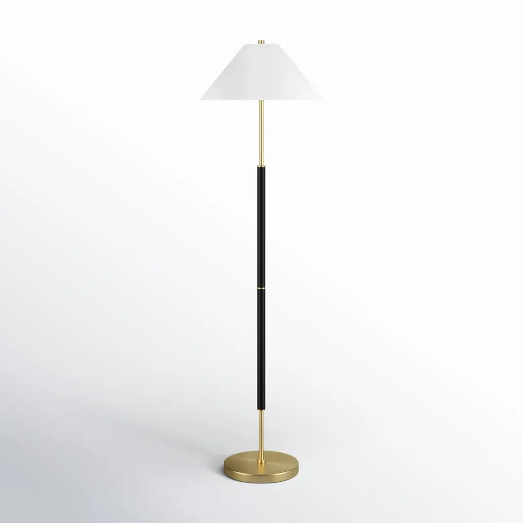 Part of the Mahari collection, this imposing floor lamp will be particularly suitable for a large contemporary study, a modern living room, or an eclectic entryway. Its structure is minimalist and sophisticated and crafted of brass with a glossy finish. The lightbulb (not included) is an E27 57W. The striking lampshade in elegant black fabric measures 50 cm in diameter and can be made of cotton, silk or linen and in different colors. Customization available. Please ask the Concierge for options and pricing.