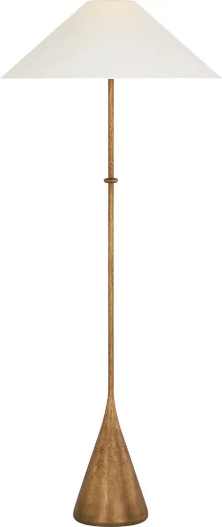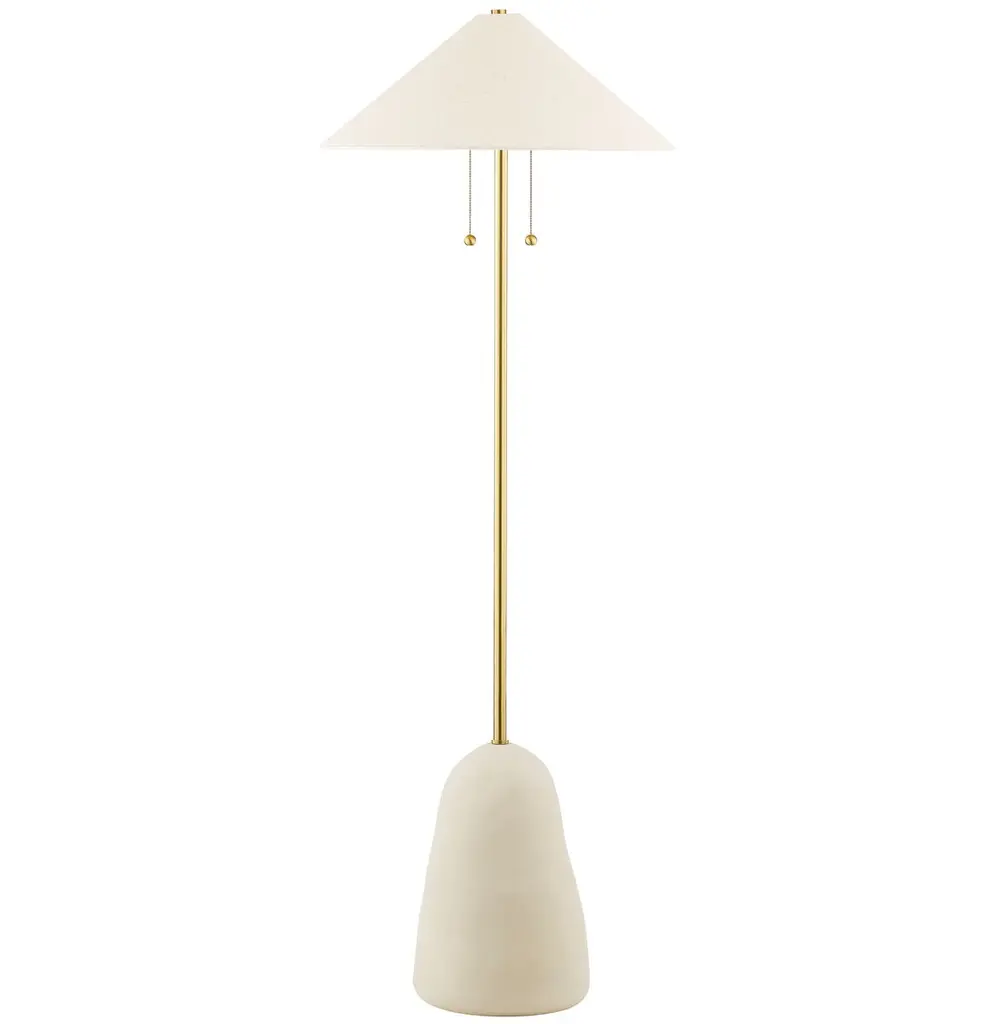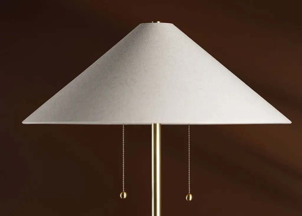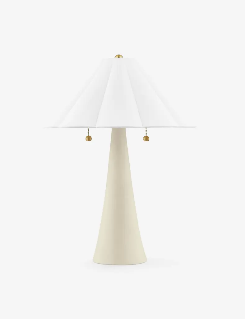 Capturing the designer's heritage, Maia is both intimate and intriguing. The perfectly imperfect ceramic base represents a Brazilian mountain, and the angular shade evokes the roof of a traditional Korean home. Aged brass accents give this natural, neutral beauty a hint of shine.