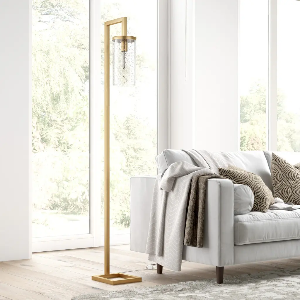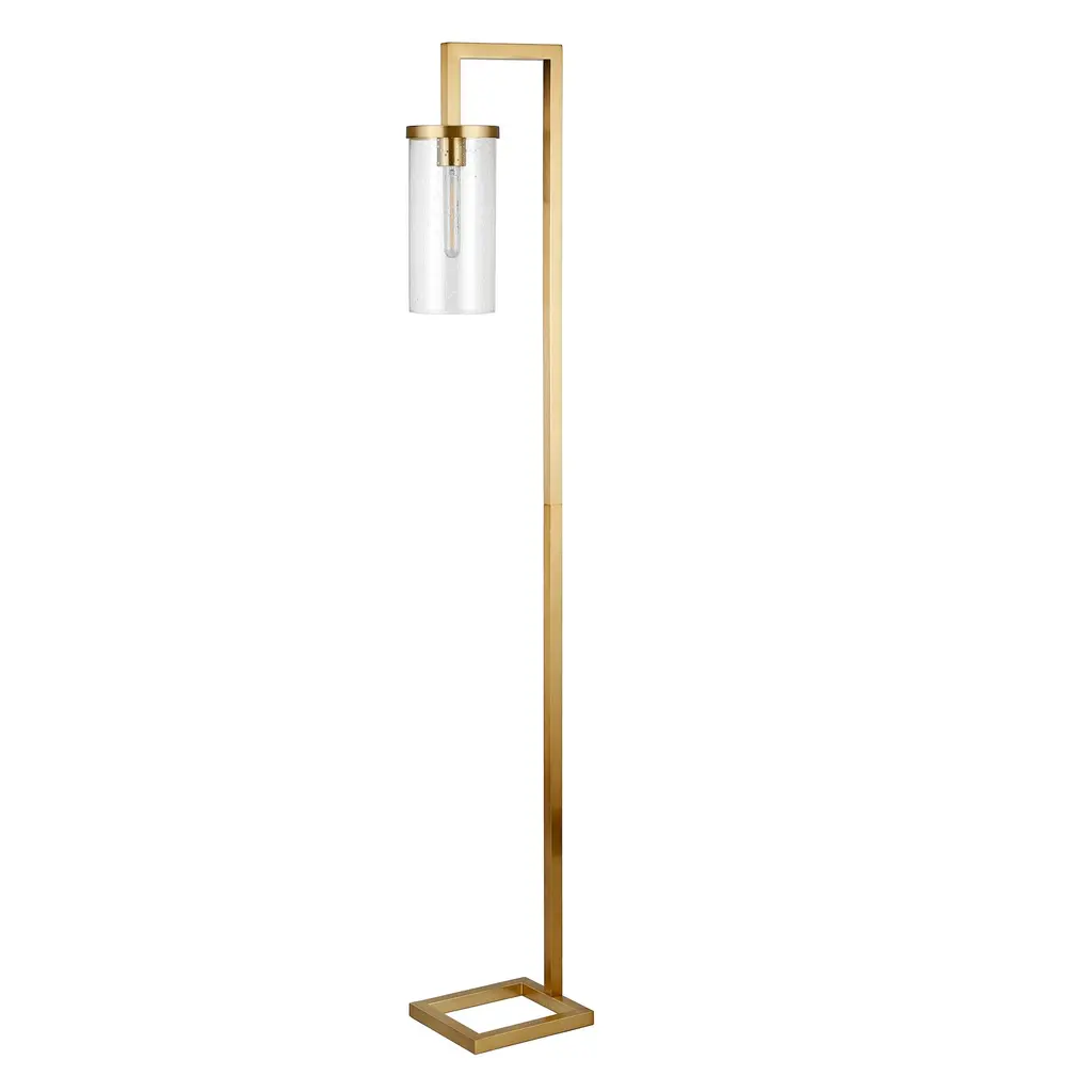 Illuminate your space is clean, modern style with this versatile floor lamp. Crafted of steel in a neutral metallic finish, this lamp strikes a clean-lined hook-shaped silhouette on an open square base. Suspended from its arced top, a glass cylinder shade diffuses ambient light as it’s dispersed throughout your space.