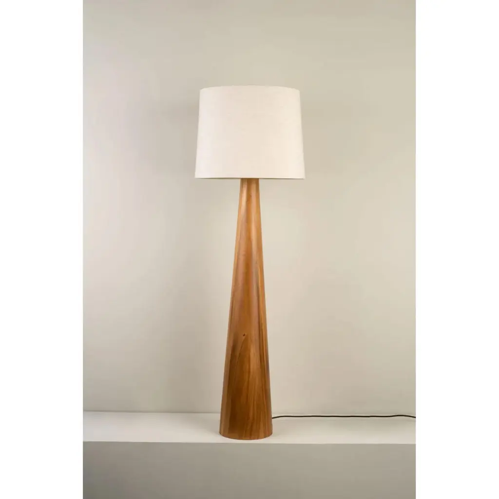 Malva Contemporary Parota Wood Floor Lamp with Linen Shade by Isabel MoncadaDimensions: Ø 50 x H 160 cm.Materials: Turned parota wood, fiberglass and linen.The cone is a balanced geometric figure. Malva is minimalist, with stable and sturdy wood. The lampshade is just slightly broader at the bottom than it is at the top, so it maintains the conic silhouette brought by the base. Its simplicity adds to its presence. Turned parota wood and lampshade with fiberglass and linen.All our lamps can be wired according to each country. If sold to the USA it will be wired for the USA for instance. Please contact us. Isabel Moncada is a Mexican designer specialized in lighting.By exploring and finessing traditional manufacturing techniques, Isabel has developed her own mechanisms and transformed materials to improve her designs as well as carve out her personal style.