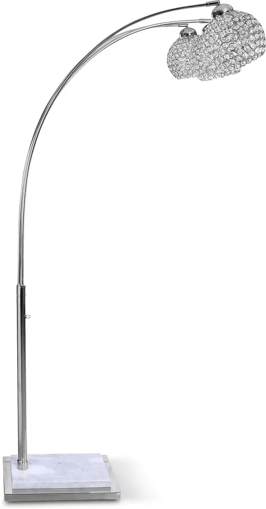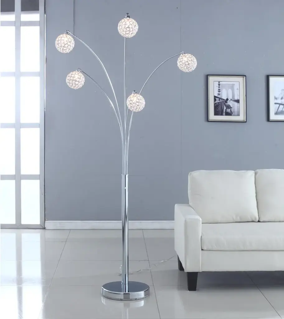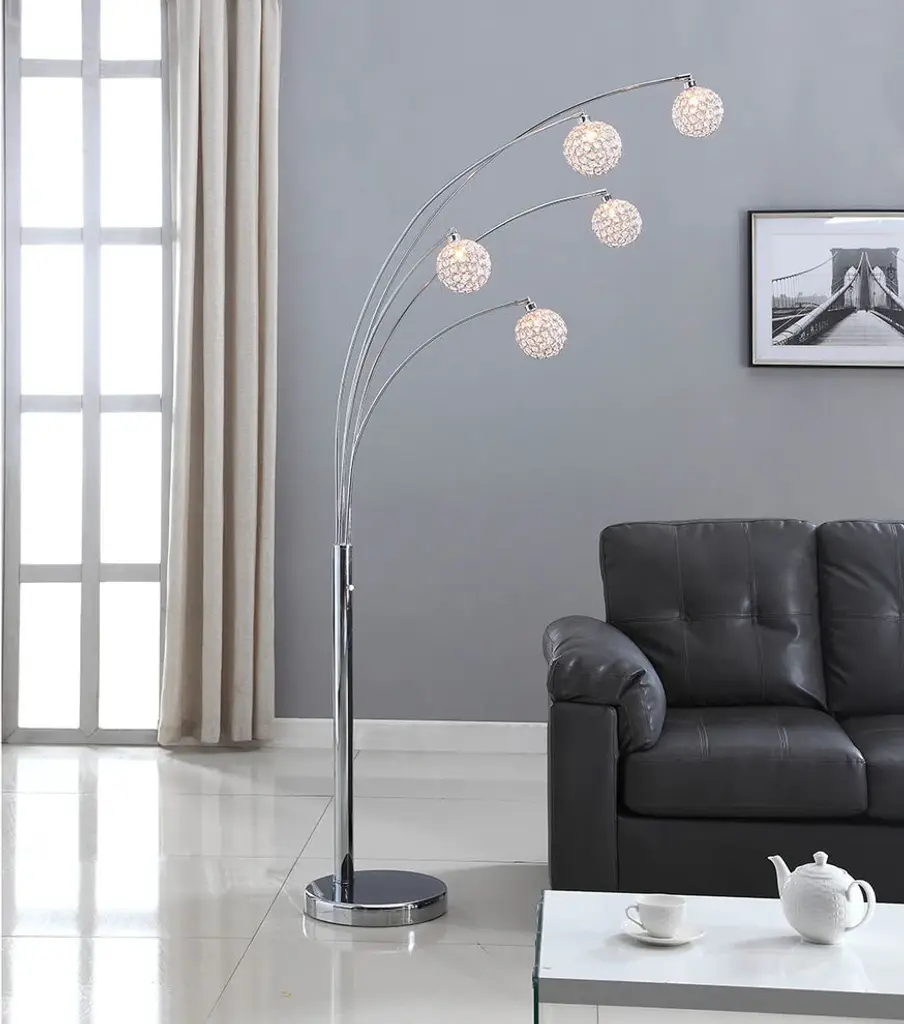 Light up your living room, bedroom or office with the "Manhattan" Modern chrome 5-Arch crystal balls floor lamp form Artiva USA. Its clear handcrafted crystal balls shine beautifully in the light, providing a warm and inviting tone to any room. This lamp is perfect addition to your home. Its features on adjustable Arch that allows you to spread the light apart.Comes with dimmerFull-range dimmer switchHandcrafted crystal ballsModern chrome 5-ArchSuper bright dimmable halogen Bulbs IncludedSwitch Type: DimmerNumber of Lights: 5Bulbs Included: No