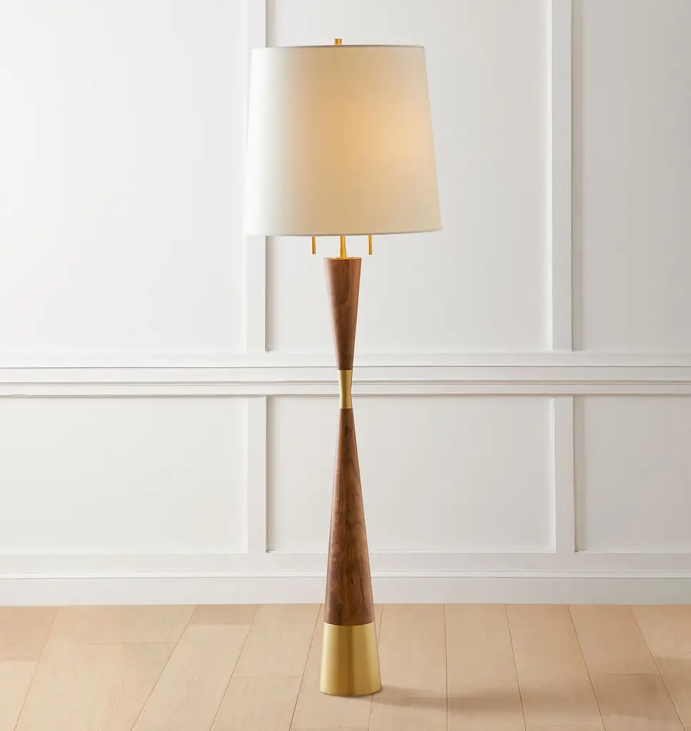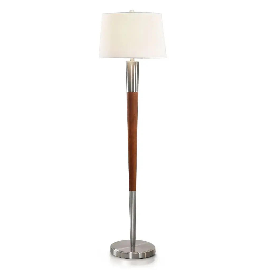 Accentuate your reading nook or writing desk with this sleek floor lamp. This lamp's tapered design and high-contrast walnut and nickel finishes combine to create a chic, contemporary look, while the fabric shade diffuses light for comfortable reading or conversation. An LED-compatible socket gives this lamp energy-efficient lighting options. Light Bulb Type: Incandescent Lighting Type: Floor Lamp Product Features: UL Listed, LED Compatible Material: Metal, Fabric Lighting Shade Color: white Height: 23 in or more Shade Shape: Empire Switch Type: Rotary Switch Bulb Wattage: 150 W Shade Material: Fabric Number of Lights: 1 Light Bulb Shape: A19 Setting: Indoor Lighting Style: Contemporary, Modern, Transitional Finish: Nickel Finish, Brushed