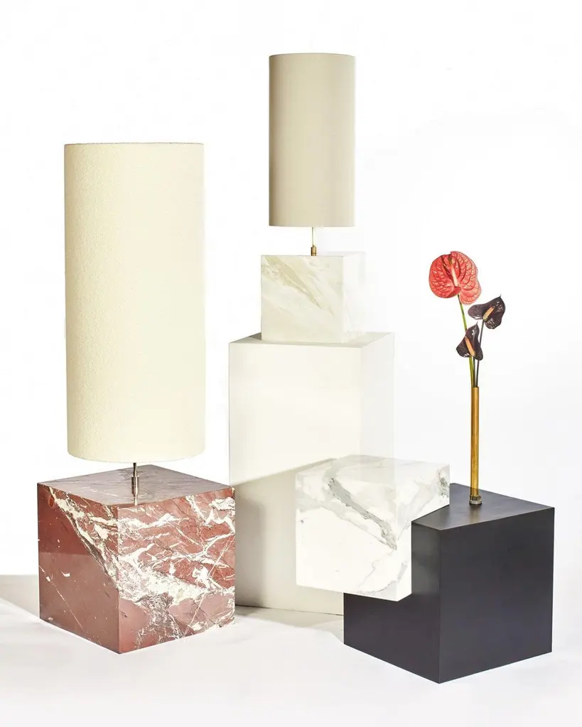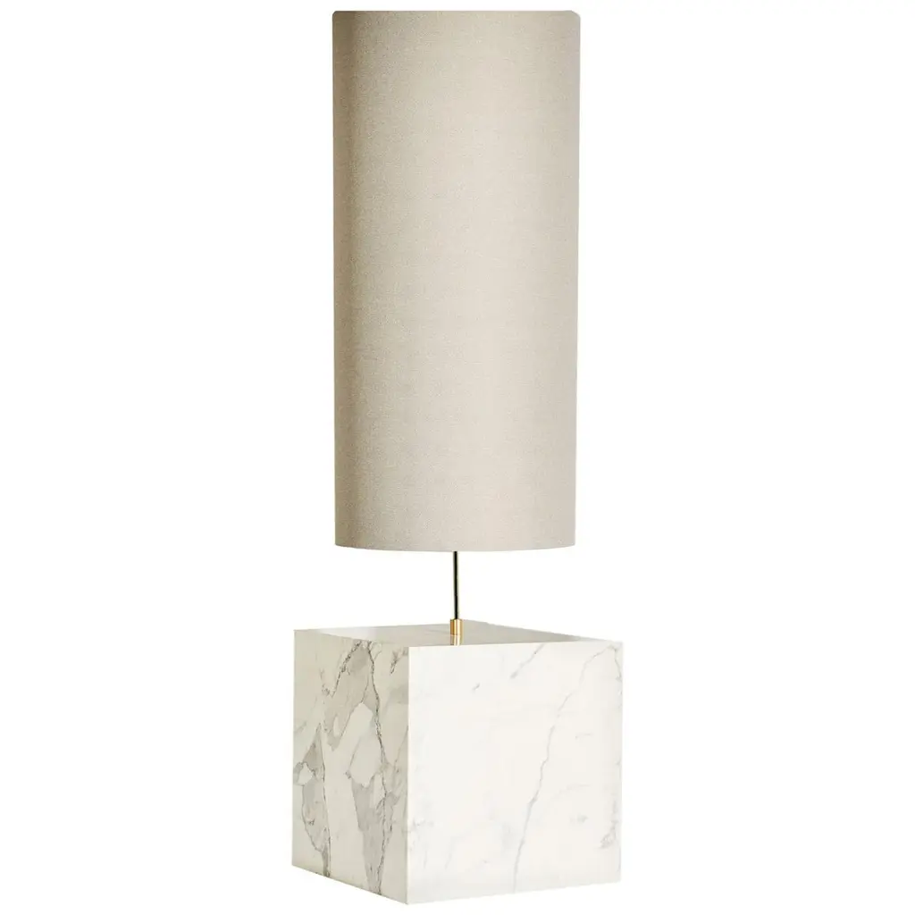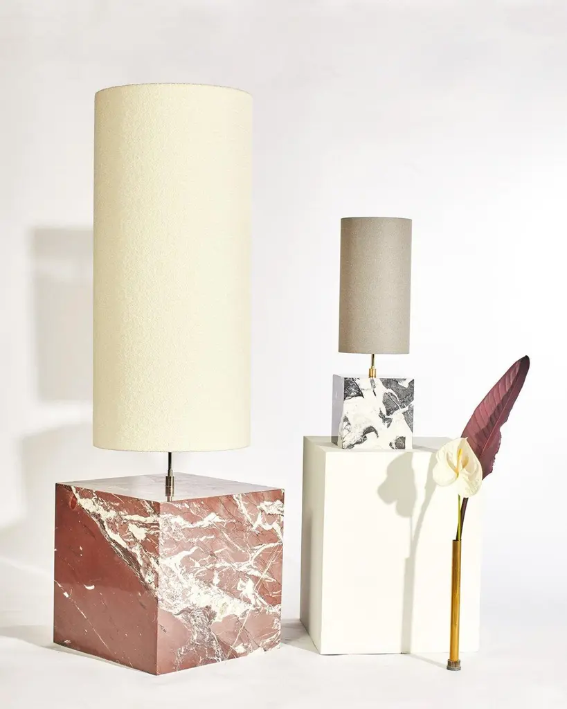The Coexist floor lamp consists of a marble cube base and a lampshade made from boucle fabric.The special lamp serves as a sculptural centerpiece for any room, emitting a soft warm light to draw the viewer into the materials. The bold geometry of the cube base unites with the soft curves of the lampshade to create a harmonious contemporary piece that plays with the simplicity of these primitive shapes. The handcrafted marble base is created from remnants of marble, salvaging odd sizes, and broken slabs for new uses. The Coexist floor lamp is the outcome of a thoughtful design procedure that gives a new lifecycle to exquisite materials in a bold and unique way. This piece is designed and manufactured locally in New York City.This piece can be customized concerning marble options.