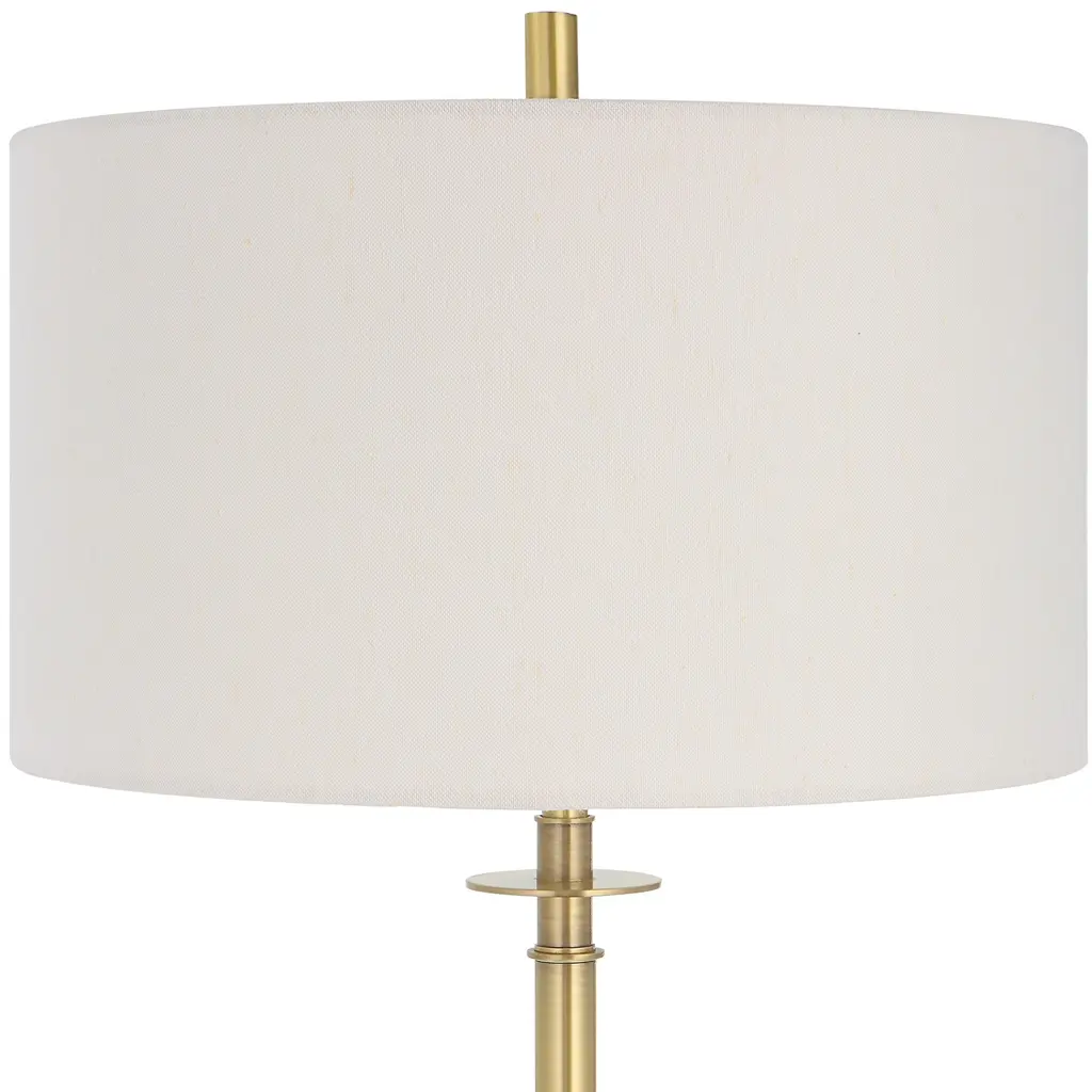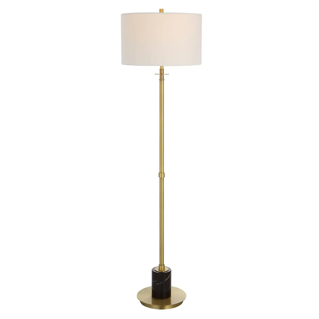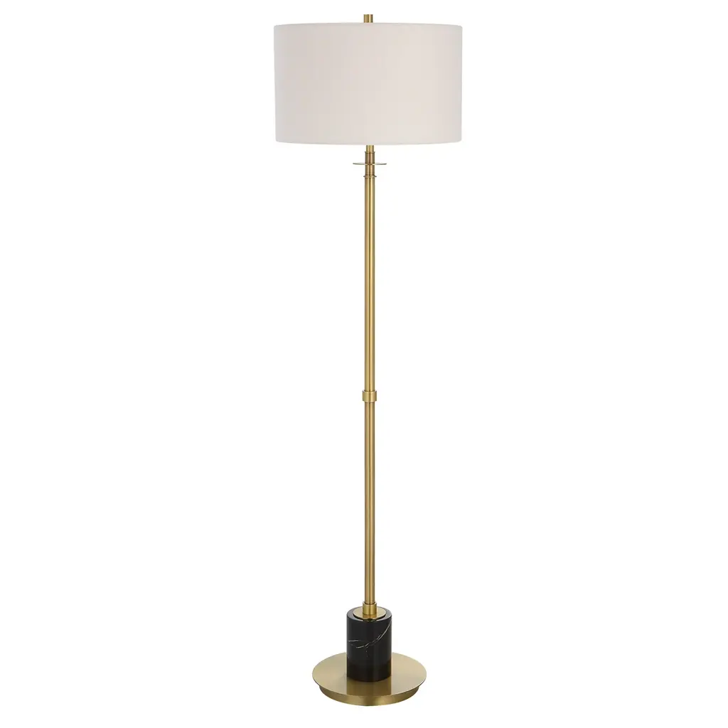 Elevate your living room with this sophisticated design and sleek base in a lightly antiqued plated brass finish. A substantial marble column adds a touch of opulence. The round hardback shade, covered in fabric, perfectly blends contemporary design with classic elegance, creating a timeless allure for your space. Product Features: Floor lamp with round shade Antiqued plated brass base Black marble column above the foot Hardback shade is covered in a white linen fabric Lamp uses (1) 150-watt E26 bulb - not included Socket type: 3-way Switch type: socket switch UL listed for indoor use only Dimensions: Overall dimension: 65" high Shade dimension: 10" high x 17" diameter Base dimension: 11" diameter Material(s): iron/marble/linen fabric
