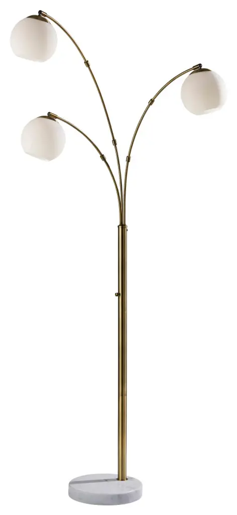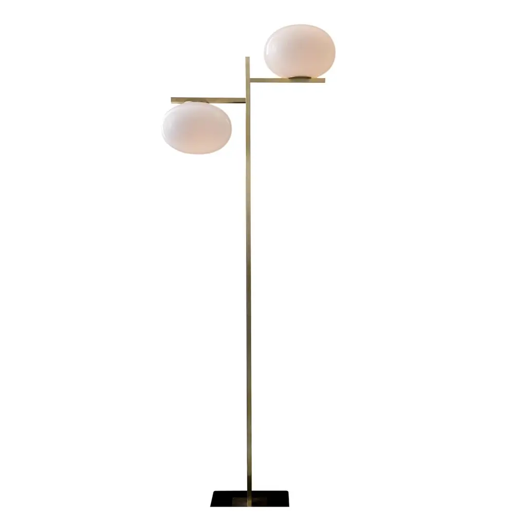 Floor lamp 'Alba' designed by Mariana Pellegrino Soto in 2017.Floor lamp giving diffused light in polished opaline blown-glass. Satin brass or anodic bronze finish structure with rectangular profile. With universal dimmer.Manufactured by Oluce, Italy.The concept of Alba starts with a very simple element: the designer’s imagination was inspired by a drop of water – which she puts to use in different ways, depending on the model. References to the world of nature, with soft shapes contrasted with square lines, together with the use of a satin brass finish and anodic bronze finish, combine to create Alba, a family with a strong visual impact.Two floor-standing versions with a large rectangular-section stem with a satin brass finish and anodic bronze finish arises from an anthracite base. In the first version, an arm branches off from the top, with a sphere suspended underneath it, while in the second, two arms of different heights, on each side, support the luminous drops, one from above and the other from below.Materials and color:Opaline blown-glassSatin brass or Anodic bronzeVariations:Available with one arms.Available as a table and wall lamp models.Technical information:2 x max 60W (E27)This lamp is wired for Europe, if used in US or any other country the client will need to convert it.Founded in 1945, Oluce is the oldest Italian design company in the lighting sector still in operation today. Oluce lighting’s design aesthetic is crisp, linear, and decorative. A subtle, intellectual beauty that over the years has led the company to produce some of the more recognizable and admired iconic lighting in the world. Oluce, already participating at the 9th Triennale in Milan, throughout its long history, has received numerous acknowledgements including two Golden Compass awards, two Design Awards and the Gold Medal at the 13th Triennale in Milan. Its lamps appear in the most important permanent design collections worldwide.Oluce’s expertise reveals its unparalleled manufacturing excellence which transforms into objects an untiring technological research into the potential of light. Each lamp is a milestone along this journey. Over time, from unusual materials, original designs and new lighting sources ensued revolutionary iconic designs by Tito Agnoli, Joe Colombo, Marco Zanuso, Ostuni e Forti, and Vico Magistretti, who since the 50s, have been rewriting the history of lighting. Recent collections reaffirm Oluce design and decorative approach, expressed through the signs by Italian and international designers such as Angeletti & Ruzza, Francesco Rota, Nendo, Victor Vasilev, Nicola Gallizia, Christophe Pillet, Mist-o and David Lopez Quincoces.