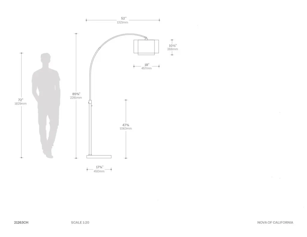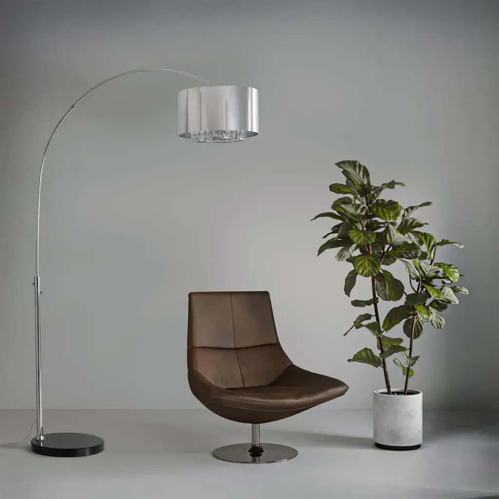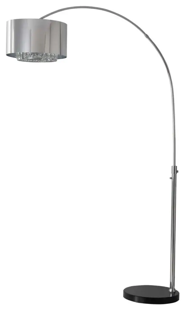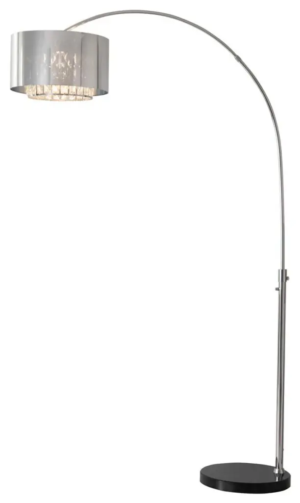 Exuding a clean, modern, and thoroughly glamorous appeal, the Marilyn 1 Light Arc Floor Lamp commands attention as a dramatic centerpiece in any living area. With its cut crystals nestled beneath the reflective shade, this lamp luxuriously glistens and shimmers, casting an enchanting pattern of light across the room when illuminated. When turned off, the reflective shade exhibits a touch of sophistication to your space. Dressed in a sleek chrome finish, the Marilyn 1 Light Arc effortlessly complements modern interiors. If you want to add a touch of glam to your home, look no further!• Clean, modern, and glamorous appeal, making it a striking centerpiece.• Cut crystals beneath the reflective shade create a glistening and shimmering effect, casting enchanting patterns of light when illuminated.• Mylar shade exhibits a reflective characteristic when the lamp is turned off, adding sophistication to your space.• Sleek chrome finishes seamlessly complement modern interiors to enhance your decor.• Natural marble base provides for elevated styling and a sturdy foundation. • Energy-efficient LED compatible.• Smart switch compatible - effortlessly sync with Amazon Echo, Google Assistant, and Apple Home for easy & automated control.• Contract grade: high quality materials, quality workmanship, built to last a lifetime & designed in Venice Beach, California. • NOVA of California is the oldest light company in North America and has been making original contemporary designs for 100 years. • Sustainability statement: We are committed to minimizing the unwanted impact our business has on the environment. We care for our planet.