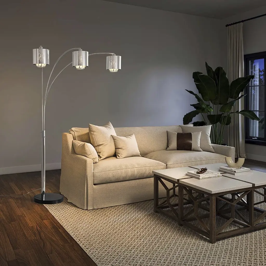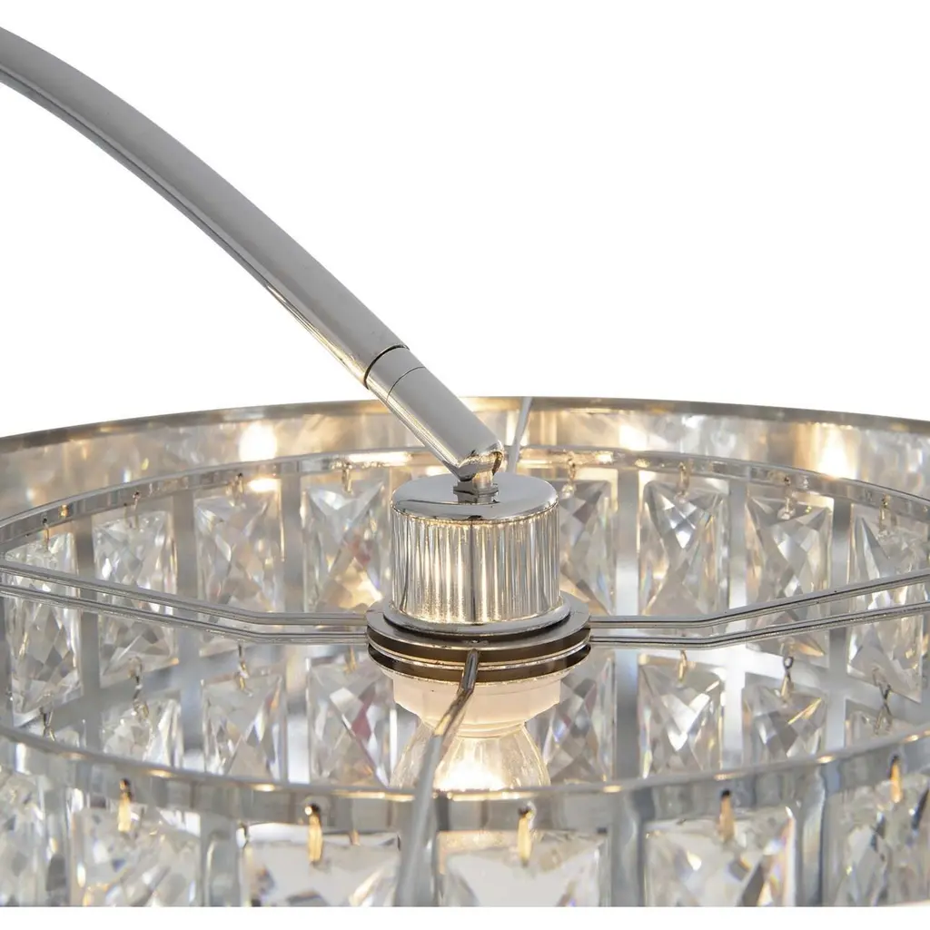 The Marilyn 3 Light Arc Lamp features cut crystals hidden behind sleek mylar shades. When turned on, the crystals shimmer and glisten, creating a pattern of light. When turned off, the mylar shades become opaque. Finished in polished chrome, the Marilyn 3 Light Arc is a glamourous, modern and dazzling addition to living spaces. When used in conjunction with a smart switch, Marilyn 3 Light Arc is compatible with Amazon Echo, Google Assistant, and Apple Home, and can be automatically turned on/off manually, by voice activation, or by scheduled settings.