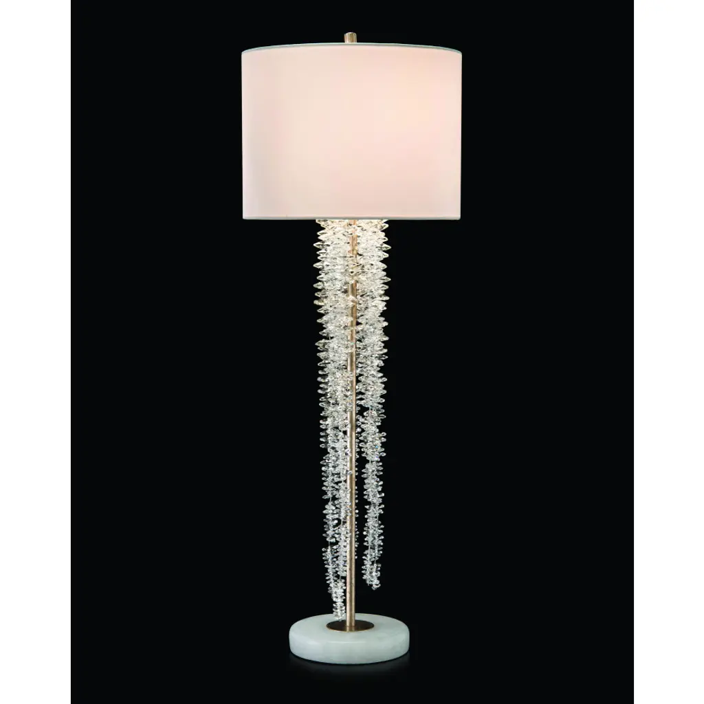 This floor lamp, sitting upon a crystal base, is veiled in sparkling strings of solid-cut marquise crystals.