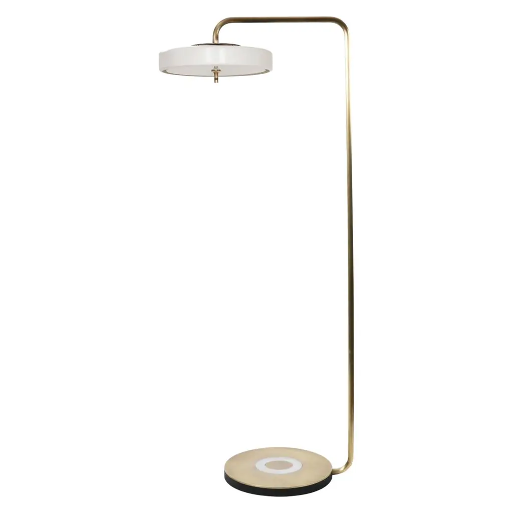 Marshmallow floor lamp, Royal Stranger. Dimensions: 180 x 114 x 65 cm. Material: Polished brass structure standing on the top of a Carrara marble. (May be available separately in copper or stainless steel in polished or brushed finish.) A suspending lamp over a sofa or a reading chair, creating an effect of comfort lighting with its particular indirect projection, standing on the top of a thin metallic and elegant structure and touching the floor with the connection of a round shaped marble stone. This piece is attributed to the mentioned designer/maker. It has no attribution mark and no official proof of authenticity, however it is well documented in design history. I take full responsibility for any authenticity issues arising from misattribution, Up to 250V (Europe/UK Standard).