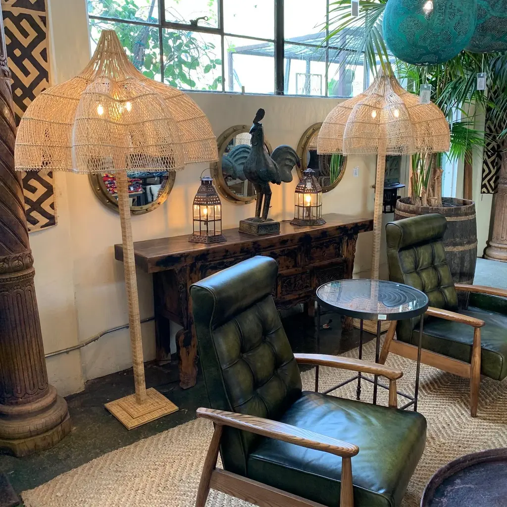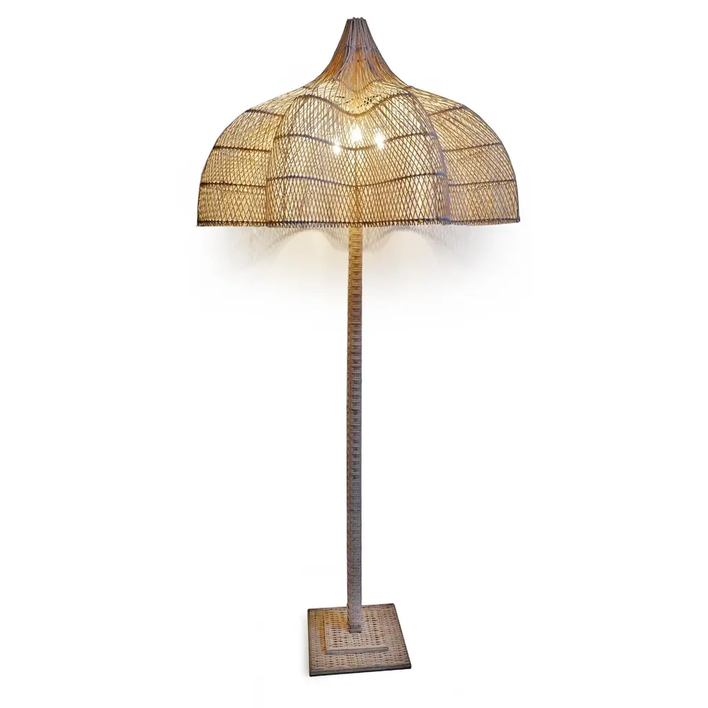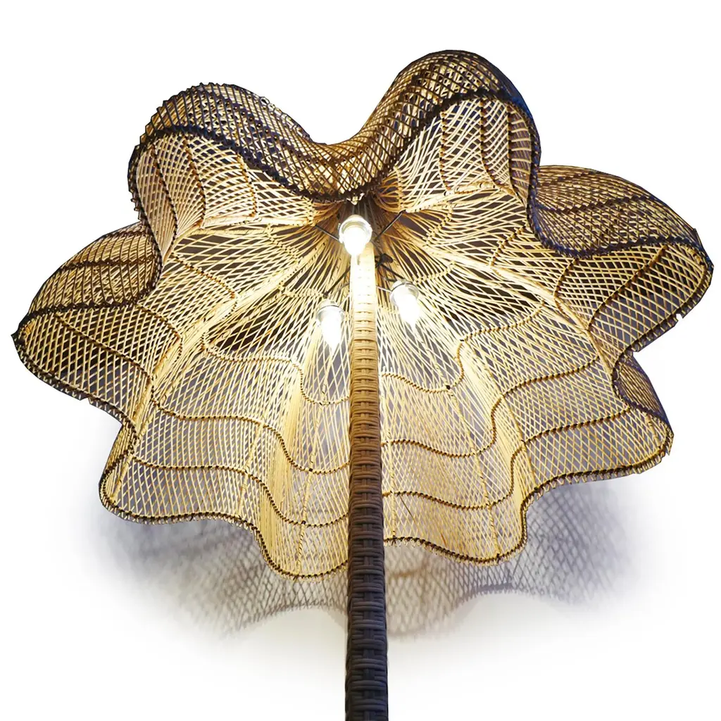 Stunning Matador ruffle shaped floor lamp. Impressive hand crafted raw wicker piece with organic shape and material. Three light bulbs encircle under the shade canopy. Each bulb 40 watt max ready to plug in.