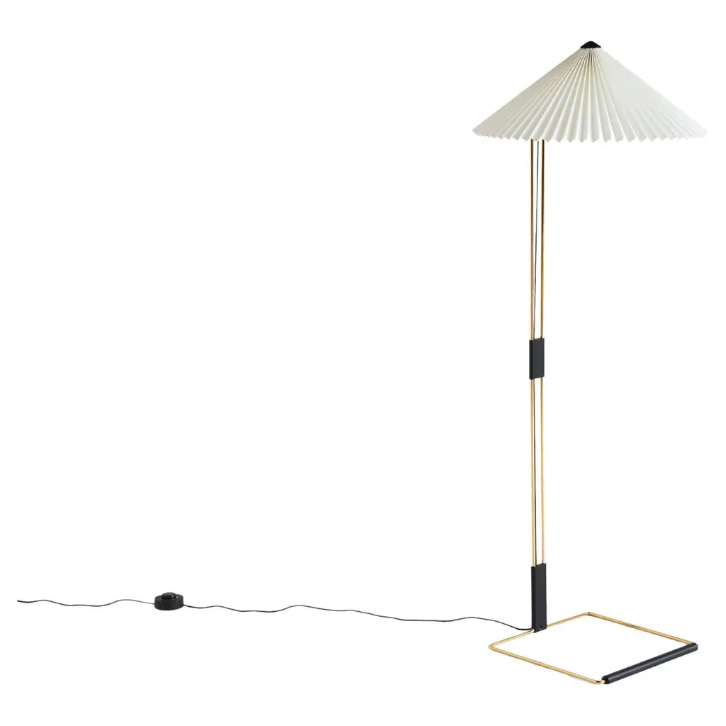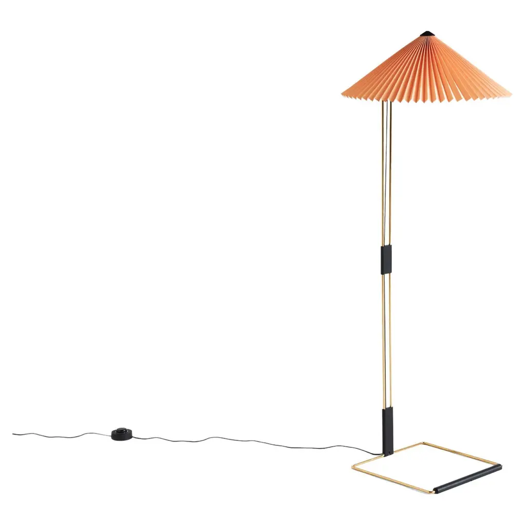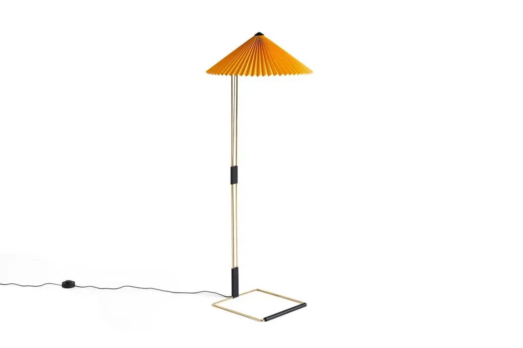 The Matin Floor Lamp offers a contemporary yet poetic design, with a construction that combines visual delicacy with physical robustness. The flat-packed design consists of a slender polished brass steel frame complemented with matte black hardware and zinc alloy joints at the base, which is paired with a pleated cotton shade in a variety of carefully selected colors. The light source is an integrated LED, offering a diffused light which is accompanied by a digital in-line dimmer floor switch to adjust the output of light if required.Dimensions:H129 cm / 50.8 in x W50 cm / 19.7 in x L50 cm / 19.7 inMaterial:ABS Cotton fabric laminated to a PVC sheetCord:270 cmBulb:Integrated LEDDimmable:YesSwitch:Inline floor switchIP:20Supply:220-240V DesignerInga Sempé is a French designer who lives and works in Paris. A graduate of the Ecole Nationale Superieure de Création Industrielle (ENSCI) in Paris (1993), she also took up a scholarship at the Villa Medici, Académie de France in Rome (2000 - 2001). She was awarded the Red Dot Design Award in 2007. Her work is known for a lightness of touch, for a strong personality and for a particularly tactile nature. The idea of everyday use is at the centre of Sempé’s approach and she often seeks out materials with special properties to answer the need of a daily function. For HAY, she has created the Matin Collection and Mousqueton Portable.