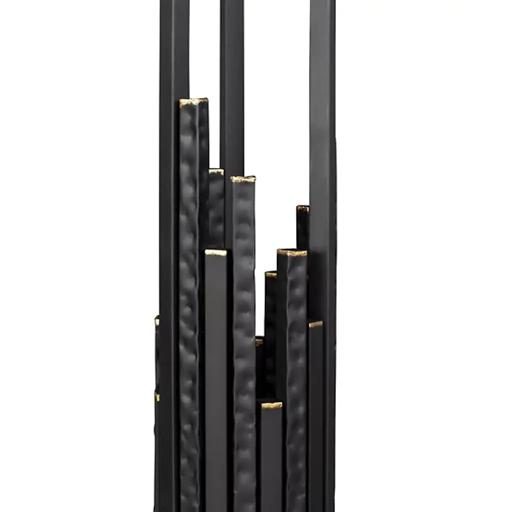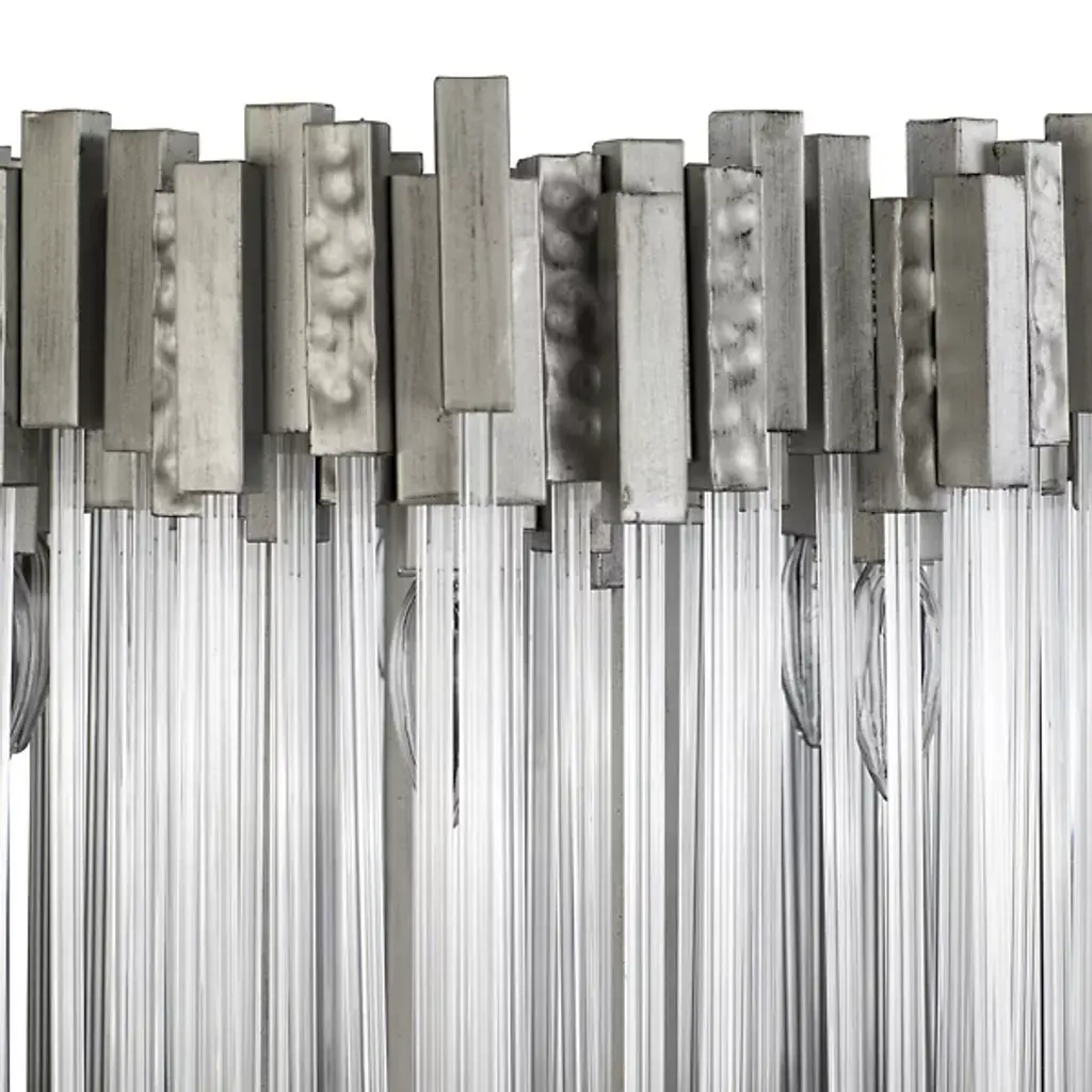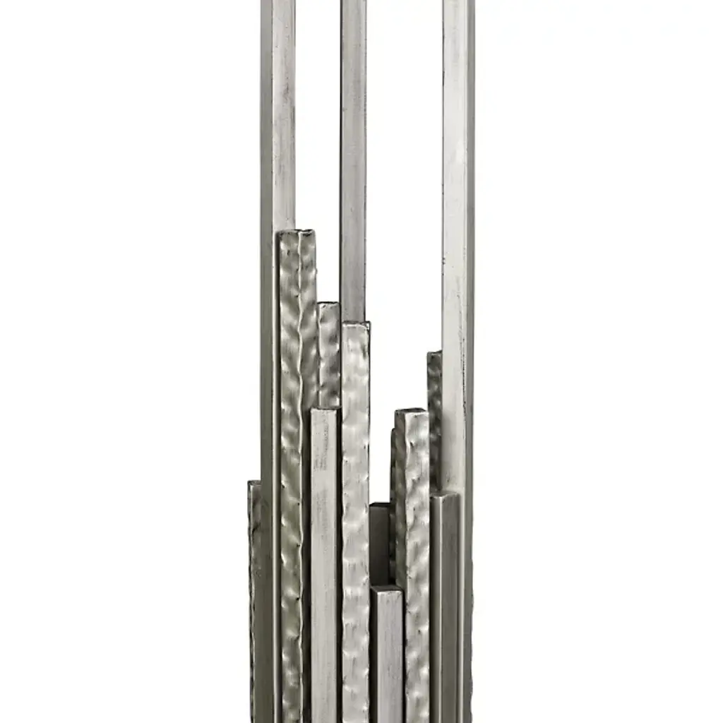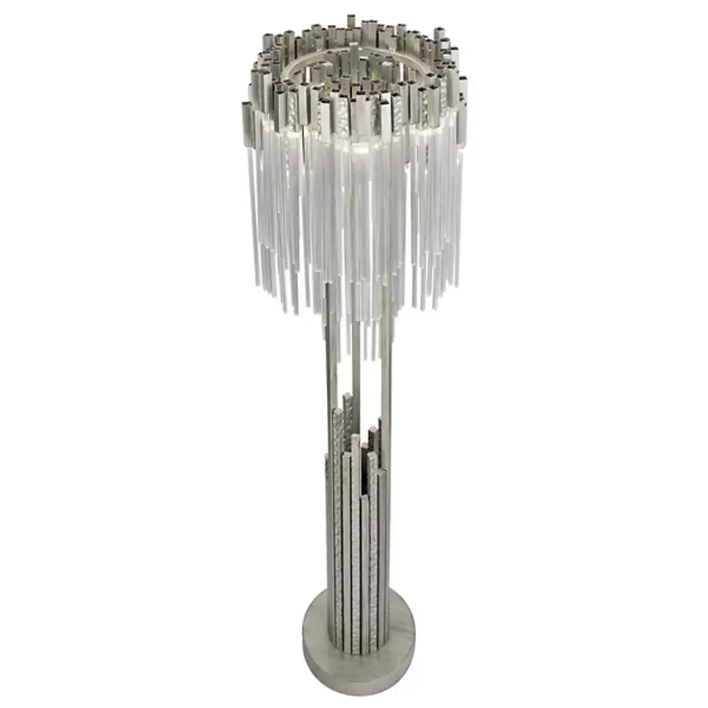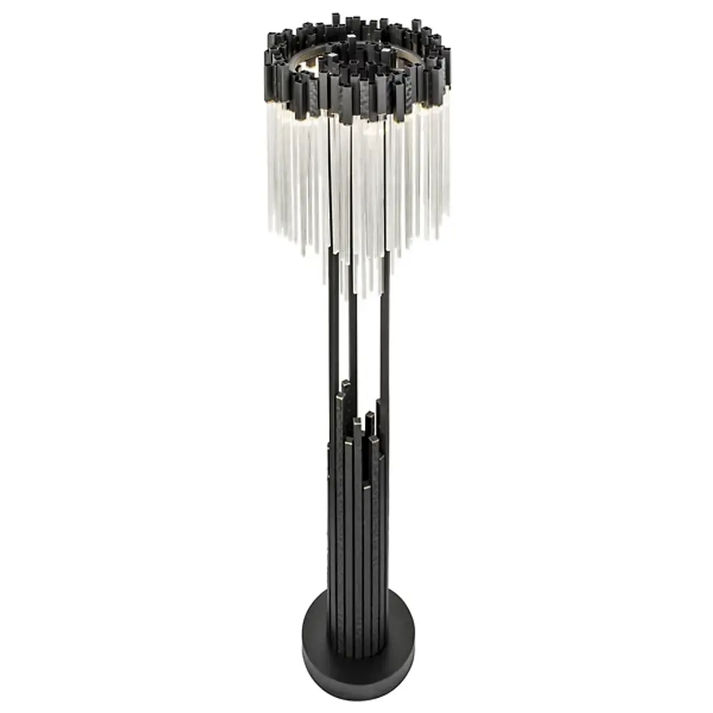 The Matrix Floor Lamp from Varaluz is designed by Ron Henderson. Crafted from hand-forged recycled steel, this sustainable expression of contemporary style is an artful statement piece. The fluted clear glass rods adorning the shade add an elegant touch to the lamp's aesthetic. Illuminate your space with brilliant LEDs that are dimmable when paired with a separately sold ELV dimmer. Capturing the glamorous look of the '70s, this lamp boasts randomly hammered design elements that showcase the drama of a cityscape.