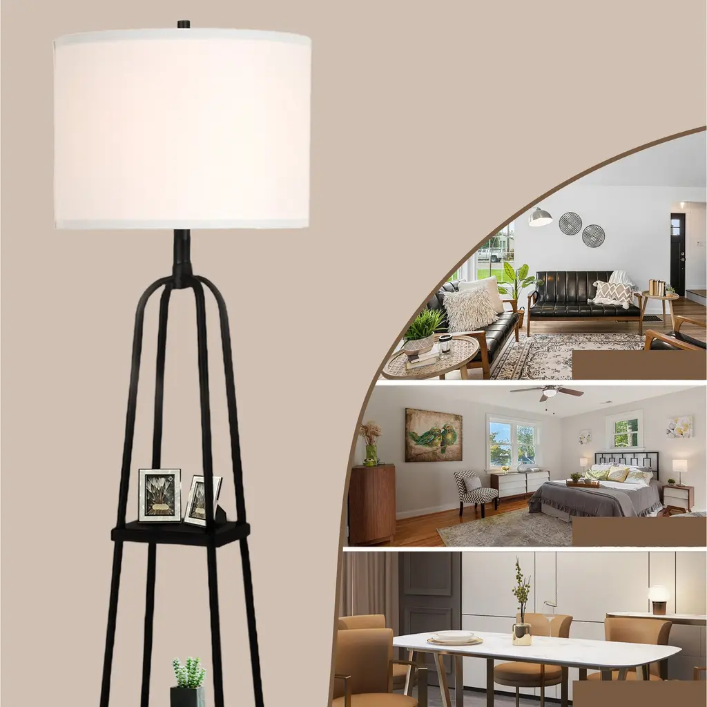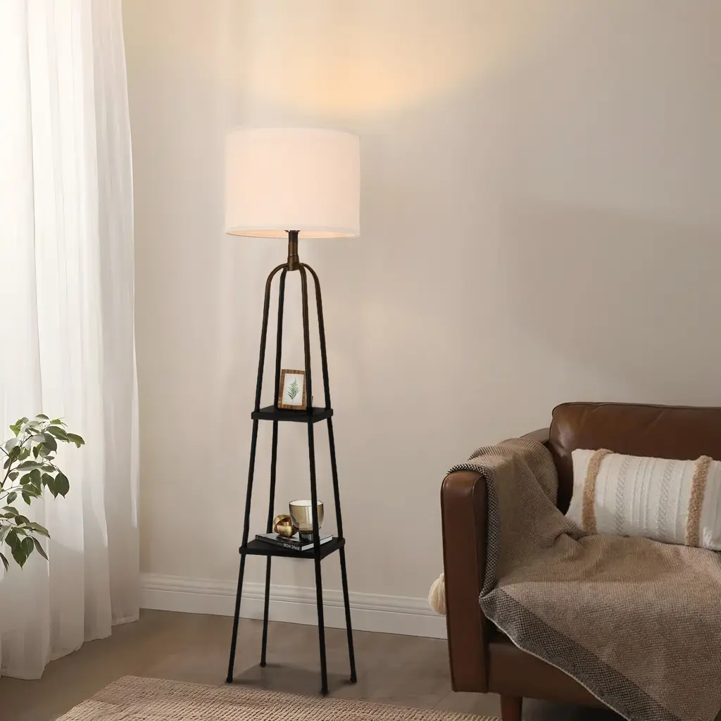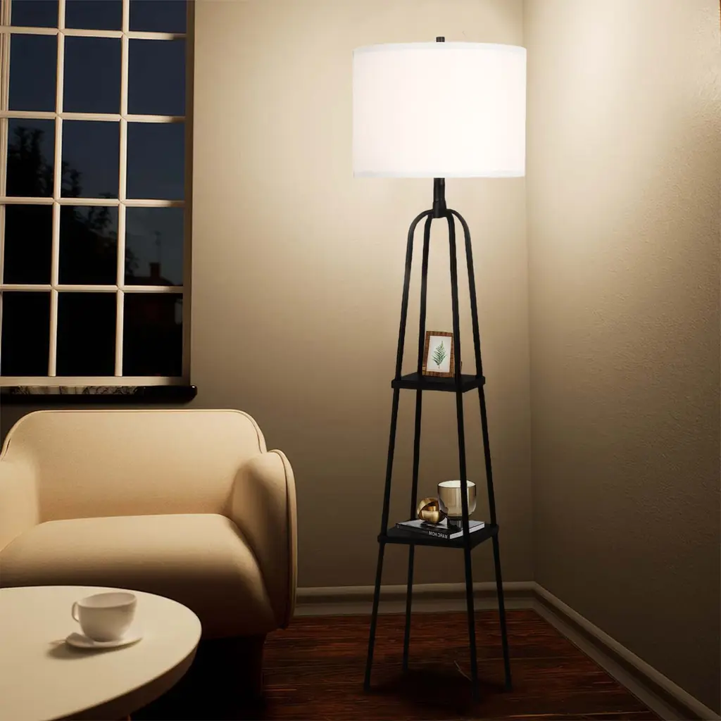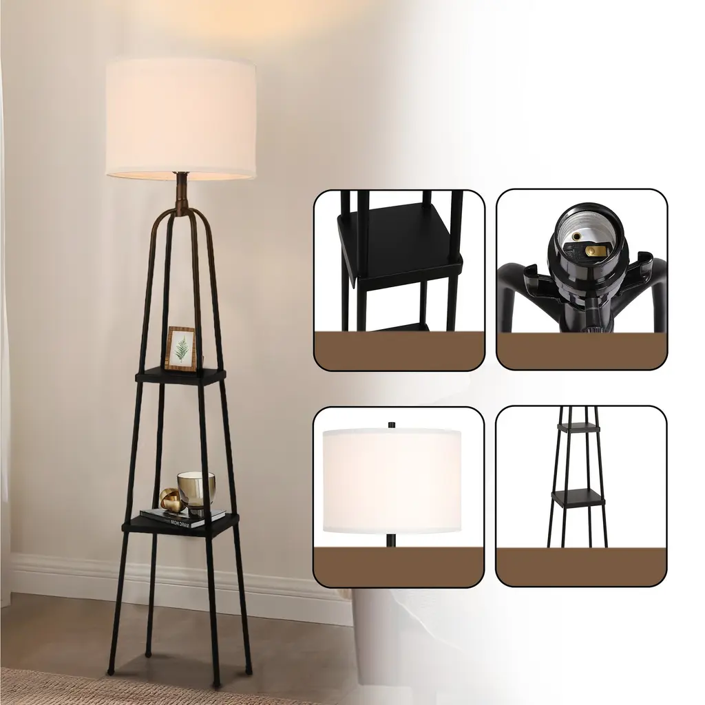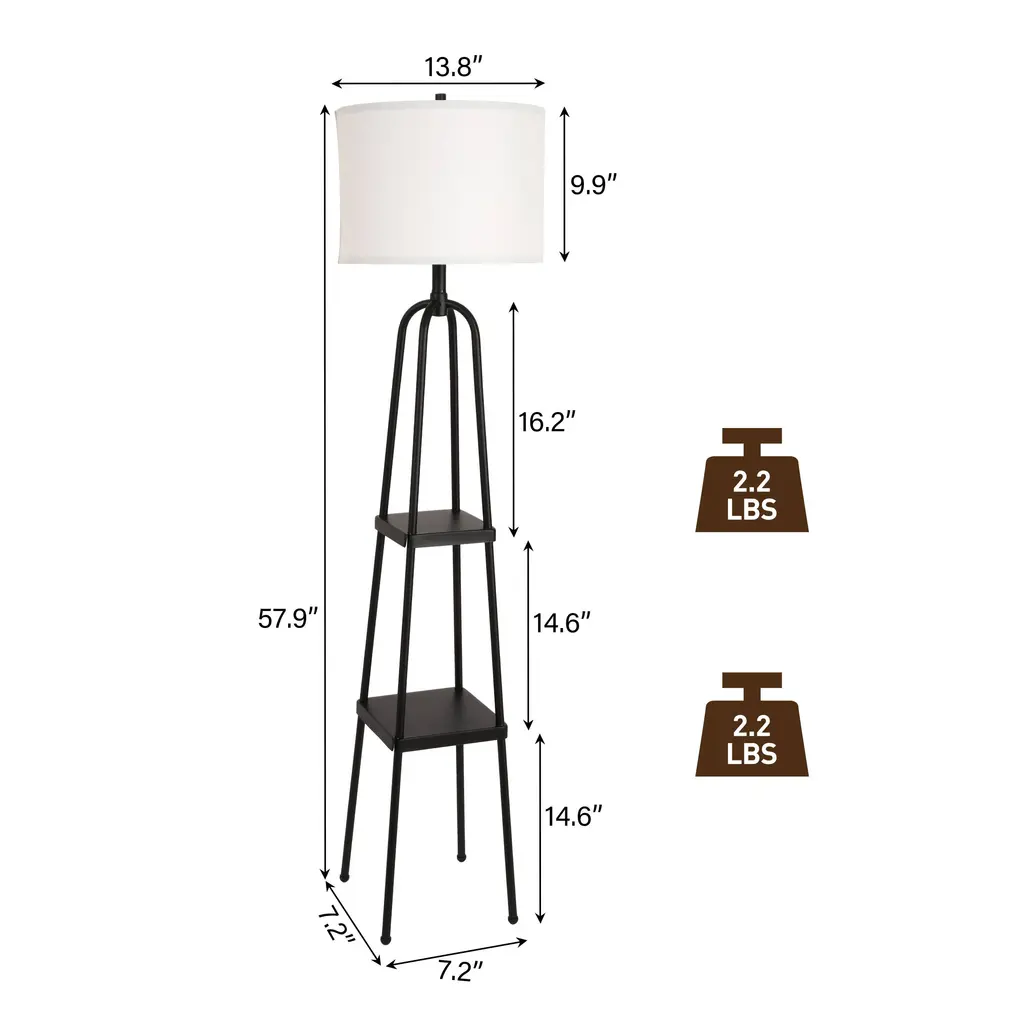 Need extra storage but don't want to scrafice style? This floor lamp's four matte black metal legs and two functional shelves offer the perfect solution. Store small items or display decor on the shelves, while enjoying the soft, ambient light from the linen lampshade. With this modern design and strong color contrast, this lamp makes a bold statement in any room. Assembly is a piece of cake, and it's the perfect way to brighten and organize your space. (bulb is not included) Features: With four solid black metal legs, this lamp provides a stable base while adding an industrial-chic touch to your space. It features two shelves that can hold up to 2.2 lbs each, making it both a lighting solution and a storage option. The linen shade diffuses light softly, creating an ambient glow that enhances your living space. The high-contrast, minimalist design adds a sleek, modern touch to your room. Assembly is quick and easy, and the lamp is sold without a bulb for customizable lighting options, you can simply get one E26 standard light bulb with 100 wattage maximum.