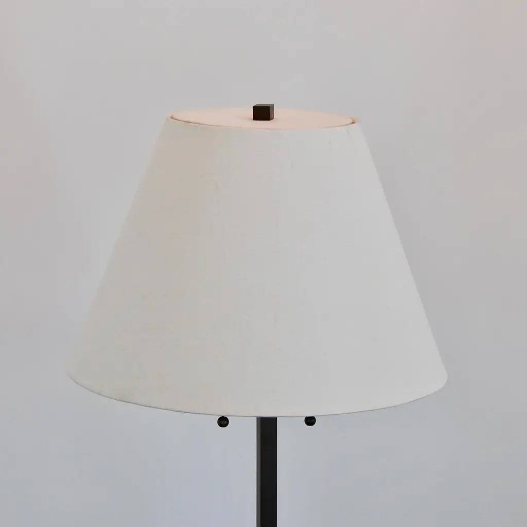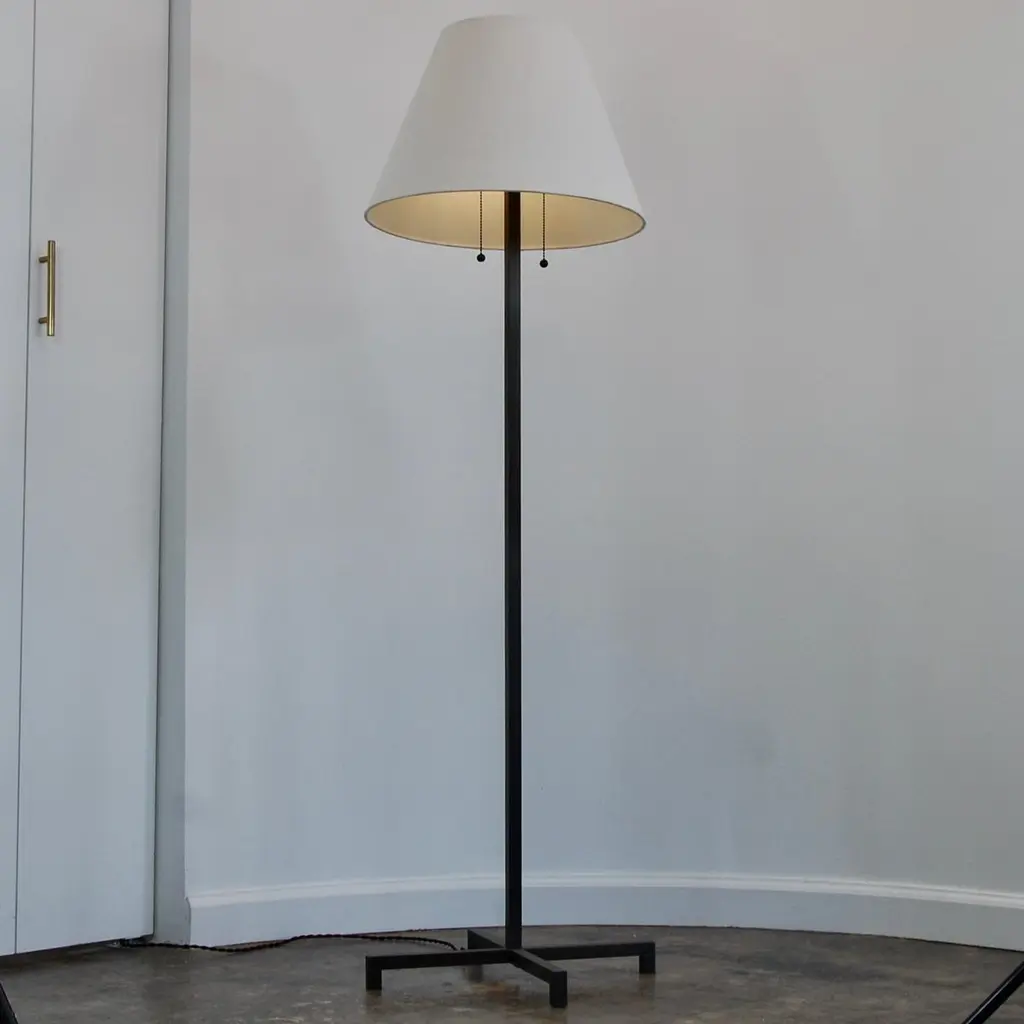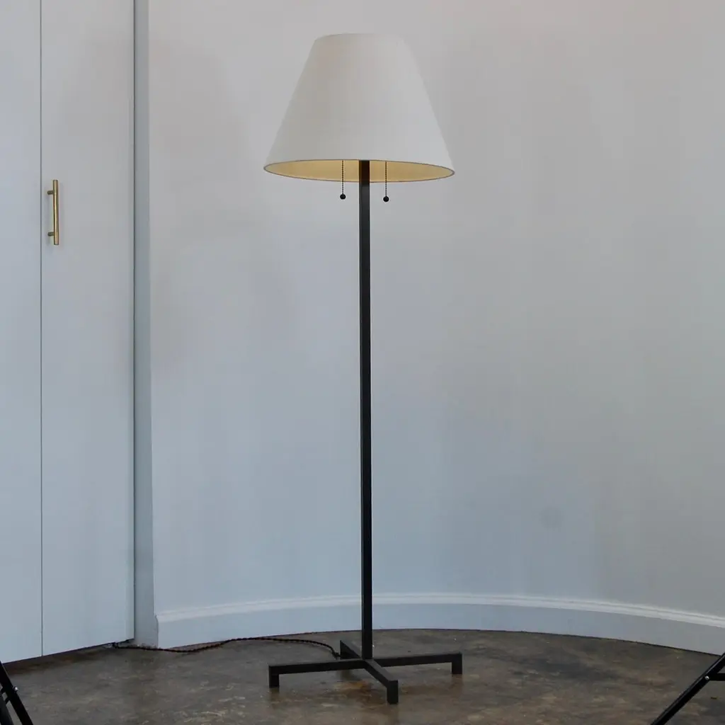 Elegant all-brass X-based mid-century modern inspired floor lamp. Detailed with a fabric shade, two pull switches from two E26 medium based sockets. Ready to be used in the USA. Finish: patinated brass. Measurements:Height: 52” Diameter (including shade): 16”X base: 17”.