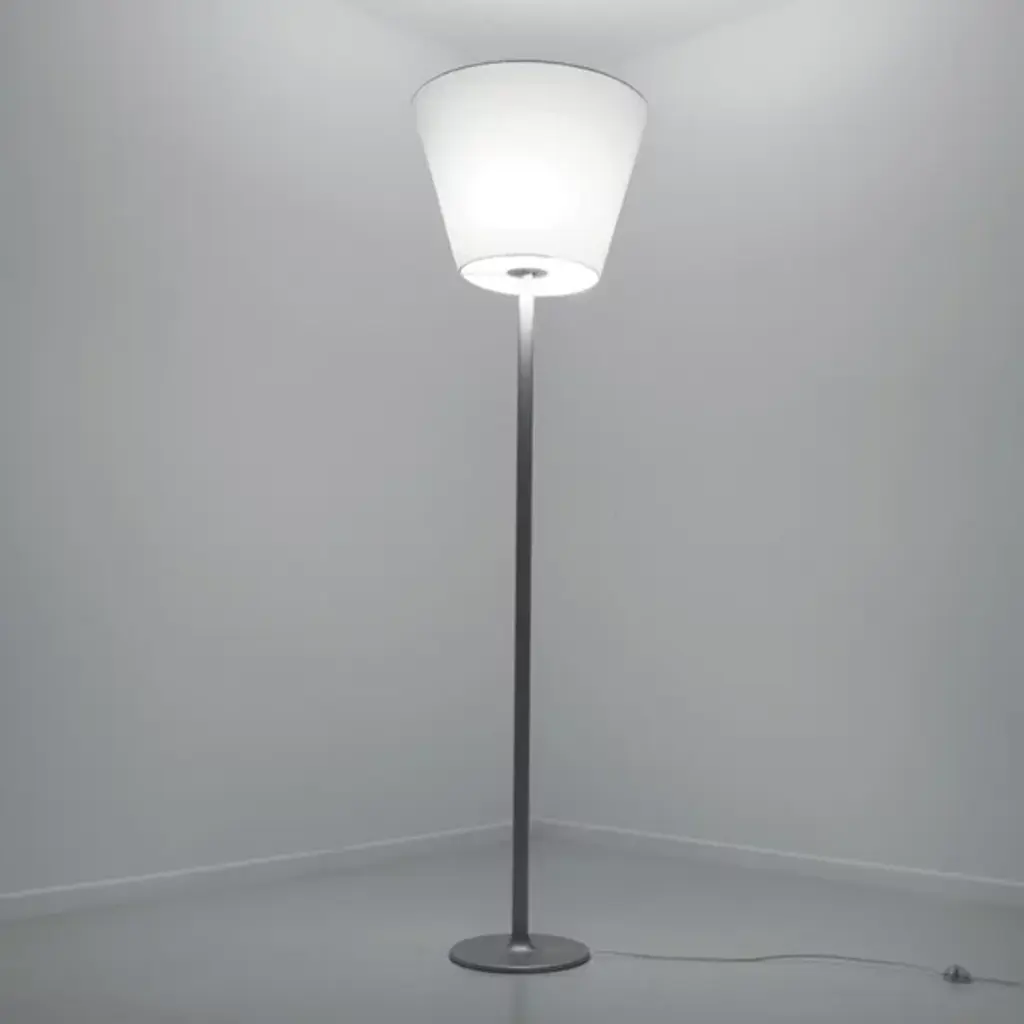 The Artemide Melampo Mega Floor Lamp pairs a large shade with a slim base for a grand impression in modern living rooms and other interiors. The flared silk shade can be positioned fully downward, tilted 35 degrees upward or turned completely upside down. Designed by Adrien Gardere. Available in a Bronze or Grey finish.