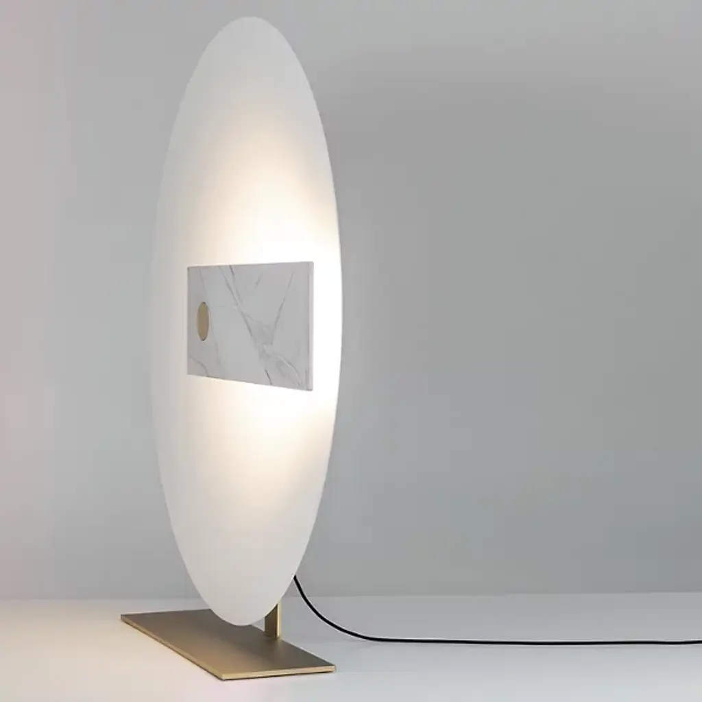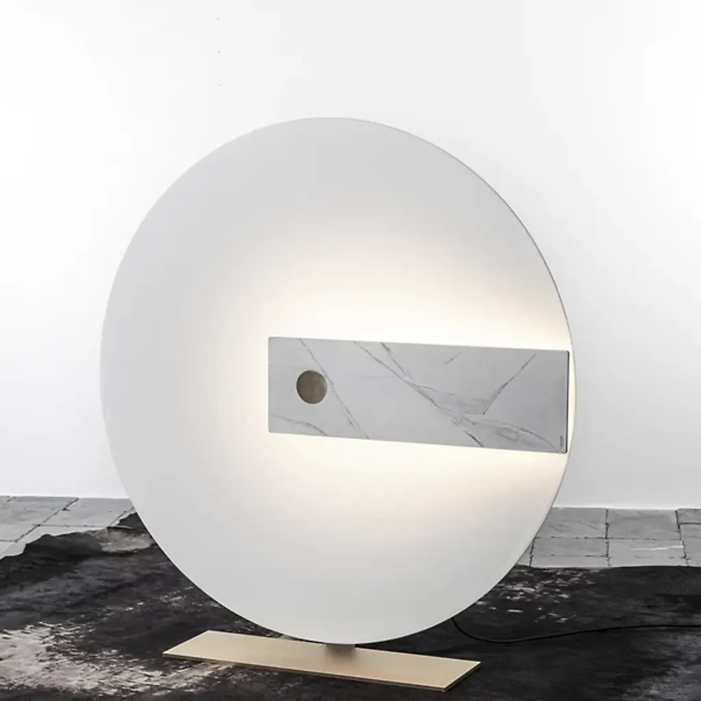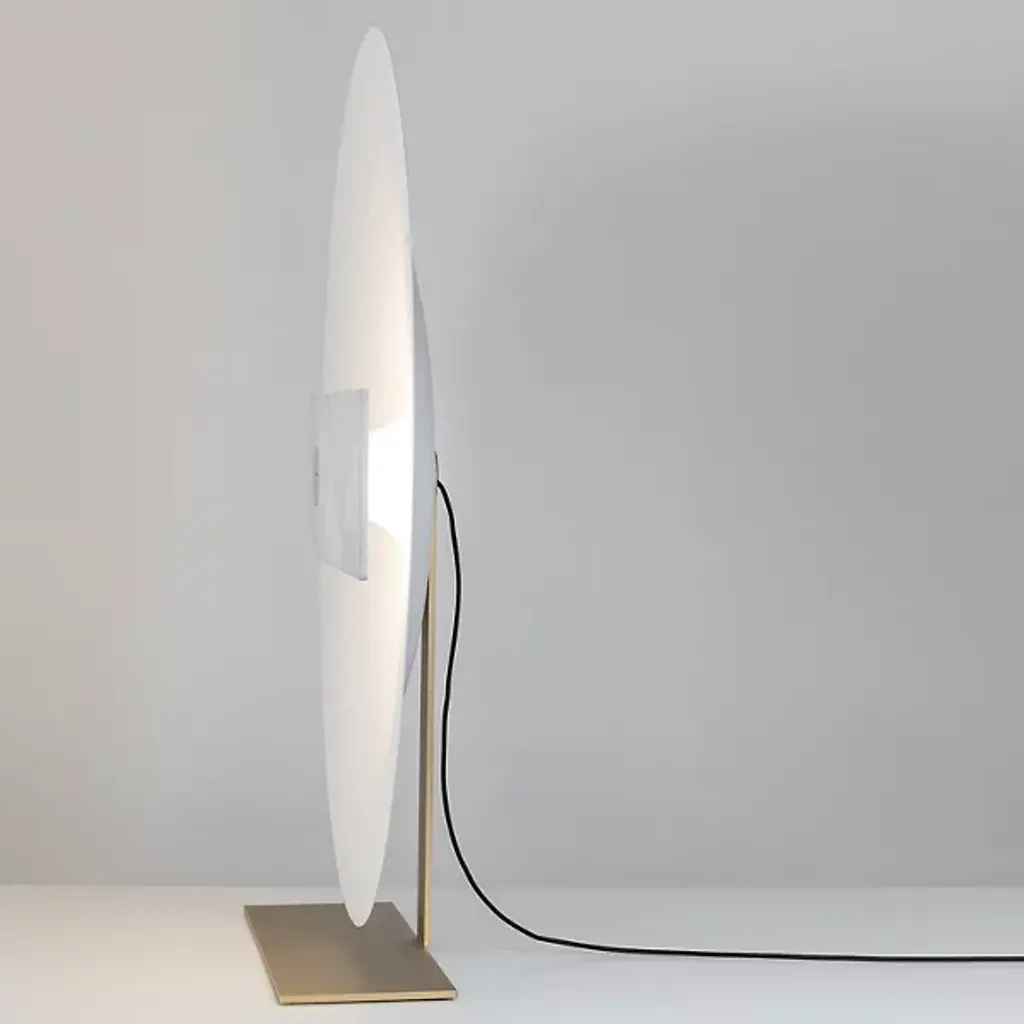 The Meridiana LED Floor Lamp by Hind Rabii takes inspiration from the sundial. It features a large disk representing the sun, which casts light through a clock-hand-like panel, creating a dramatic interplay of light and shadow. Handcrafted by skilled artisans in Verviers, Belgium, each chandelier is meticulously produced and undergoes multiple quality inspections to ensure superior craftsmanship. This elegant, artistic design adds a sophisticated, modern touch to any space, offering stunning visual appeal and functional illumination.