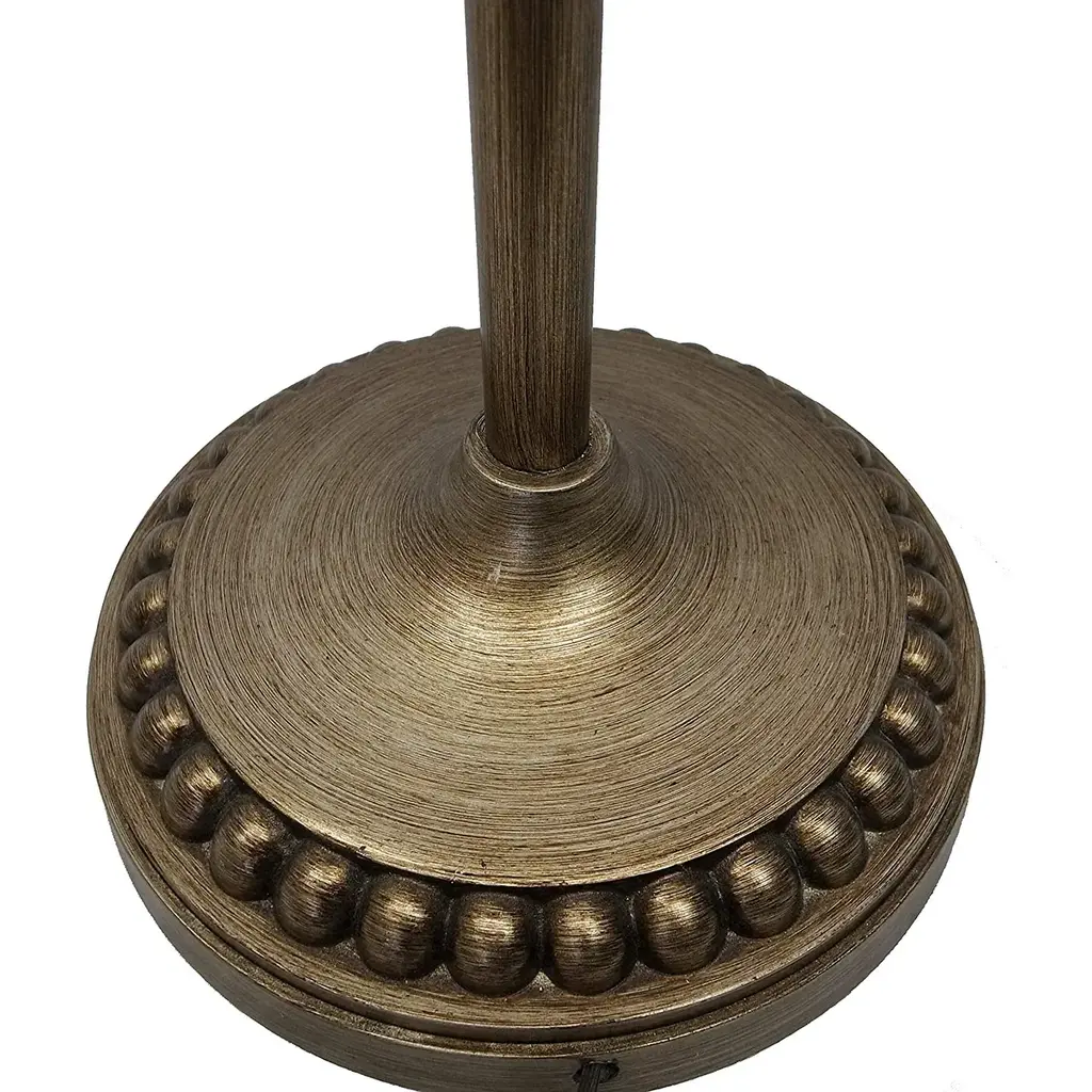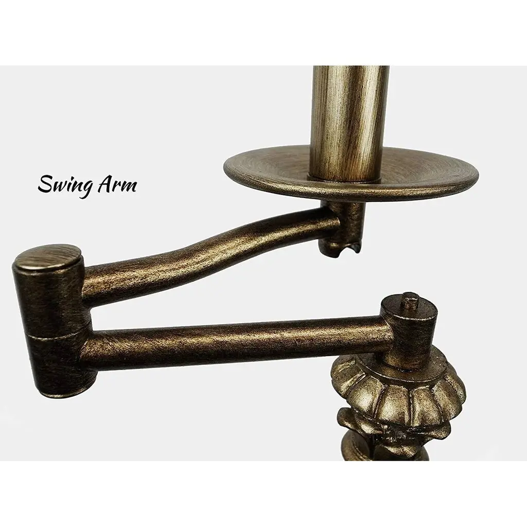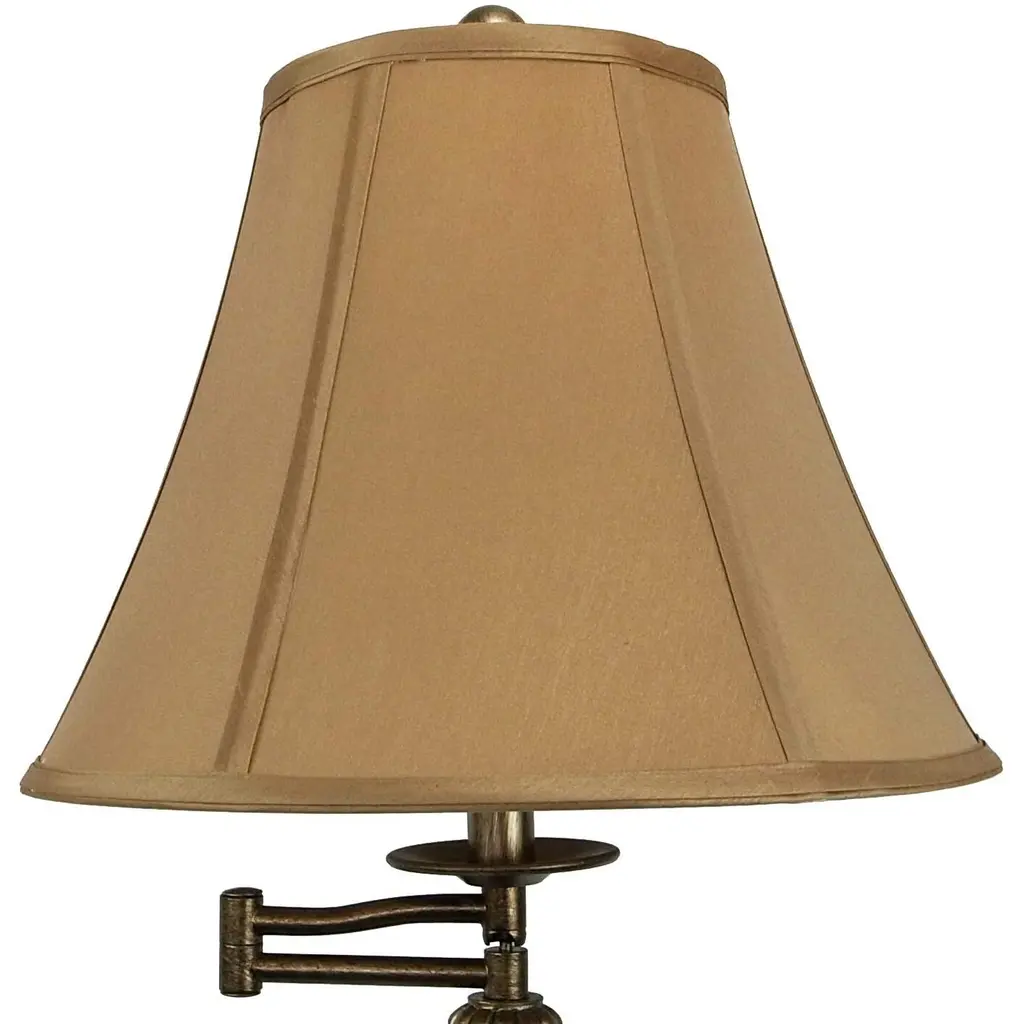 This traditional swing arm floor lamp has a refined and graceful line accented with a subtle swirl font.Ideal for reading and task lighting, this swing arm floor lamp is the perfect marriage of form and function. It features traditional styling with subtle details like a swirling font. Comes in a painted rustic brass finish. The adjustable swing arm is topped with a faux silk shade.