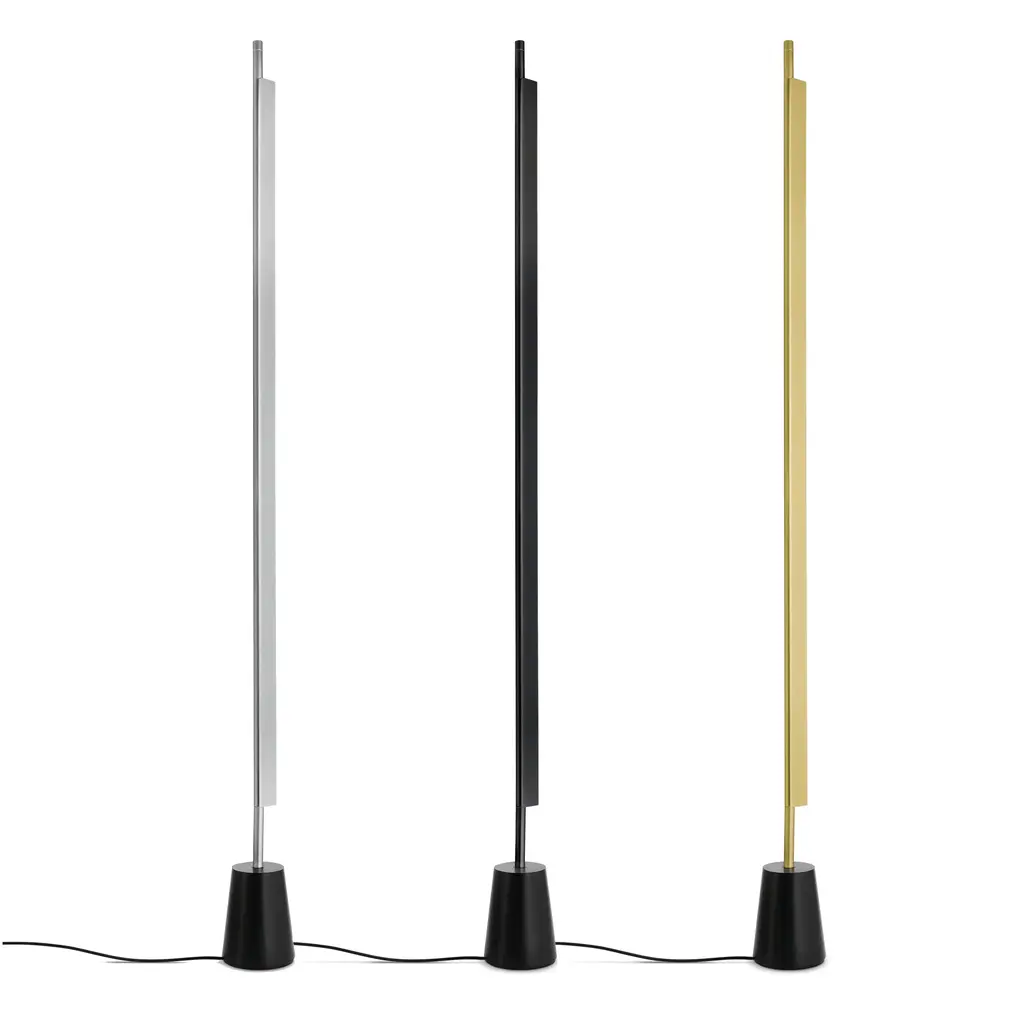 The Compendium Metal Bar Floor Lamp by Luceplan combines sleek design with high functionality, featuring a rotating body that directs light effortlessly toward the wall for a soft, ambient glow. Constructed with a extruded aluminum body and a die-cast zinc alloy base, this lamp brings sophistication to any space. Available in two color temperature options, it offers adaptable lighting tailored to your preference. The black base and in-line foot dimmer enhance convenience and allow easy adjustments to brightness.