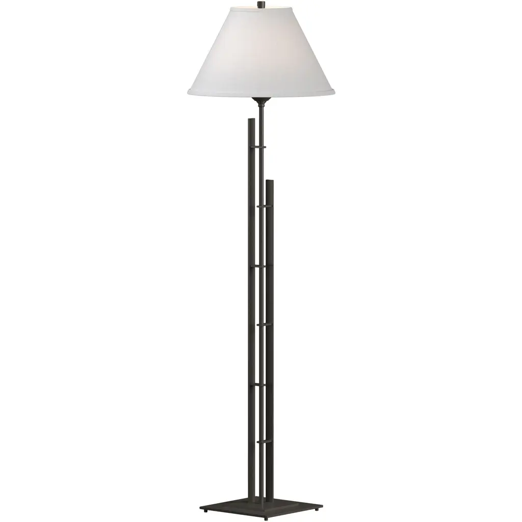 Clean lines are no-nonsense in the Metra Double Floor Lamp by Hubbardton Forge. Straight forward and to the point in design and function, this lamp offers soft light and style to any space. Channeling an Asian-style influence, the asymmetrical design appears to resemble skyscrapers reaching up into the sky. Create an intimate and calming environment to surround yourself with the warming illumination cast from the Metra Double.Hubbardton Forge lighting is handcrafted in Vermont, USA by highly skilled artisans. Every lamp is made-to-order and handmade using environmentally friendly metal forging techniques. Powder coatings and aqueous metal cleaning are used in the production of every lamp.Shown in Black finish with Natural Anna shade