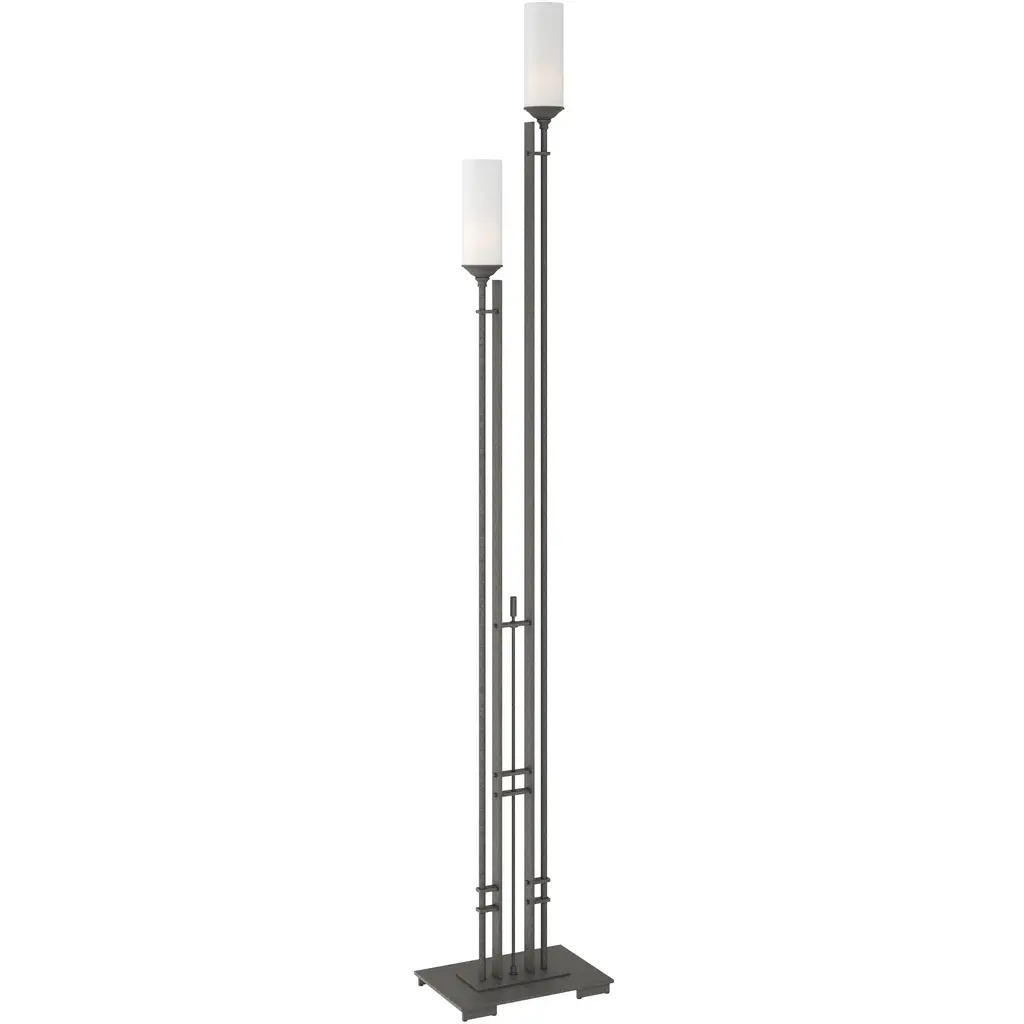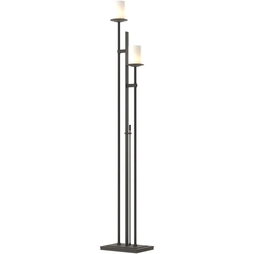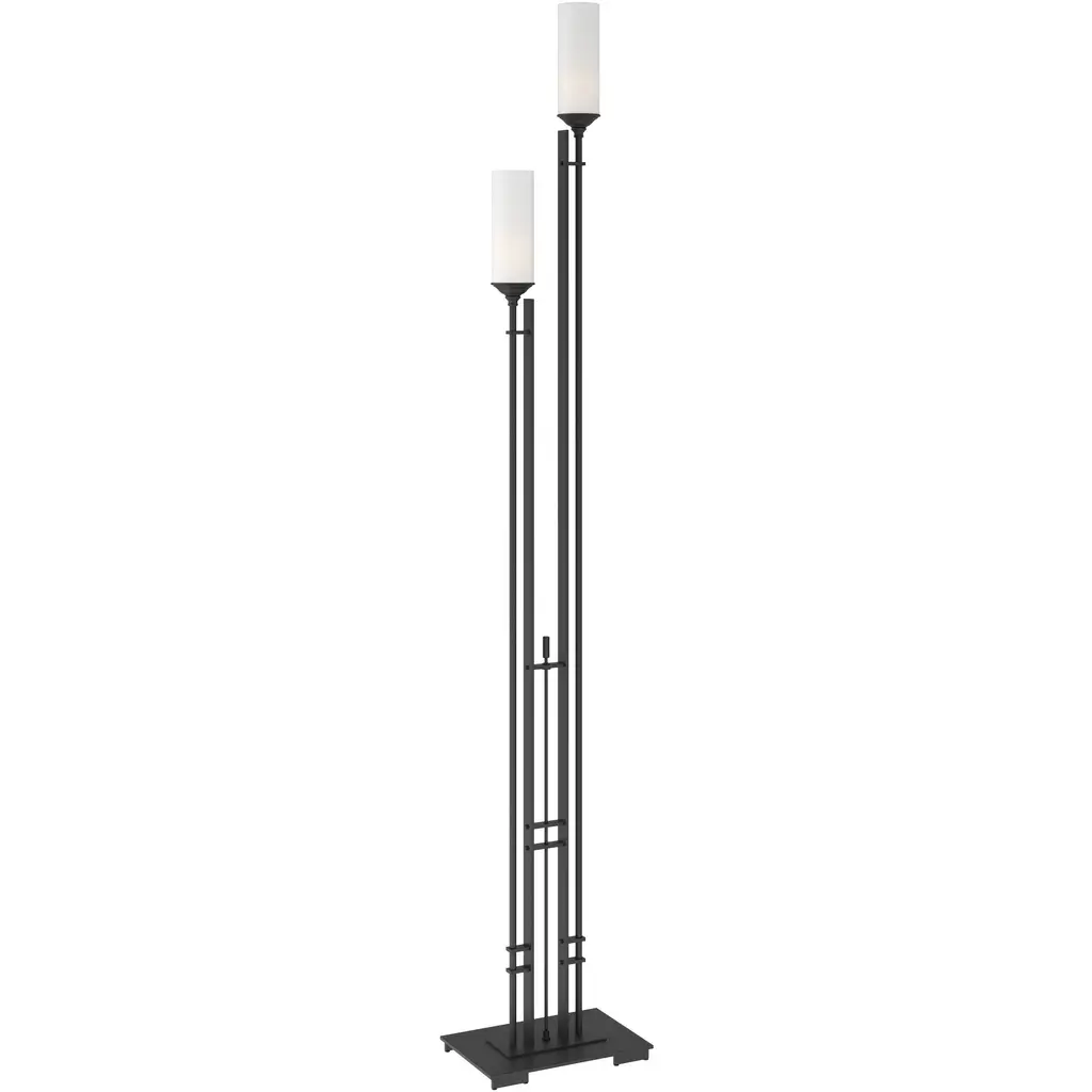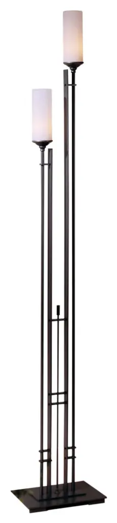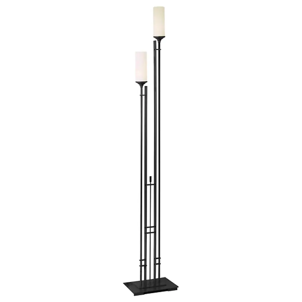 Double down on elegant style and sturdy construction. The Metra Twin Tall Floor Lamp by Hubbardton Forge creates inviting illumination while adding an elegant design element with the organic appeal of handcrafting. The piece features 2 stems of differing heights, each fashioned from Hand Forged Wrought Iron and extending from a wide rectangular canopy for a stable foundation. At the top of each frame rests a cylindrical shade in Hand Blown Glass, diffusing the fixture’s light warmly across the room.