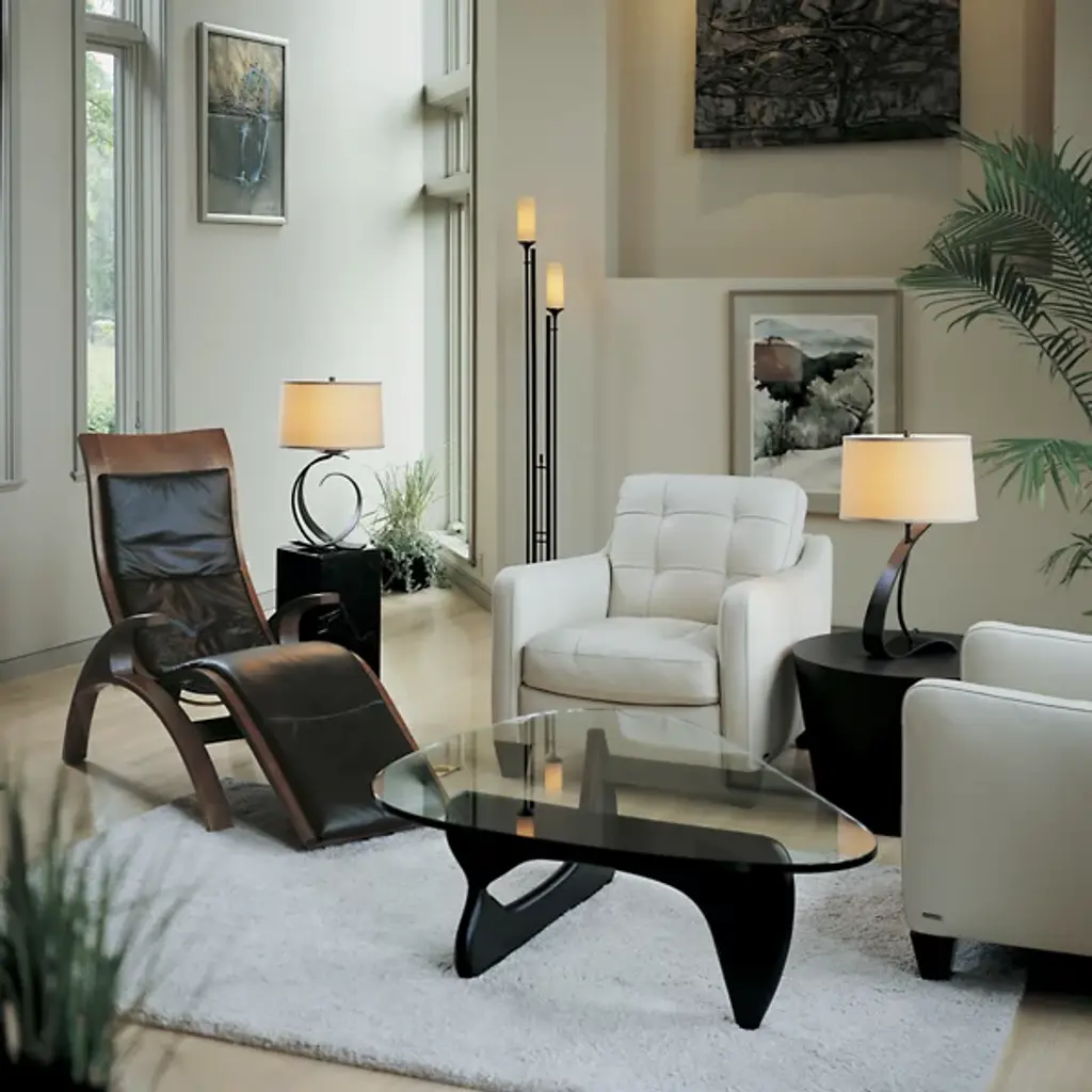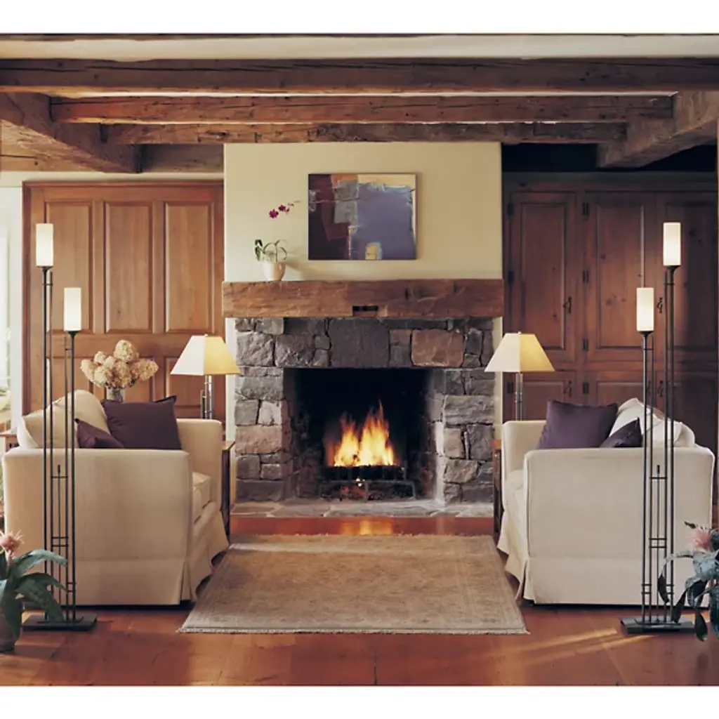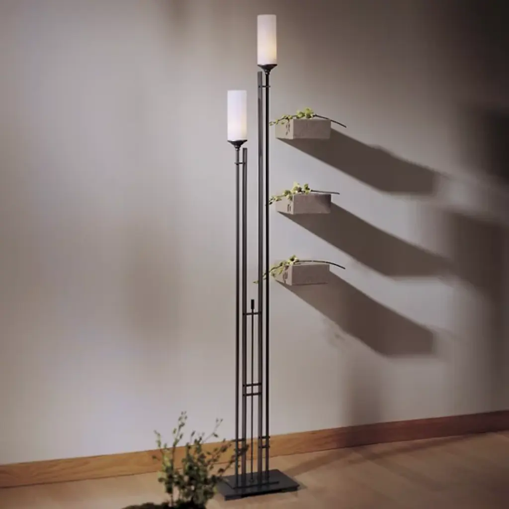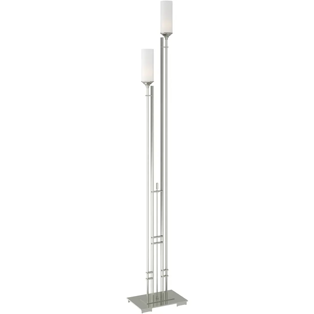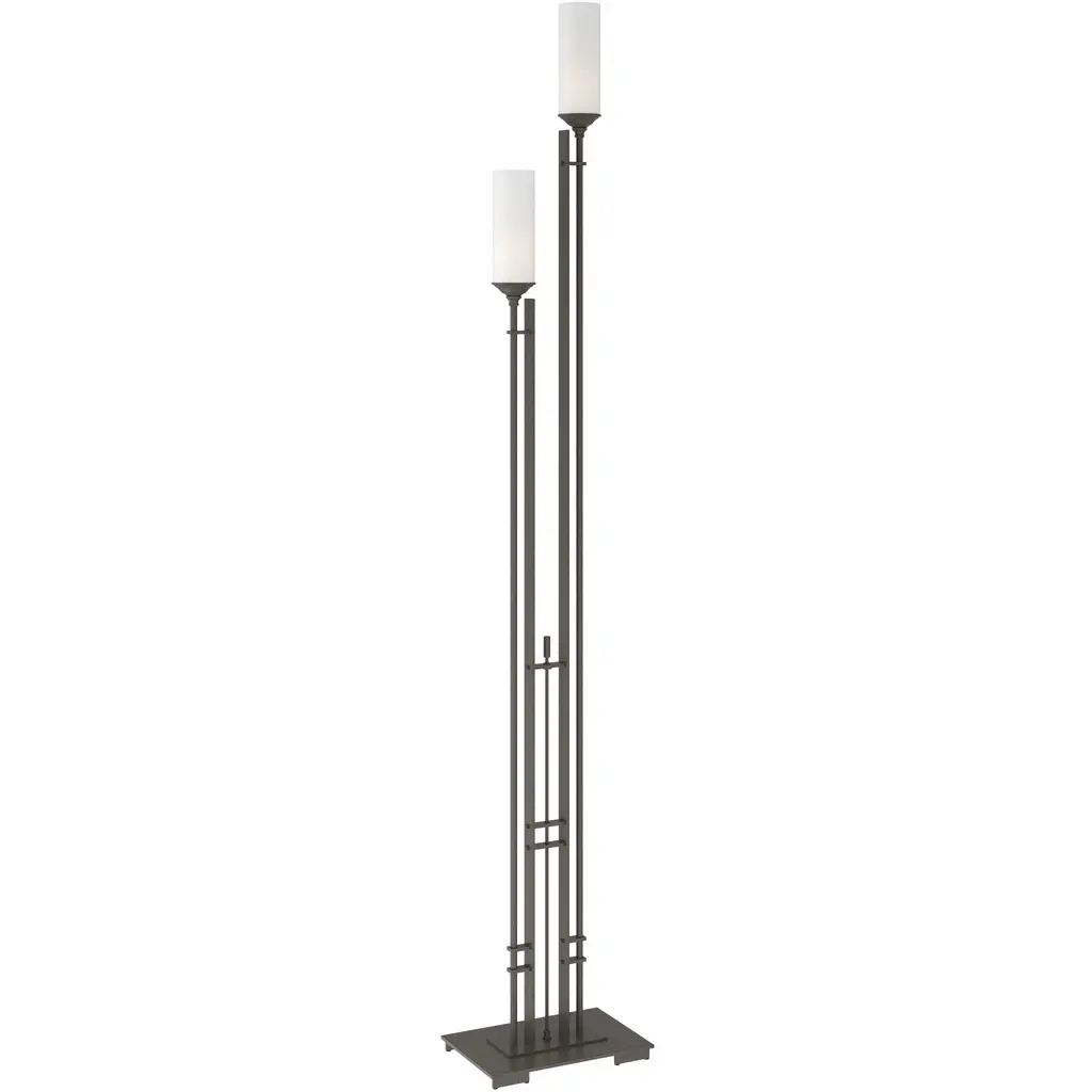 Double down on elegant style and sturdy construction. The Metra Twin Tall Floor Lamp by Hubbardton Forge creates inviting illumination while adding an elegant design element with the organic appeal of handcrafting. The piece features 2 stems of differing heights, each fashioned from Hand Forged Wrought Iron and extending from a wide rectangular canopy for a stable foundation. At the top of each frame rests a cylindrical shade in Hand Blown Glass, diffusing the fixture’s light warmly across the room.