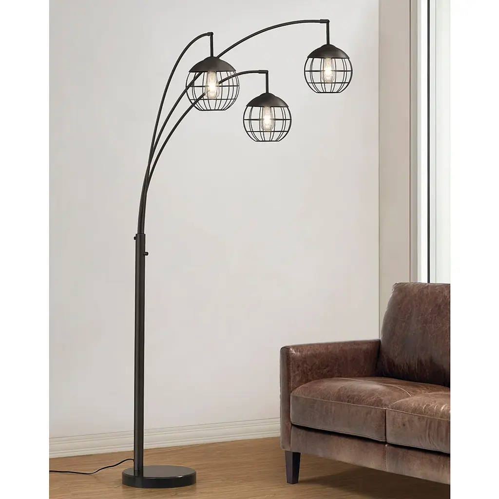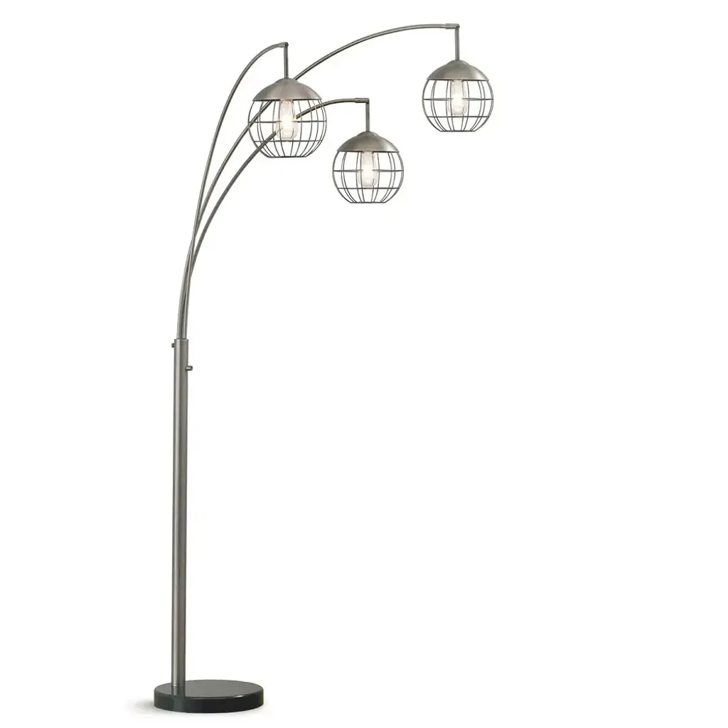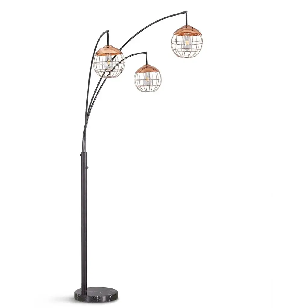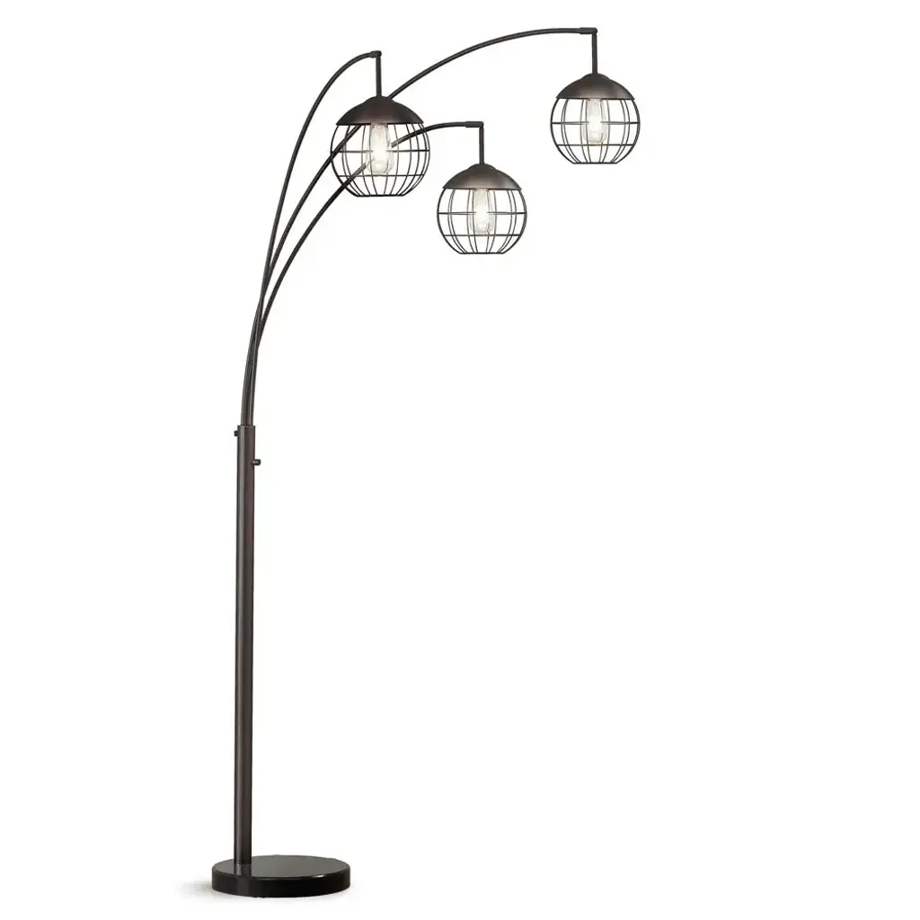 Add a charming touch to your living space with this modern and elegant Metro 3-light Wire Shade LED Dimmable Arch Floor Lamp. Featuring three swivel arches with globe-shaped wired shades, this lamp offers a playful yet sophisticated design. The lamp includes a rotary dimmer switch and vintage-style LED Edison bulbs for added convenience. Choose from metal grey, espresso bronze and copper, or espresso bronze finish options to match your decor.Features: