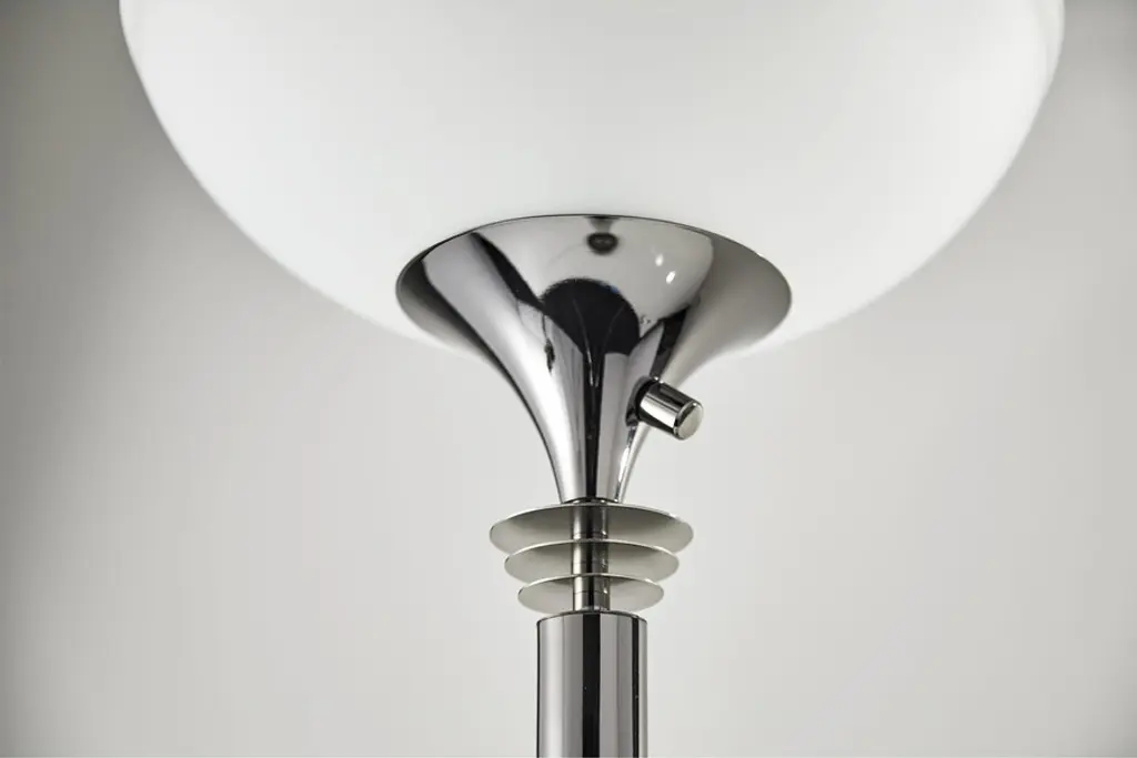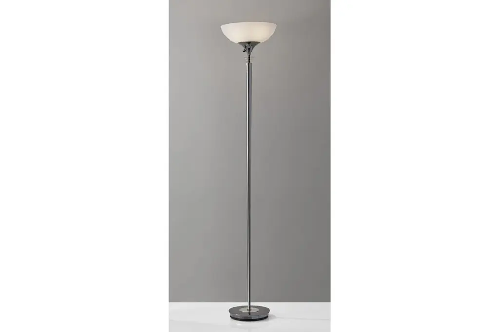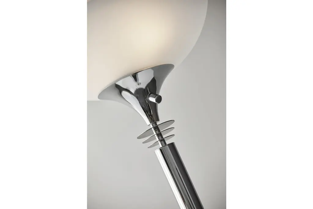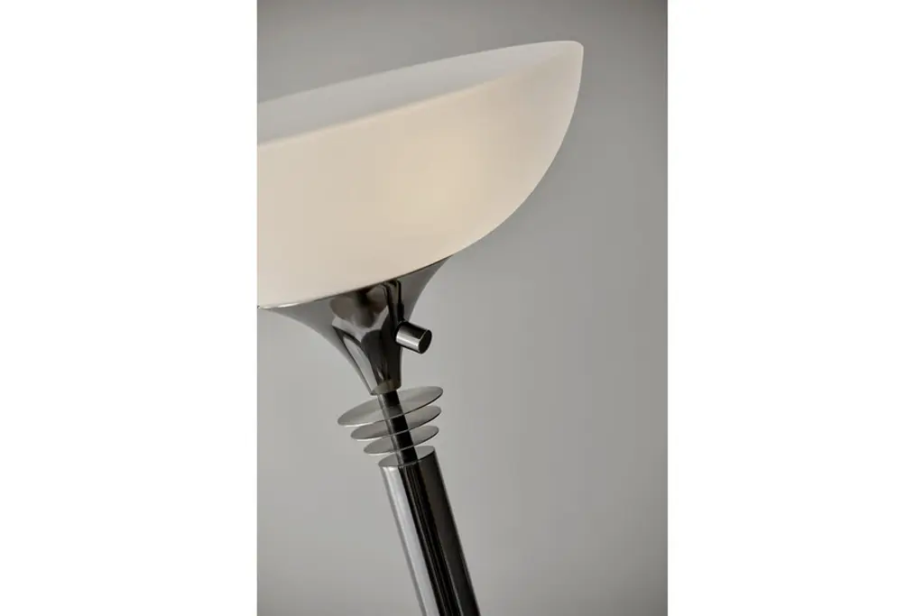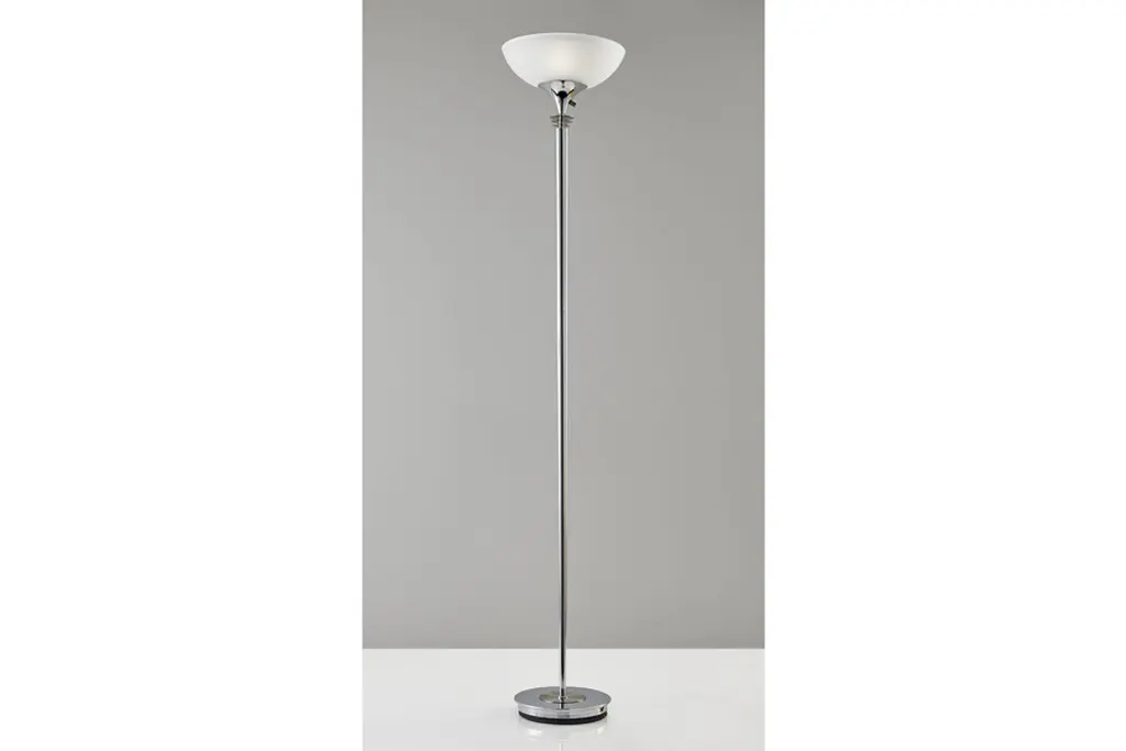 If you enjoy Art Deco, then let your lighting reflect that! With the Metropolis Floor Lamp by Adesso, youll have a combination of crisp, clean lines in your choice of sleek, chic finishes, and contoured curves in a frosted-glass bowl-shaped shade. Featuring adjustable illumination, Adessos Metropolis Floor Lamp is always an eye-catching additionon or offthanks to the always engaging and inimitable appearance of the Art Deco aesthetic.Shade: 14"diameter x 4"h