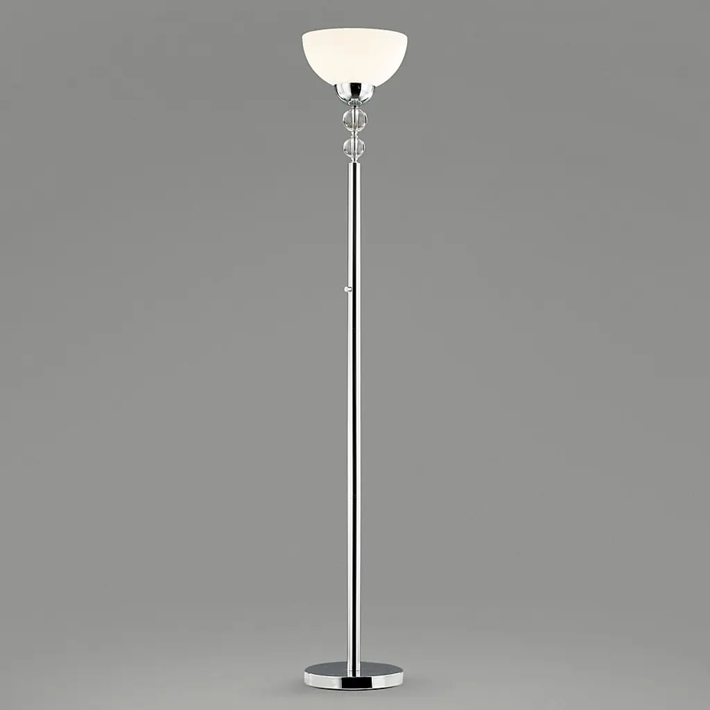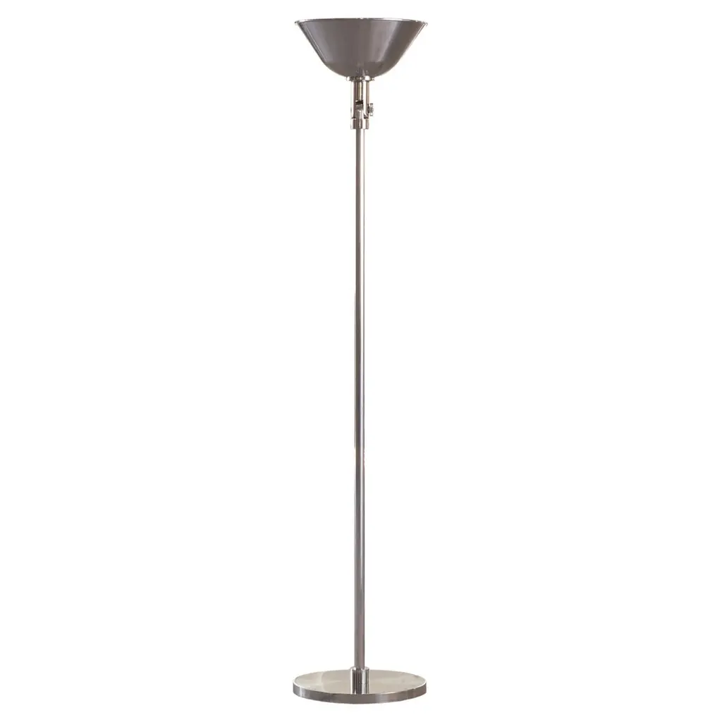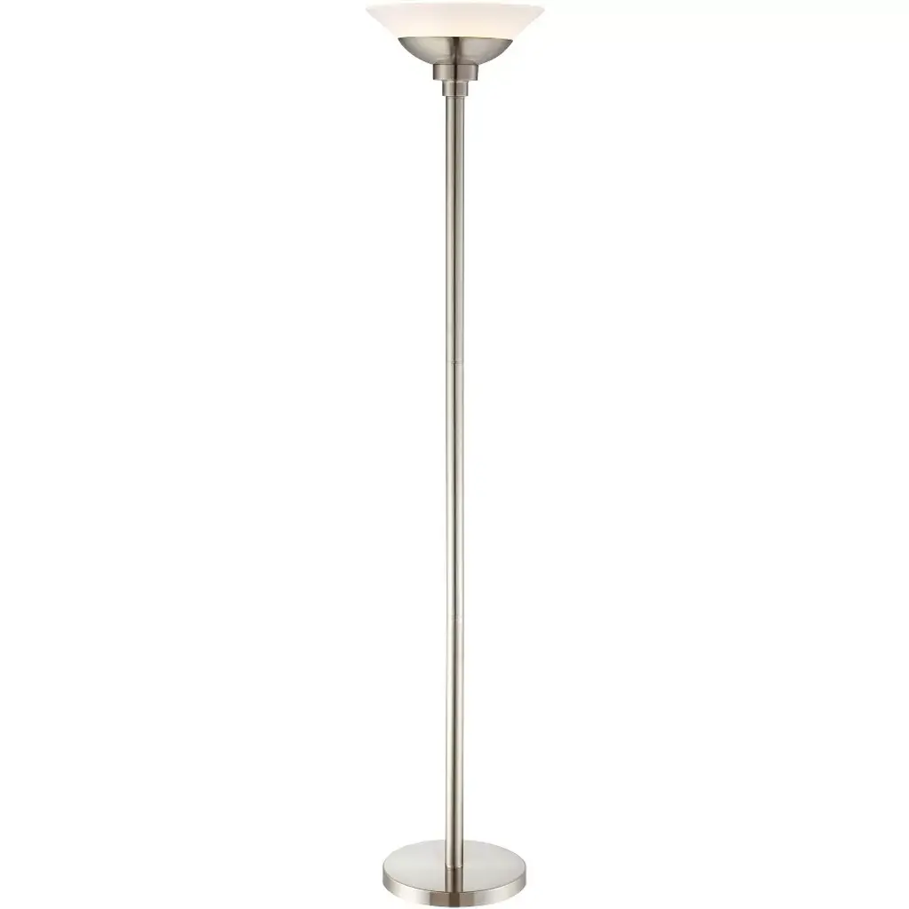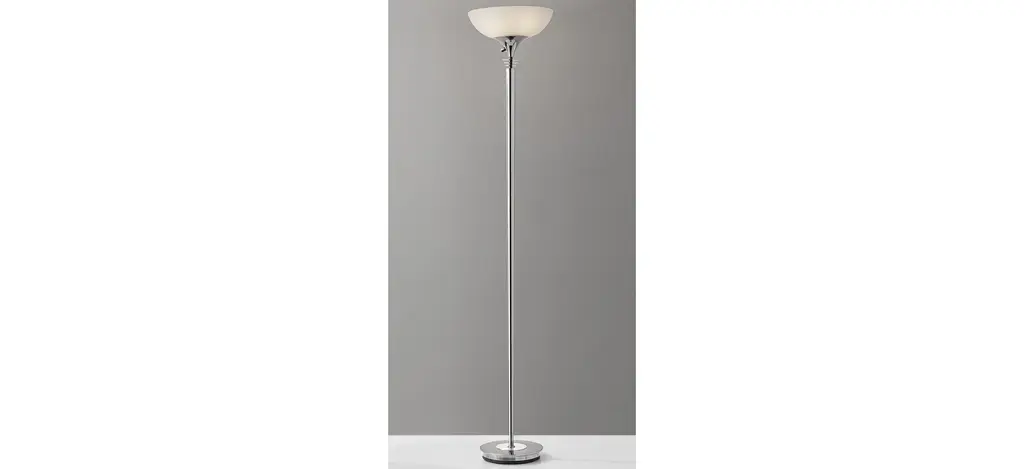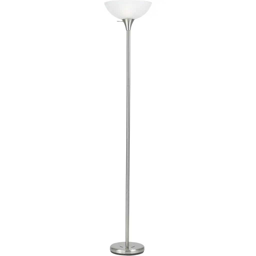 The Metropolis Floor Lamp is a sleek, contemporary style with a dramatic brushed steel finish and elegant frosted glass bowl shade. An Adesso patented 300 Watt Double Socket construction allows for two crisscrossed sockets, each holding on/off 150 Watt incandescent or LED bulbs which provides approximately 3 times more light than a typical torchiere. A simple high/low rotary switch is located on the shade cup to adjust the brightness. This lamp has a black cord and is smart outlet compatible. Bulbs are not included.